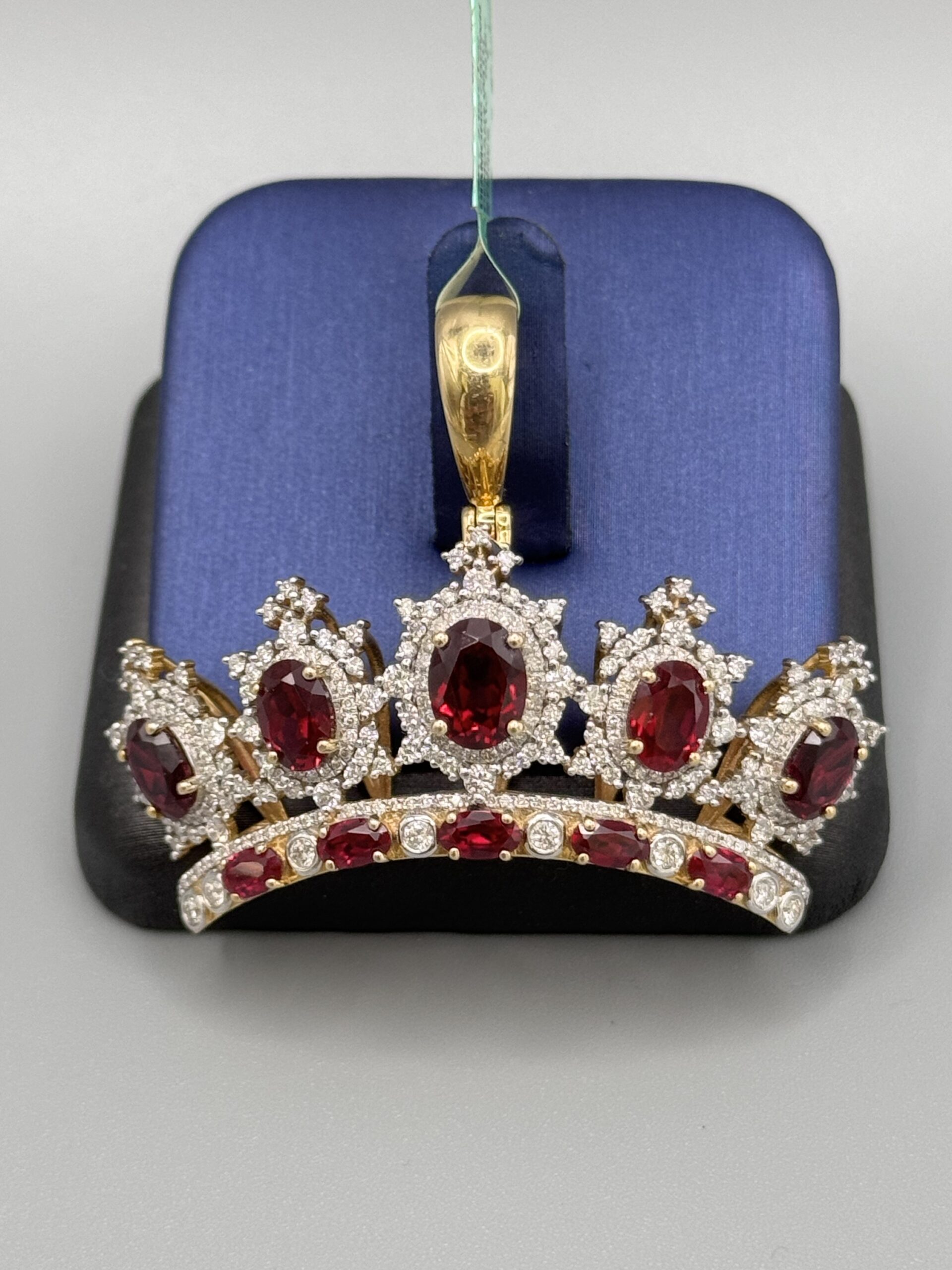Adorn yourself with this regal 14KT Gold Queen Crown Pendant! Boasting 2.00CT of diamonds and rubies, it’s a dazzling 2″ x 1.5″ masterpiece weighing 13.7 grams—fit for royalty!