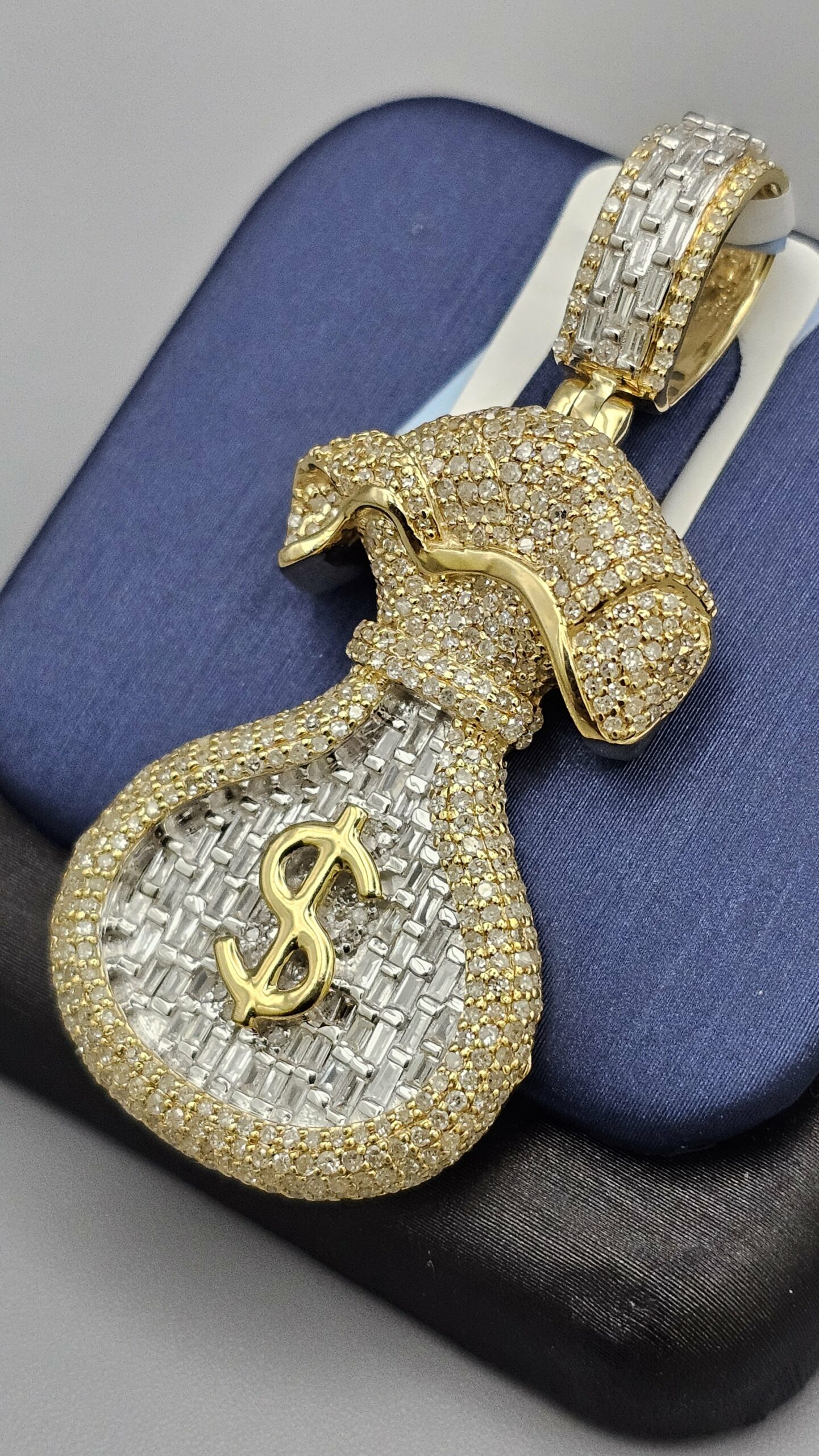 14KT Gold 2.07CT Diamond Money Bag Pendant Qoth Baguette Diamond 2″ Tall aby 1″ Wide CagedBack Approx Gold Weight 13.15 Gram