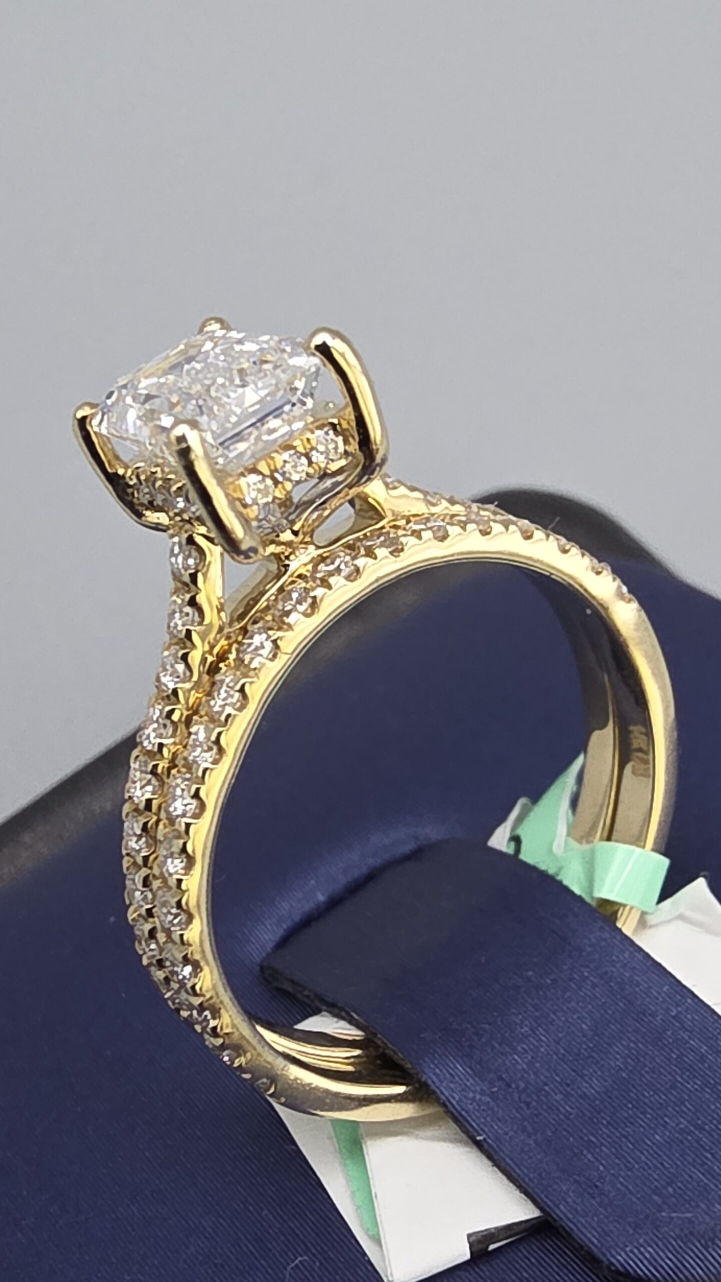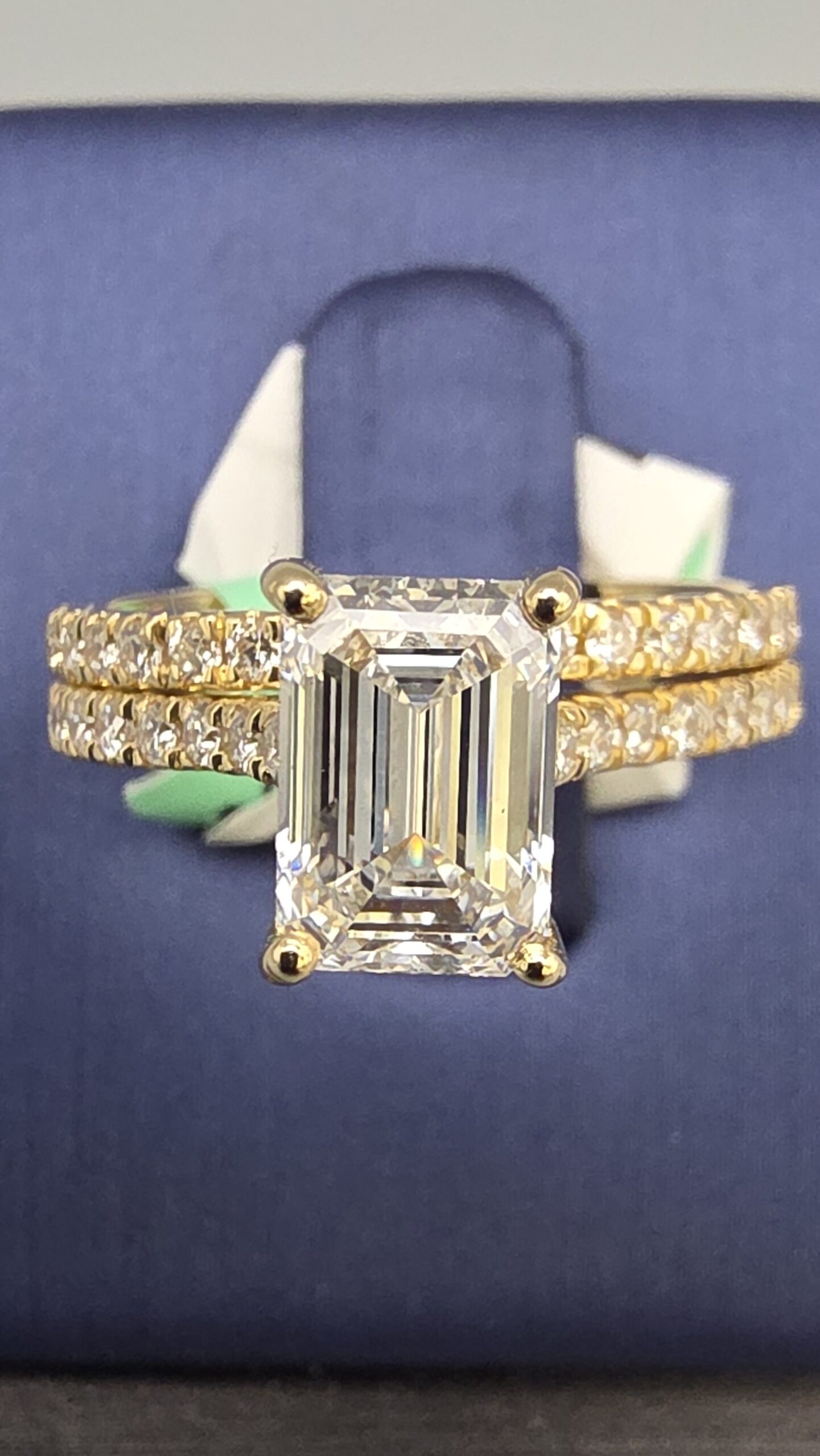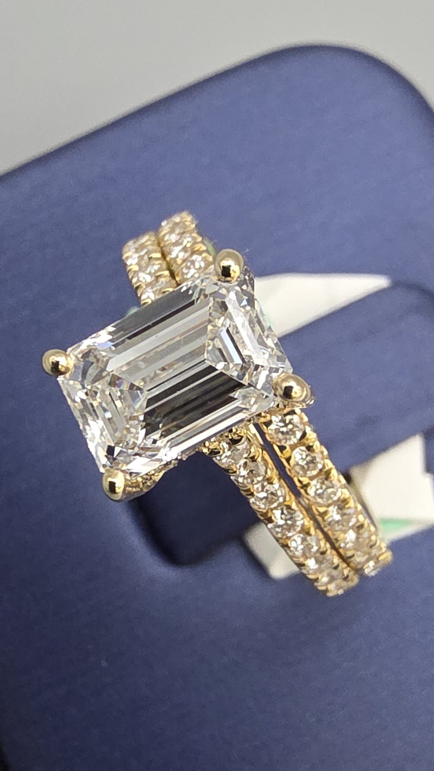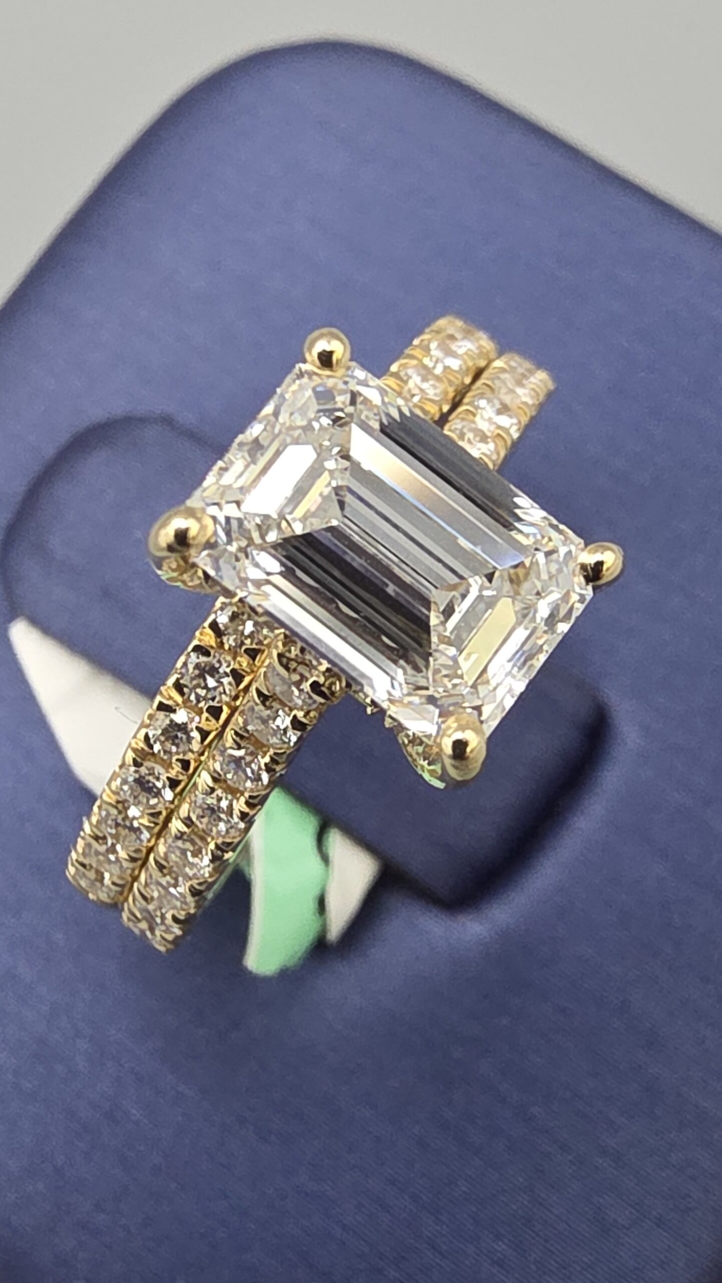 Pop the question with flair! This 14KT Gold engagement ring boasts a stunning 2.5CT center solitaire and a mesmerizing 2.14CT Emerald cut LGD. With VS clarity and E-F color, it’s certified love!
