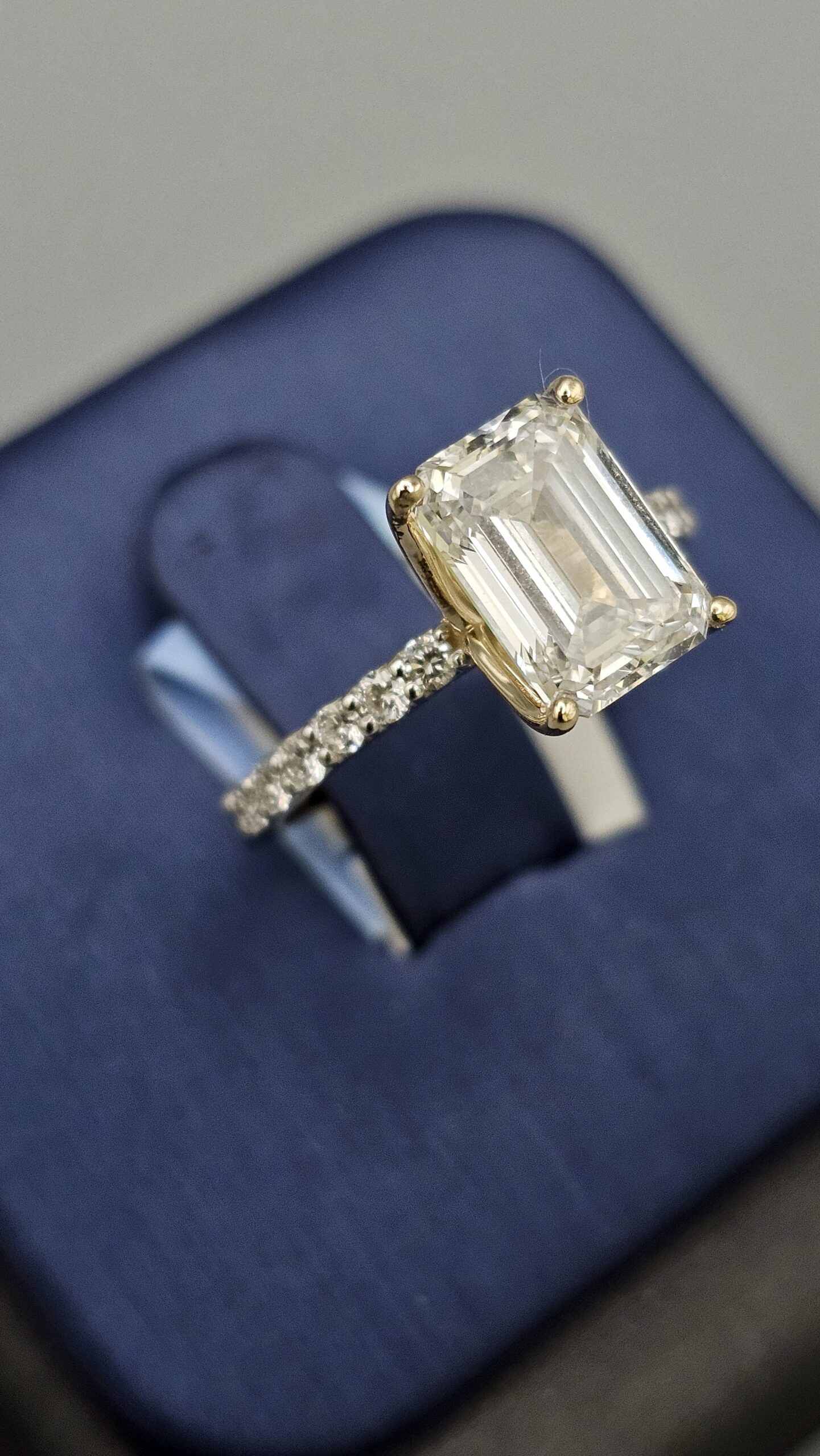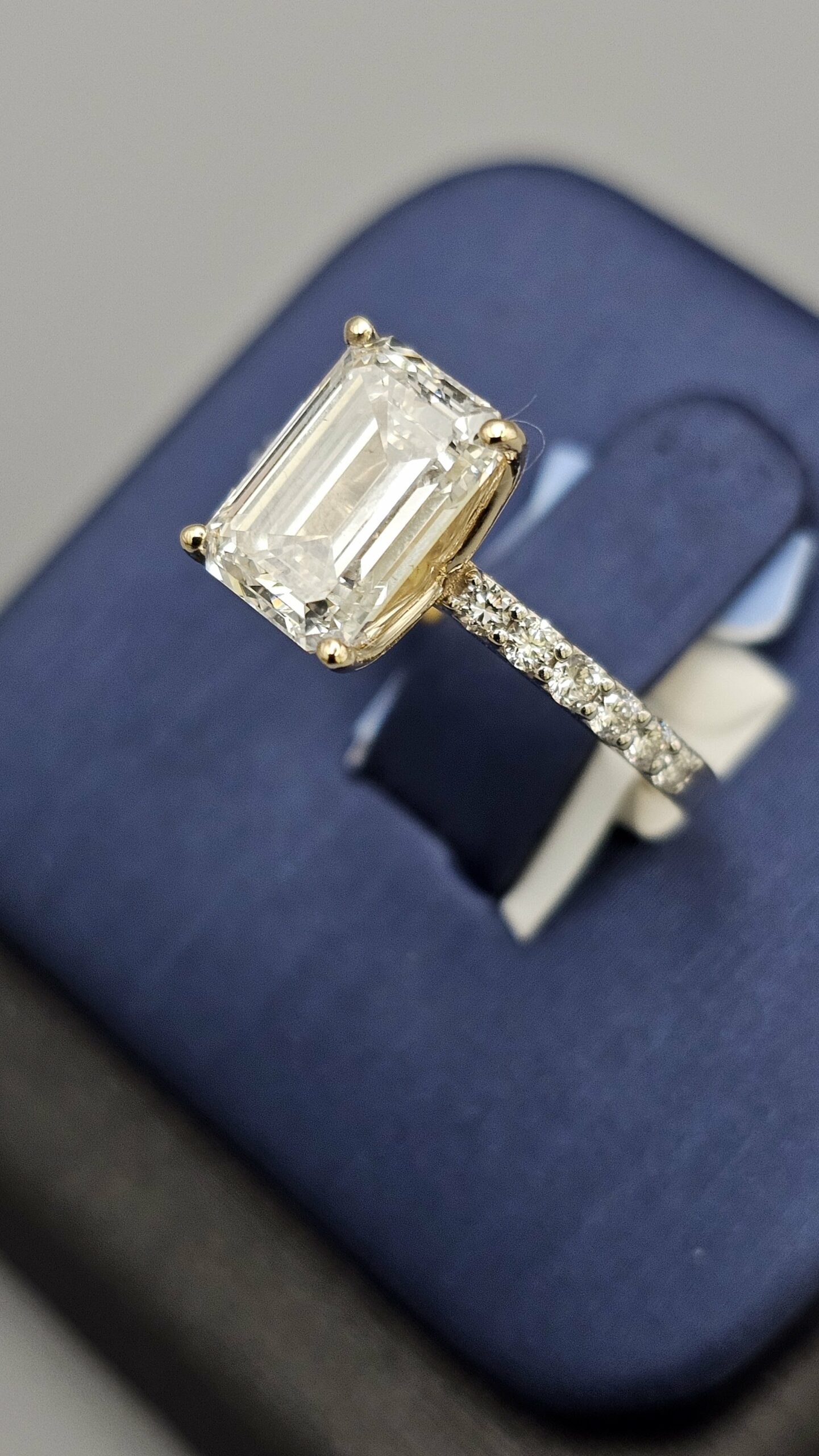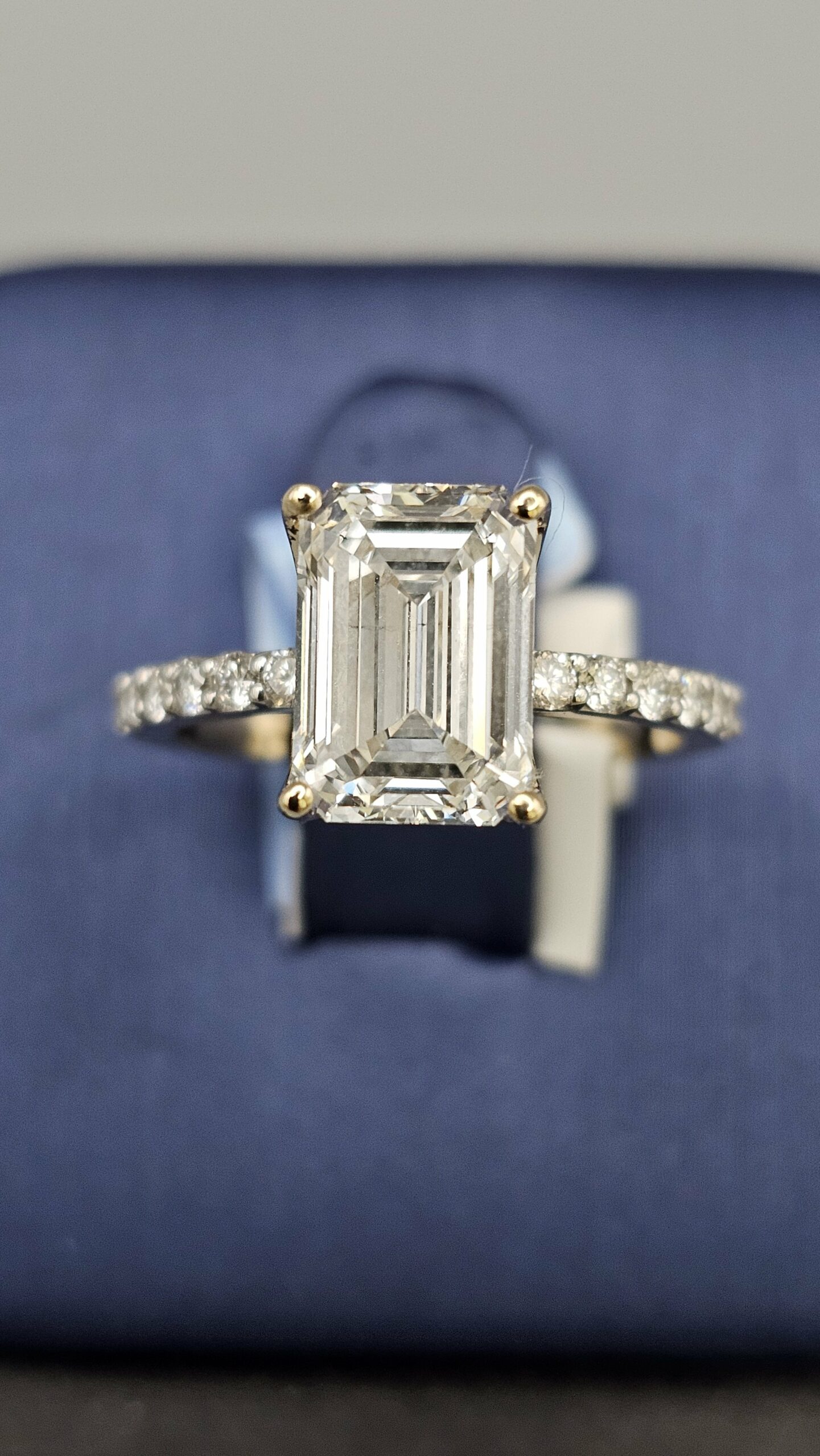 This stunning 14KT gold engagement ring features a 3.00CT emerald-cut diamond with VS clarity and F color. Center solitaire is 2.94CT. Comes with a certificate and sizing available for perfect fit.