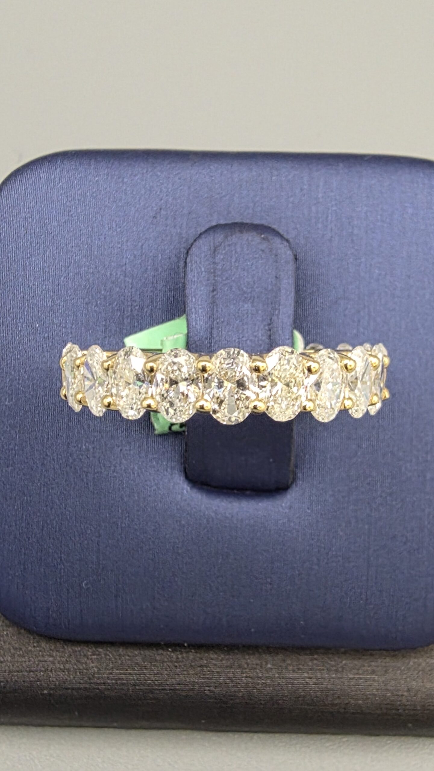 Celebrate your love with this dazzling 14KT Gold wedding band. Featuring a stunning 3.00CT oval LGD centerpiece, it boasts 20 pointers of VS clarity and E-F color, weighing approximately 4.3 grams.
