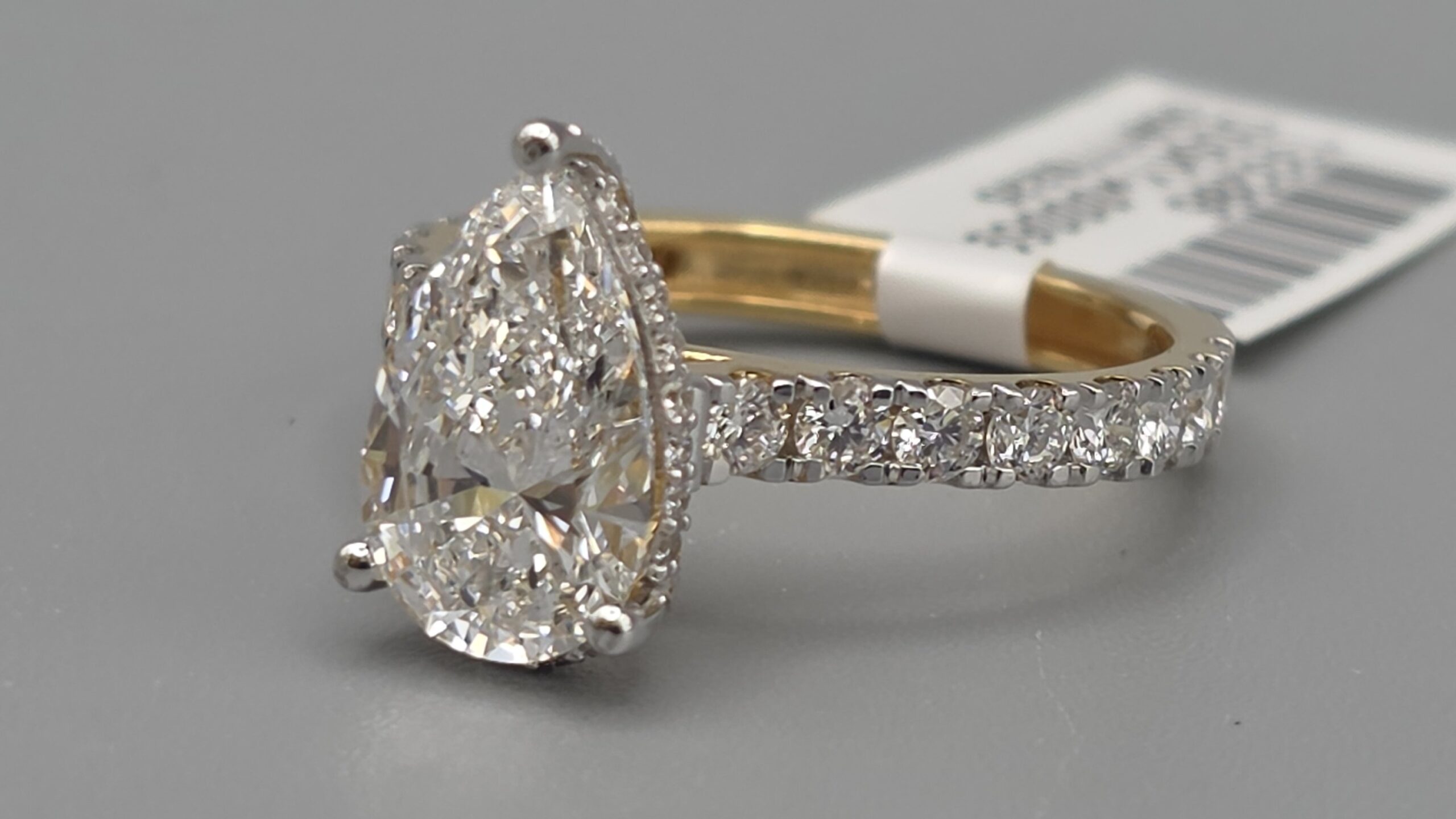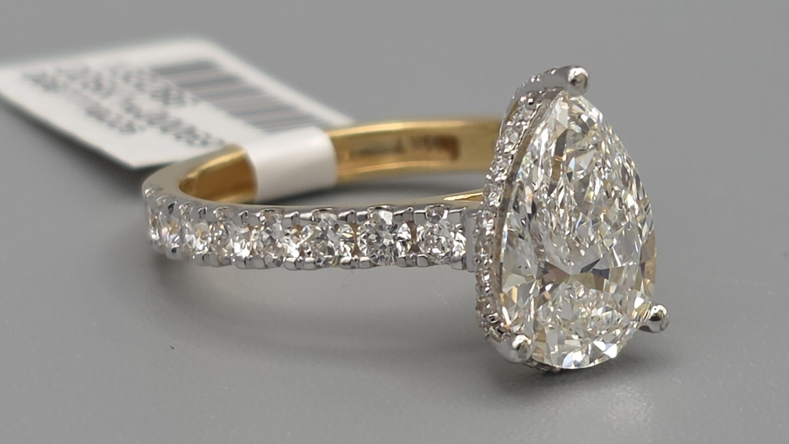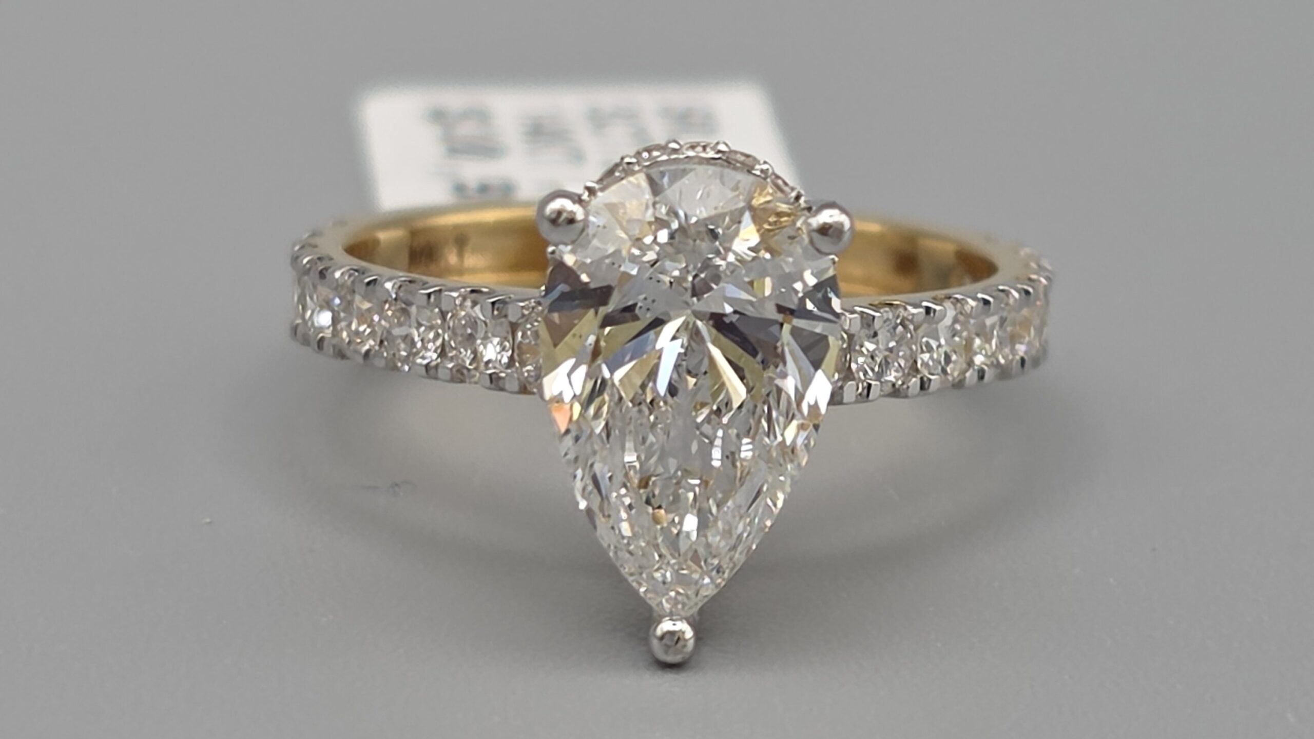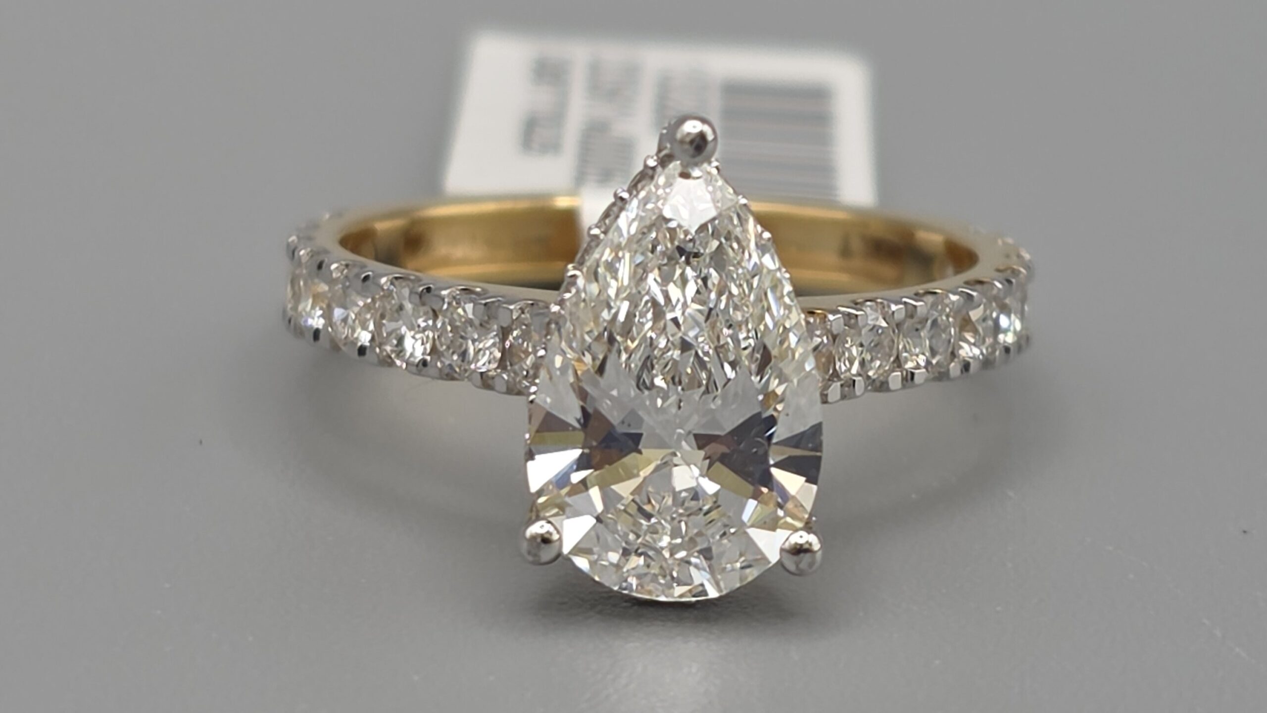 Sparkle like never before with this stunning 14KT Gold 3.02CT Pear Shape LG Diamond Solitaire Ring. Featuring a 2.00CT flawless center gem (VS clarity, E-F color), it’s perfect for your size 7 finger. Certificate included!