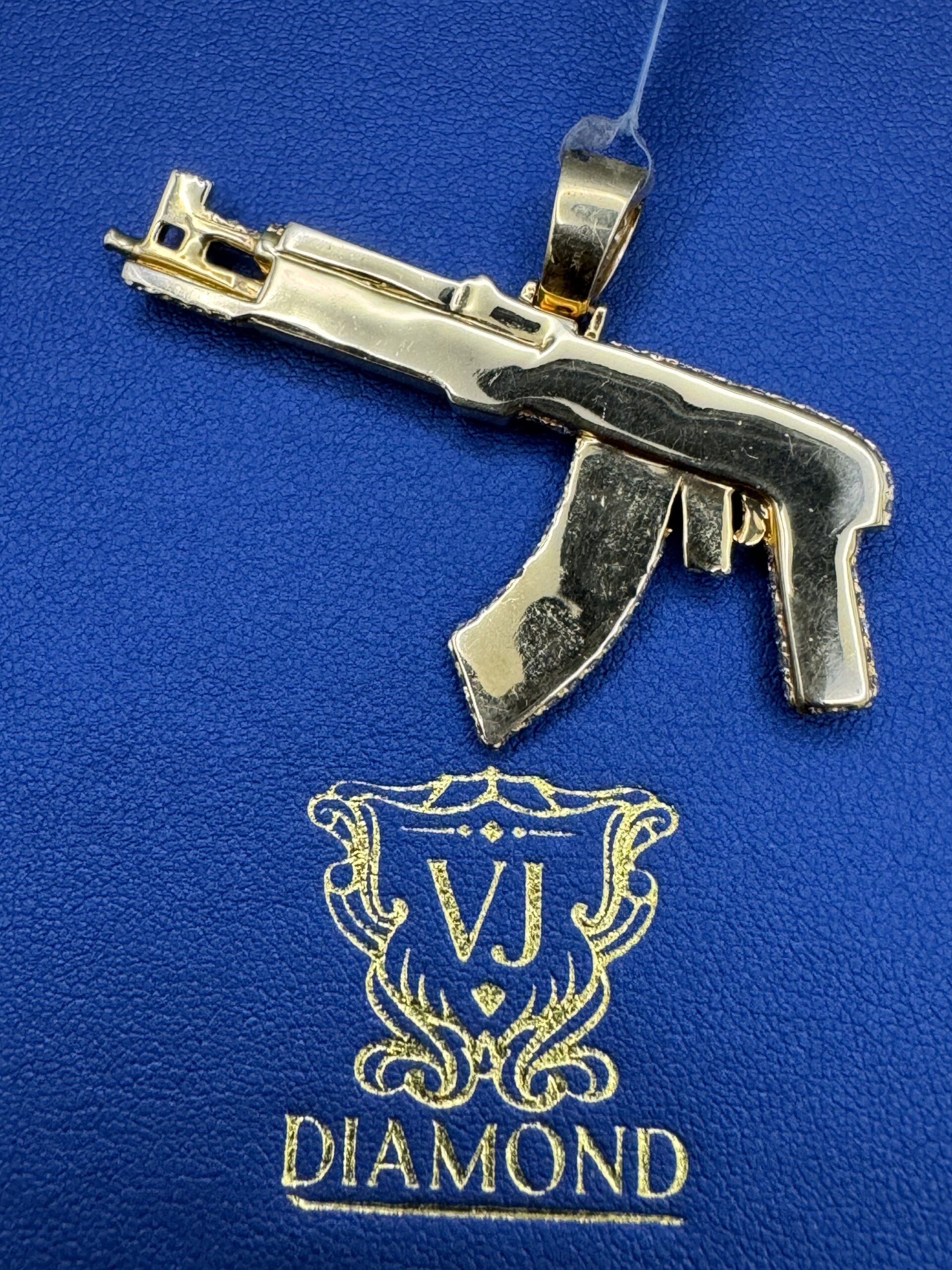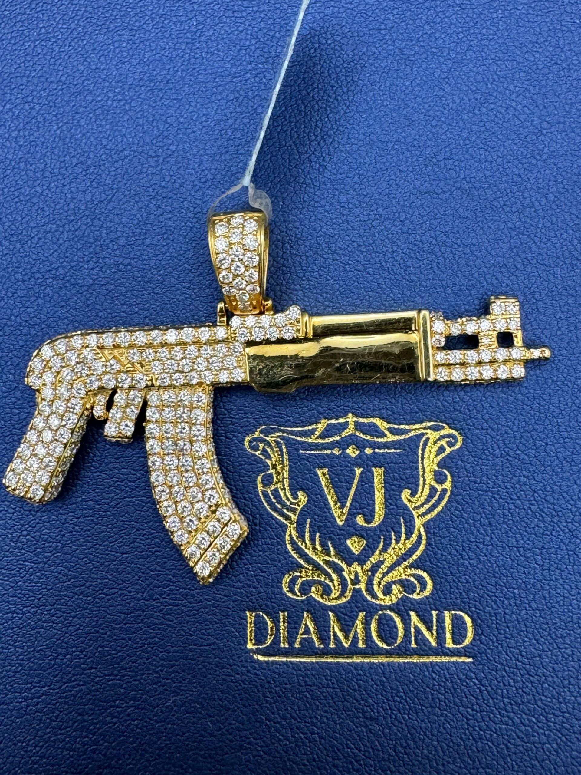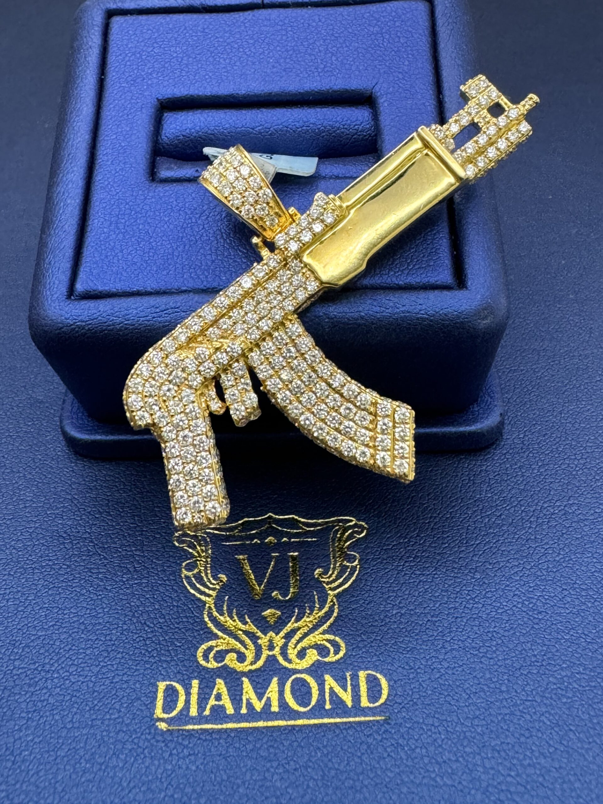 14KT Gold 3.20CT Diamond AK-47 Pendant Custom Made Approx Gold Weight 19.4 Gram 2.25″ Wide By 1.5″ Tall VS Quality Diamonds