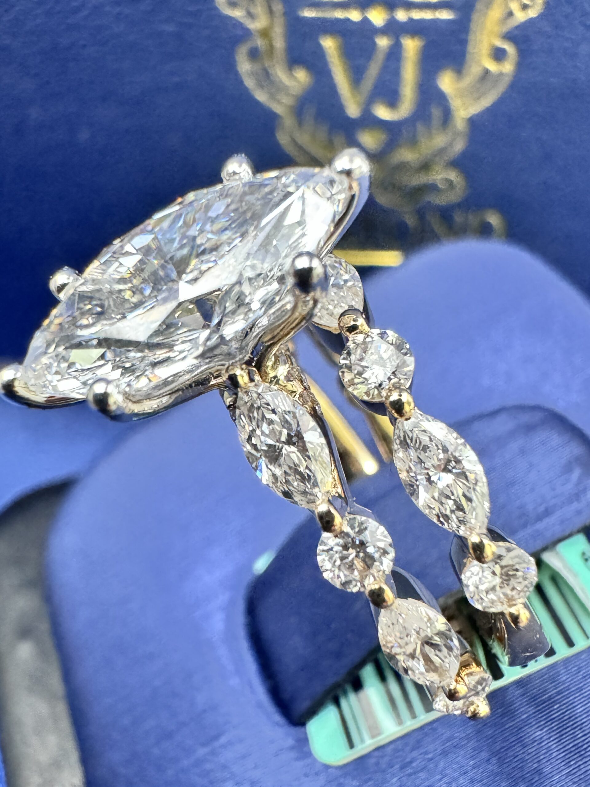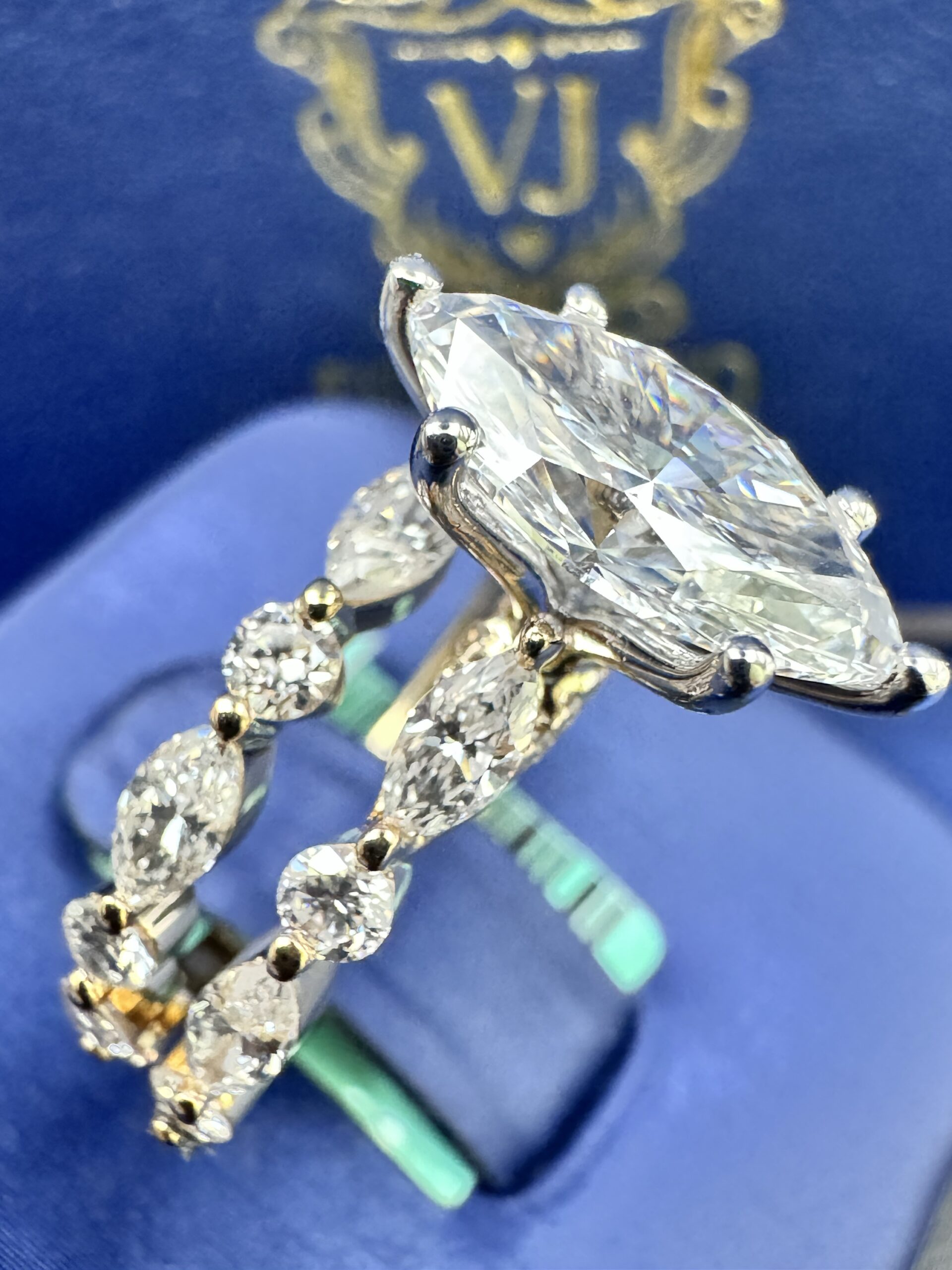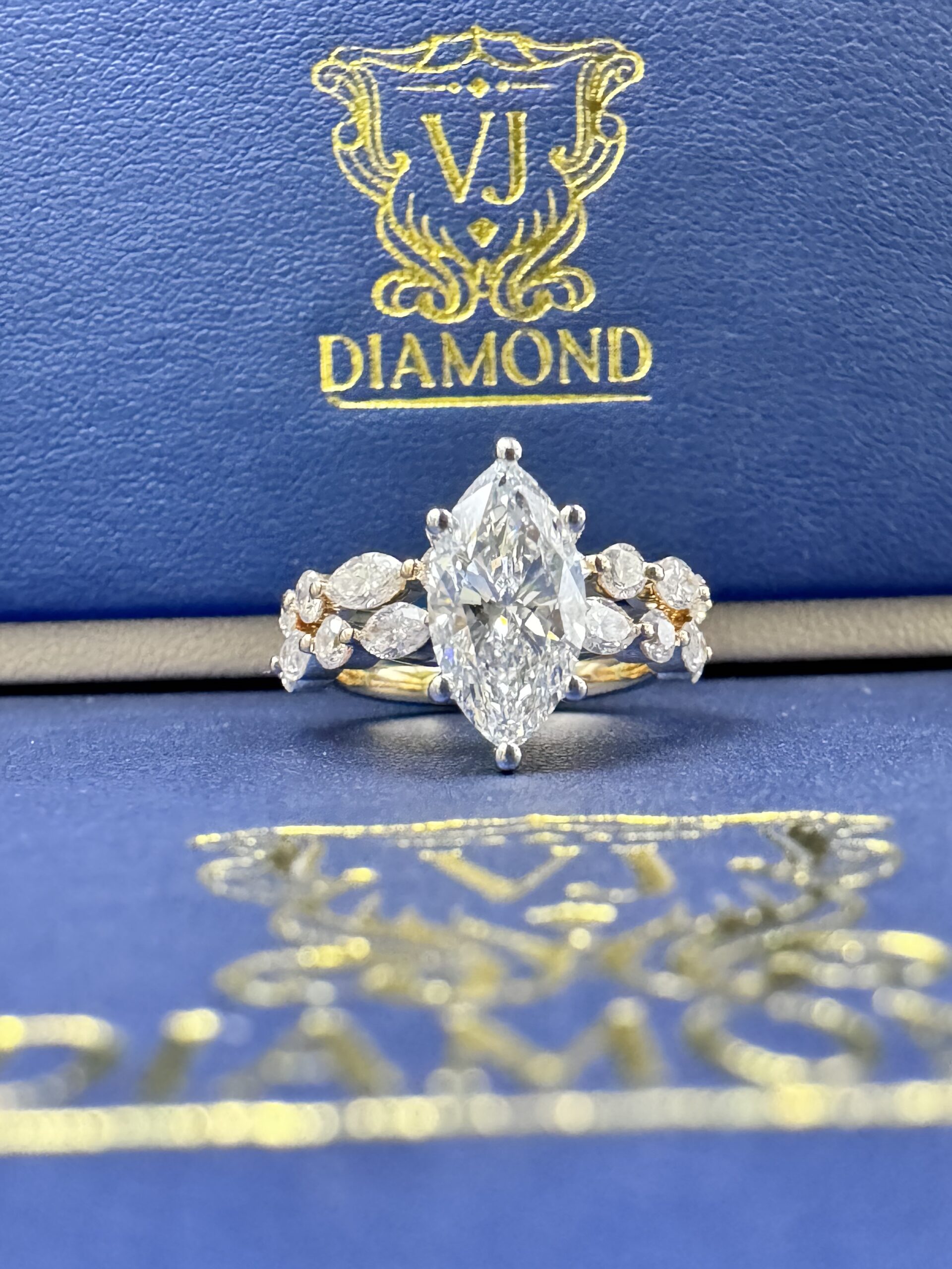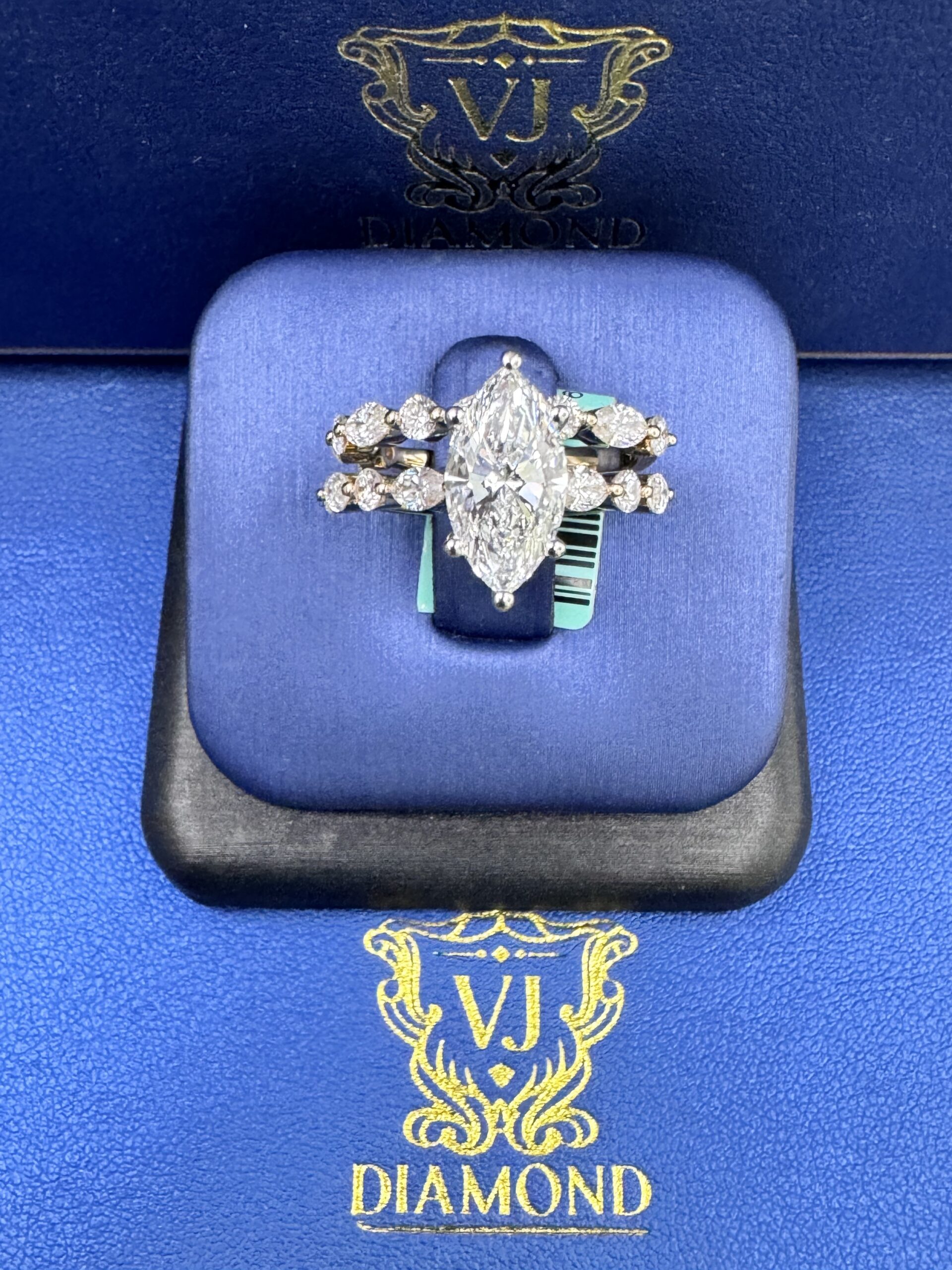 14KT Gold 3.65CT LabGrown Marquee Cut Bridal Ring Custom Made Center Solitaire 2.06CT VVs Clarity F Color Size 7 Marquees N RoundCut Round ProngSet Diamonds Wedding Band Certified F Color Sizing Available Approx Gold Weight 6.6 Gram