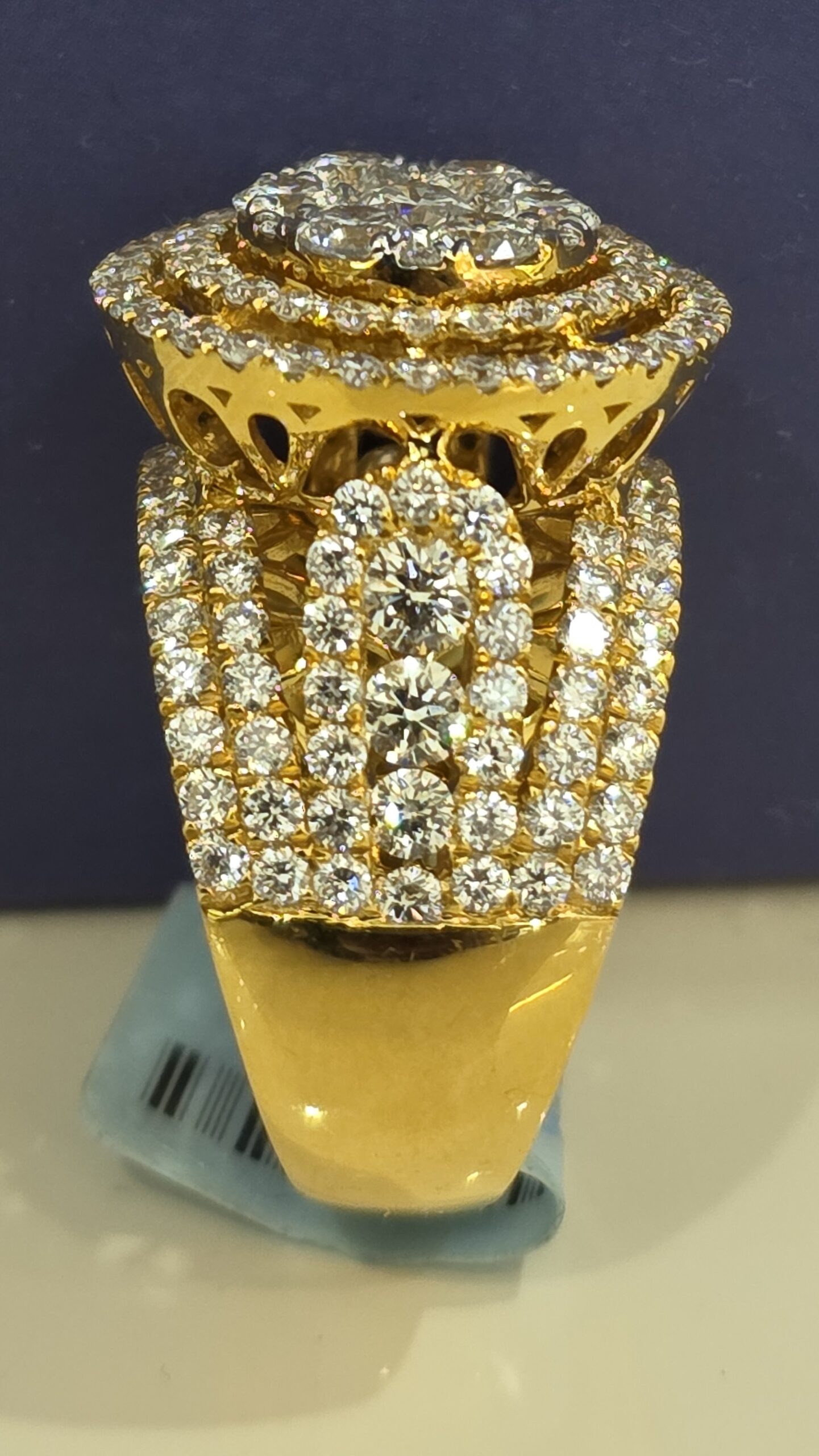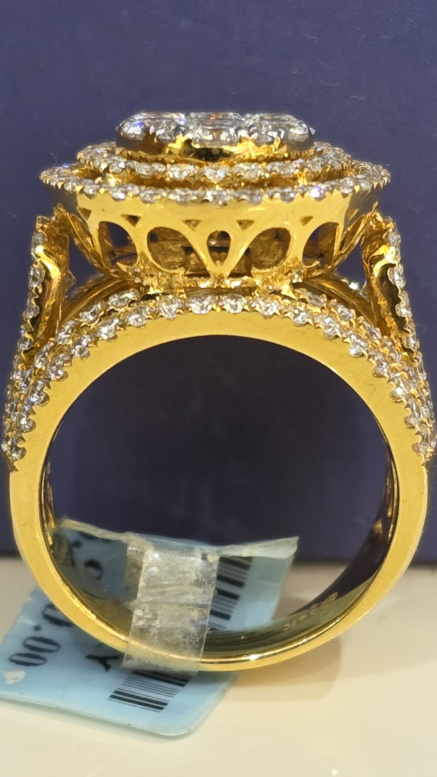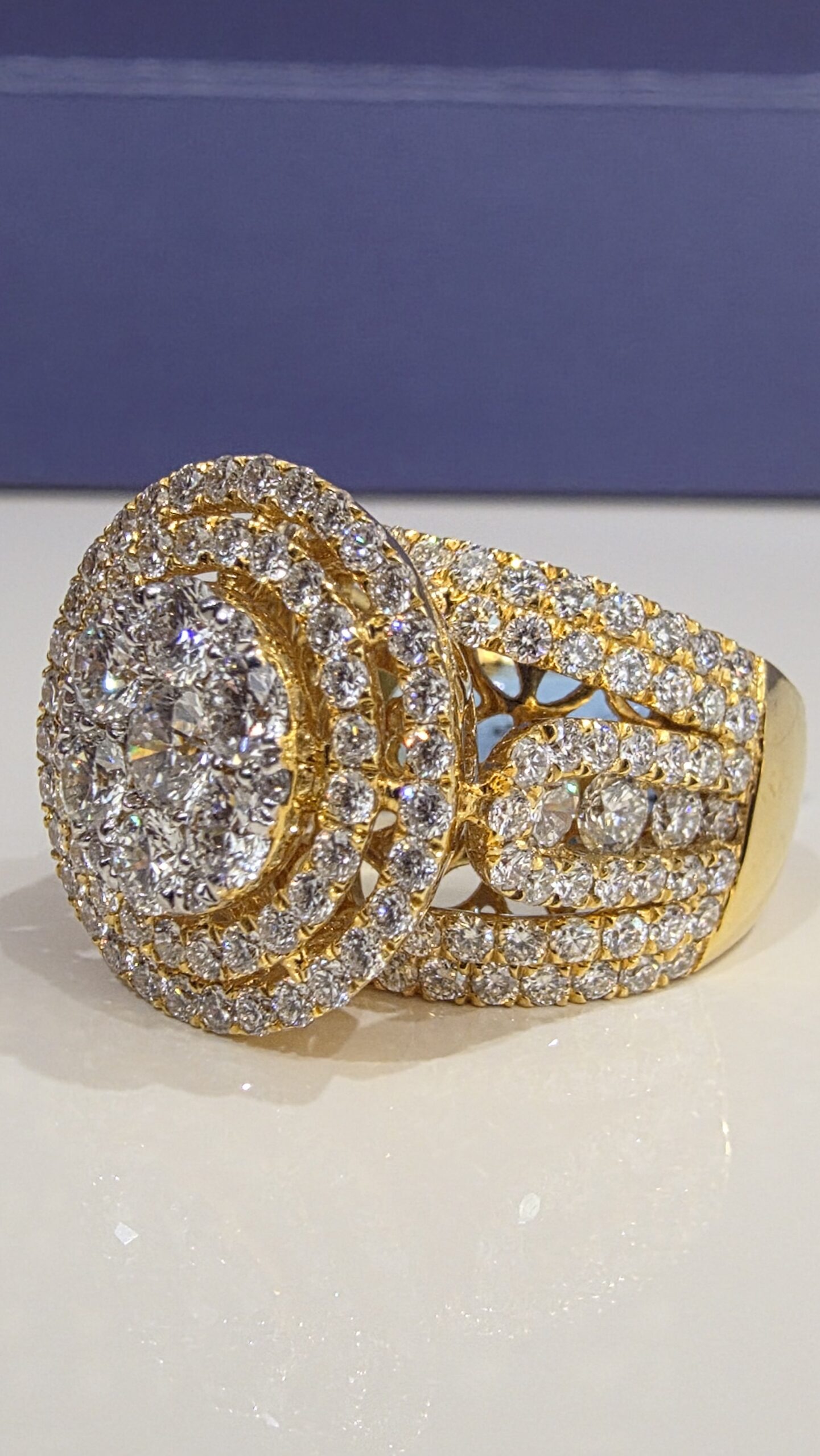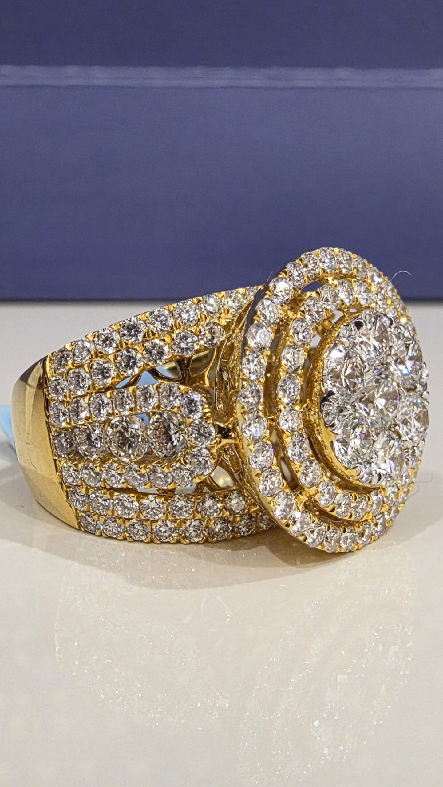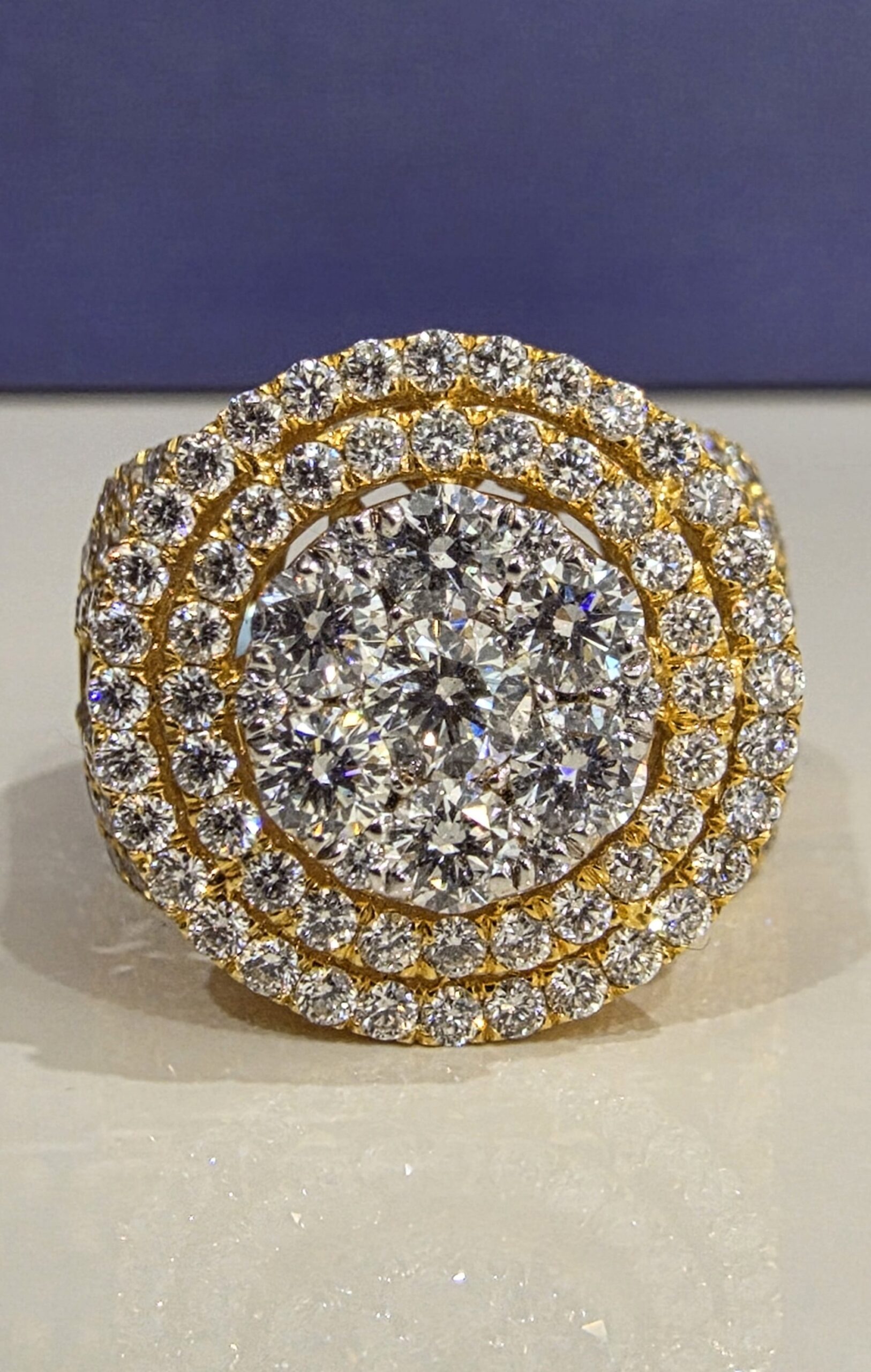 Say “I do” with this stunning 14KT gold bridal ring! Featuring a dazzling 4.00CT diamond with VvS clarity and F color in a triple halo setting, it shines with an 18MM top head width and weighs 11.2 grams.