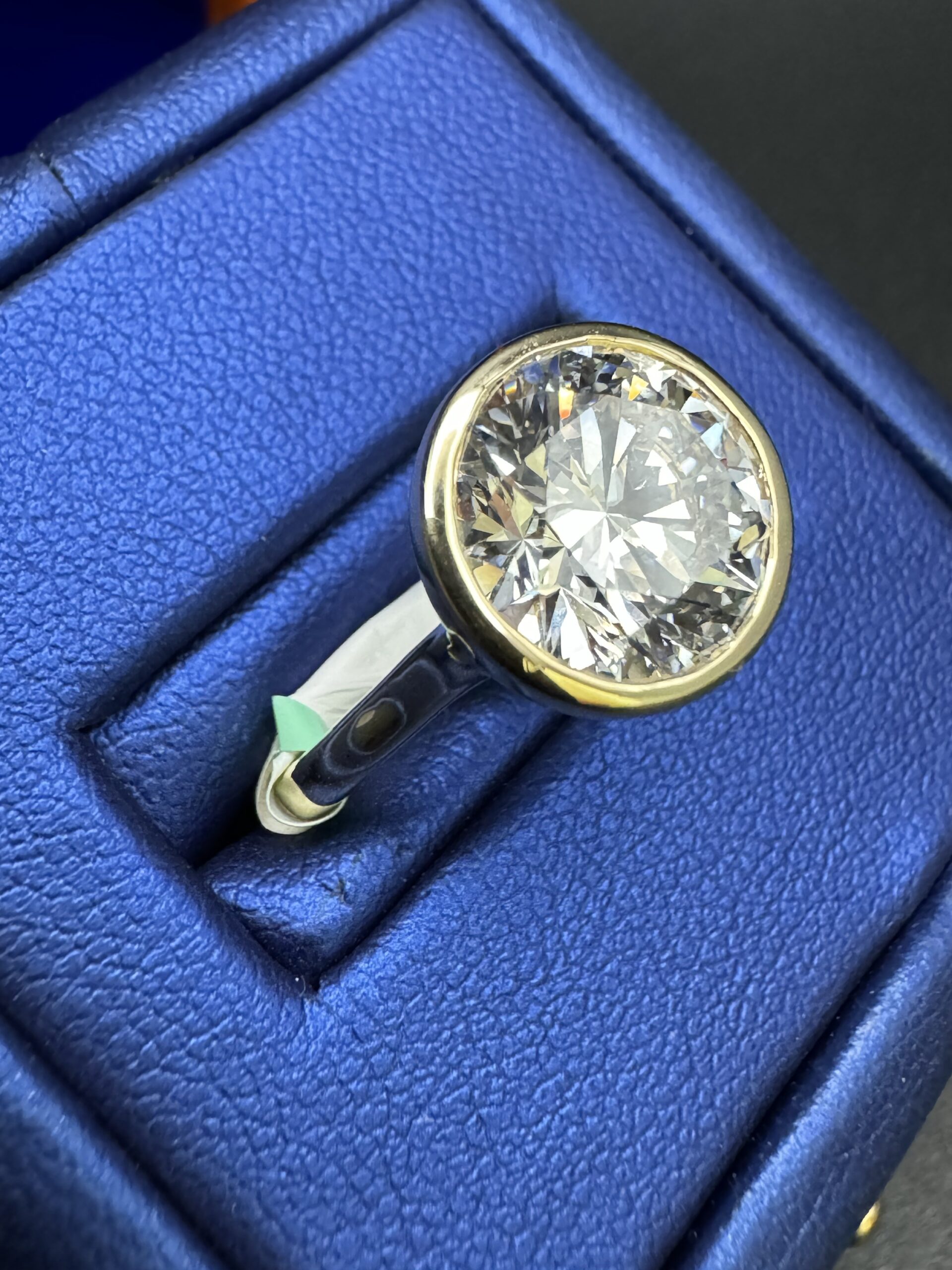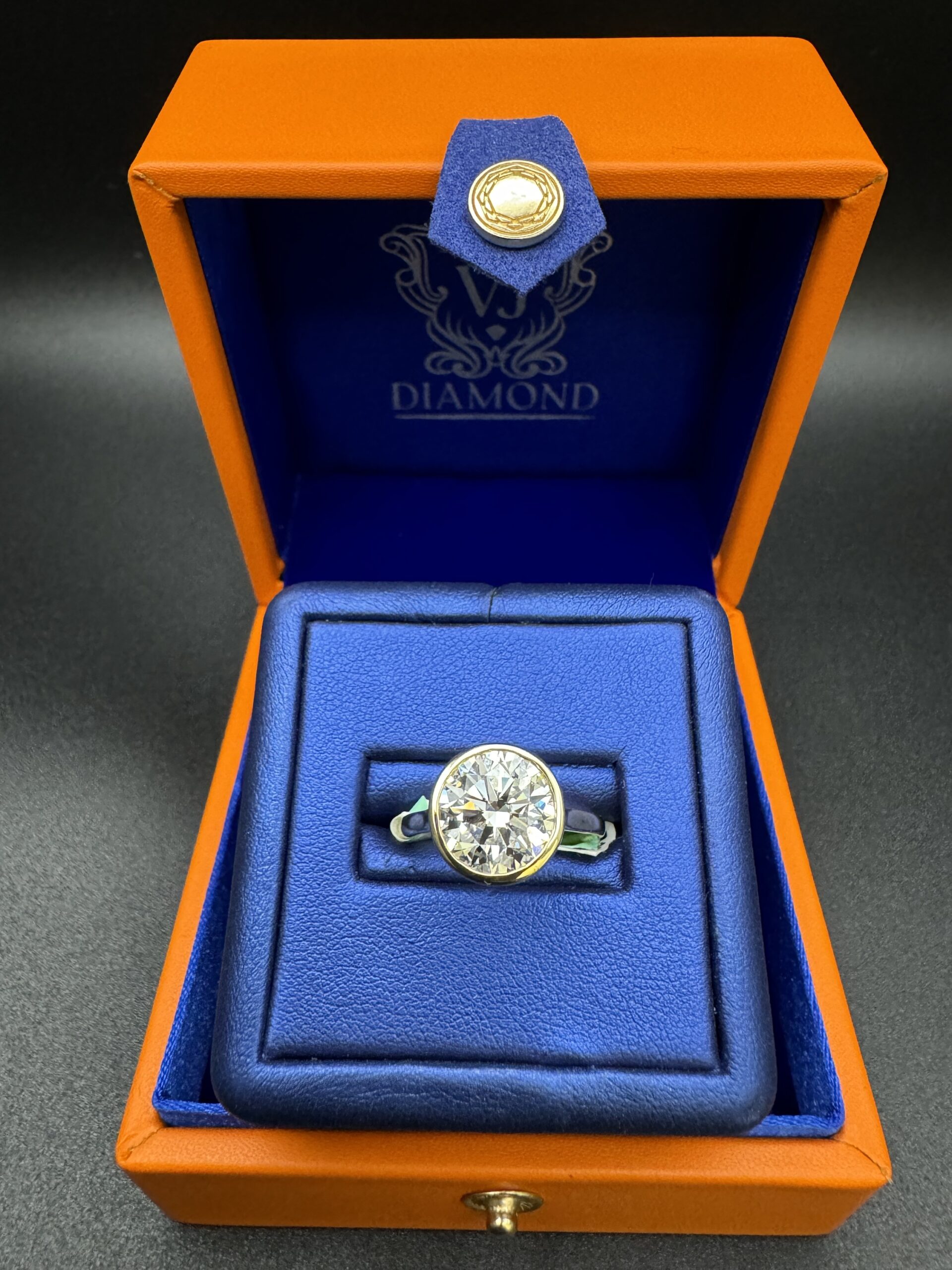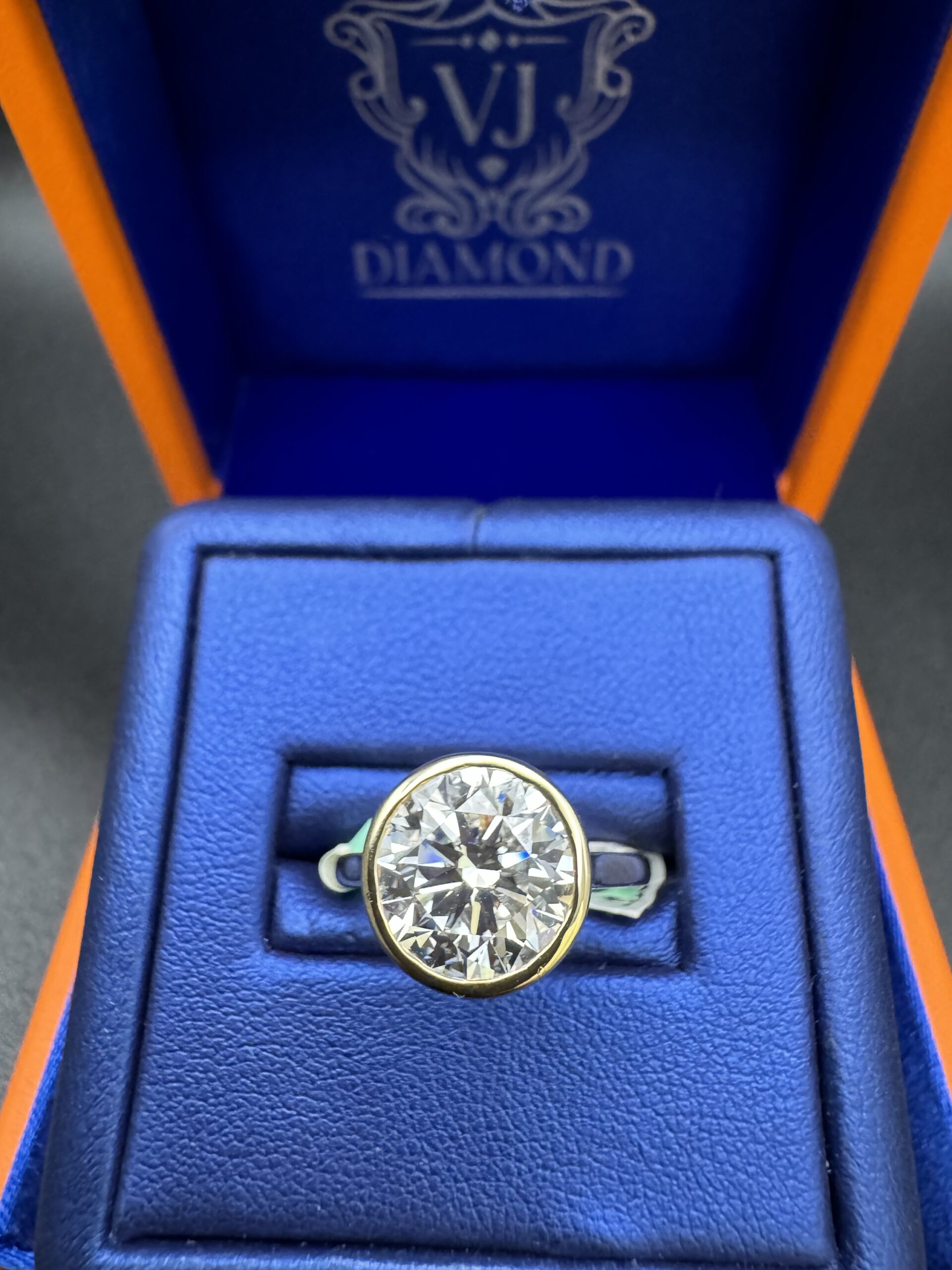 14KT Gold 4.00CT RoundCut LGD Ladies Bezel Set Design Size 7 Approx Gold Weight 4.2 Gram Sizing Available Certified Stone VVS Clarity F-G Color
