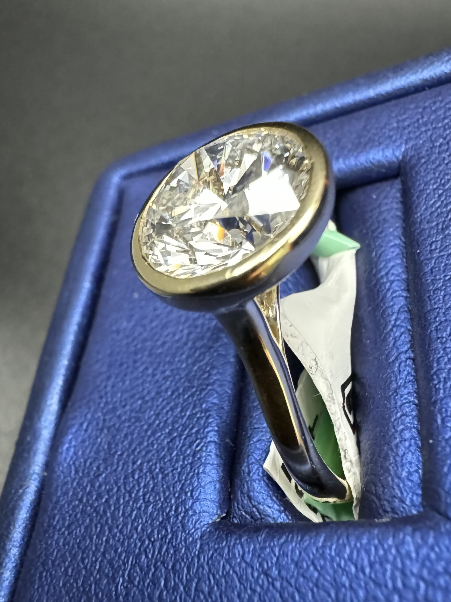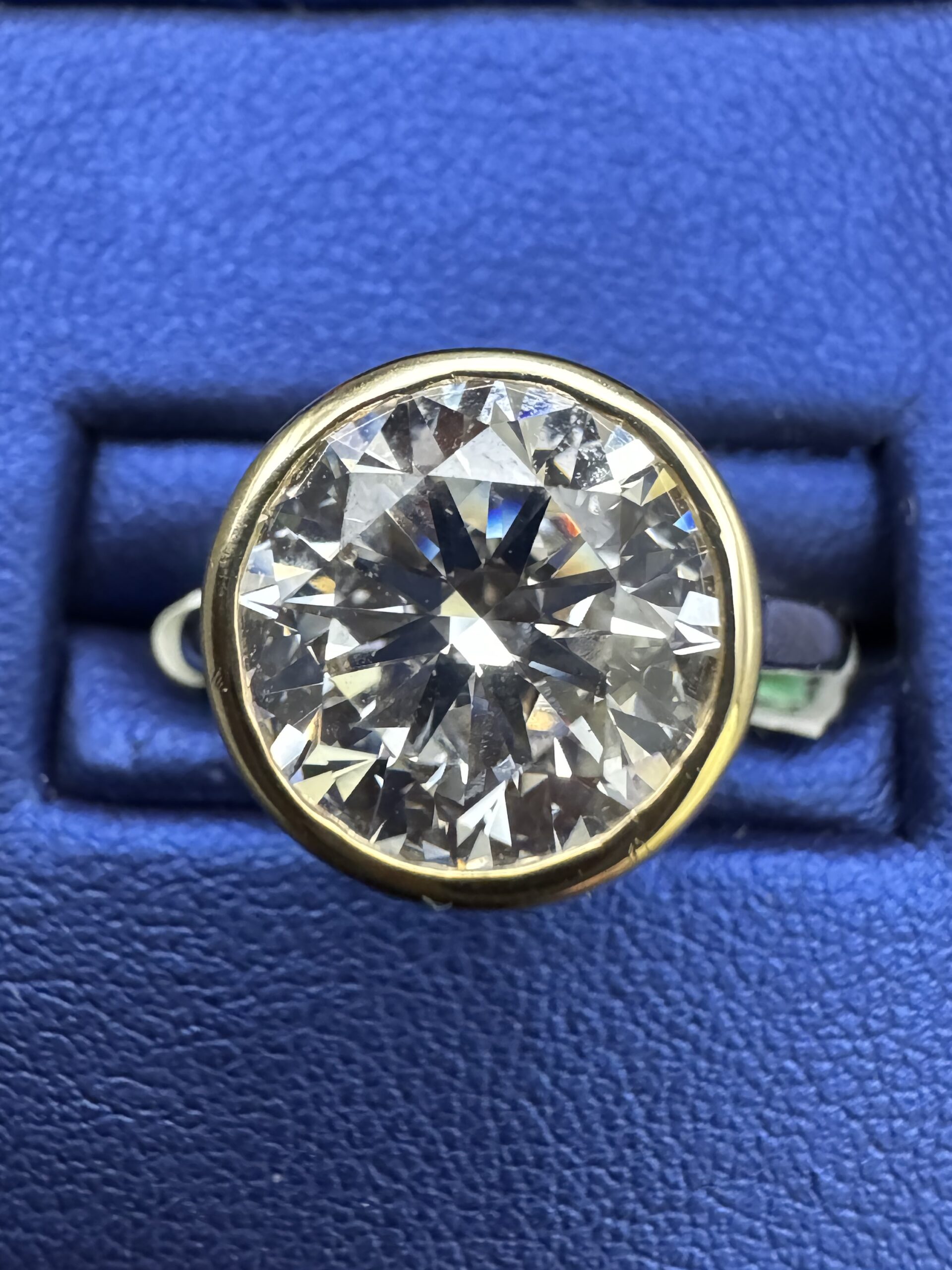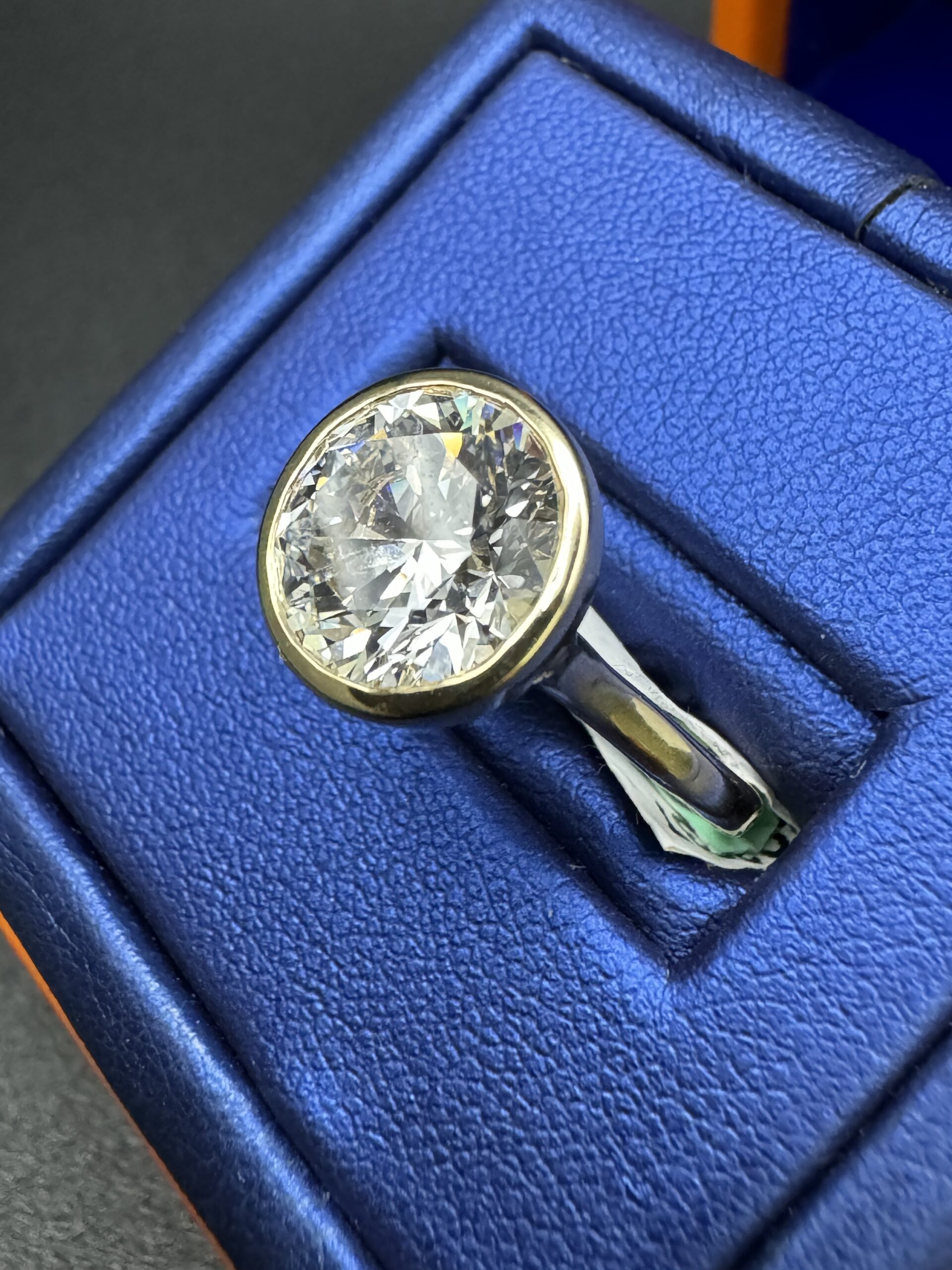 14KT Gold 4.00CT RoundCut LGD Ladies Bezel Set Design Size 7 Approx Gold Weight 4.2 Gram Sizing Available Certified Stone VVS Clarity F-G Color