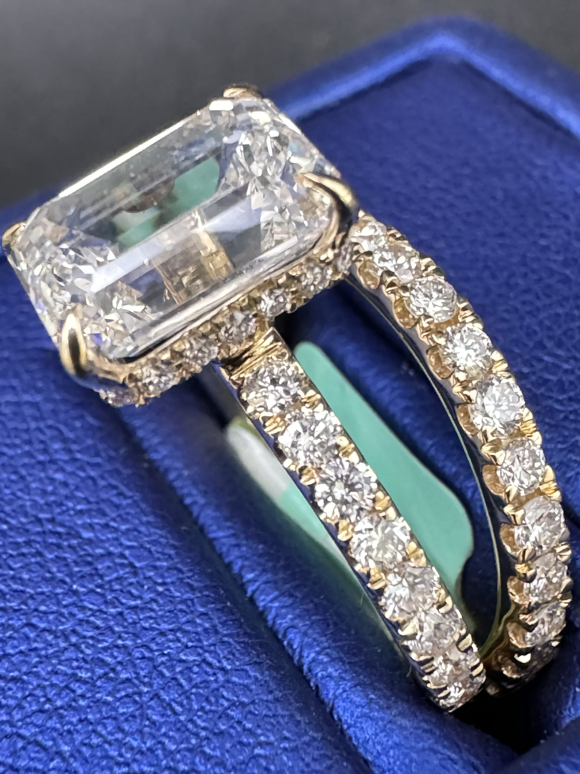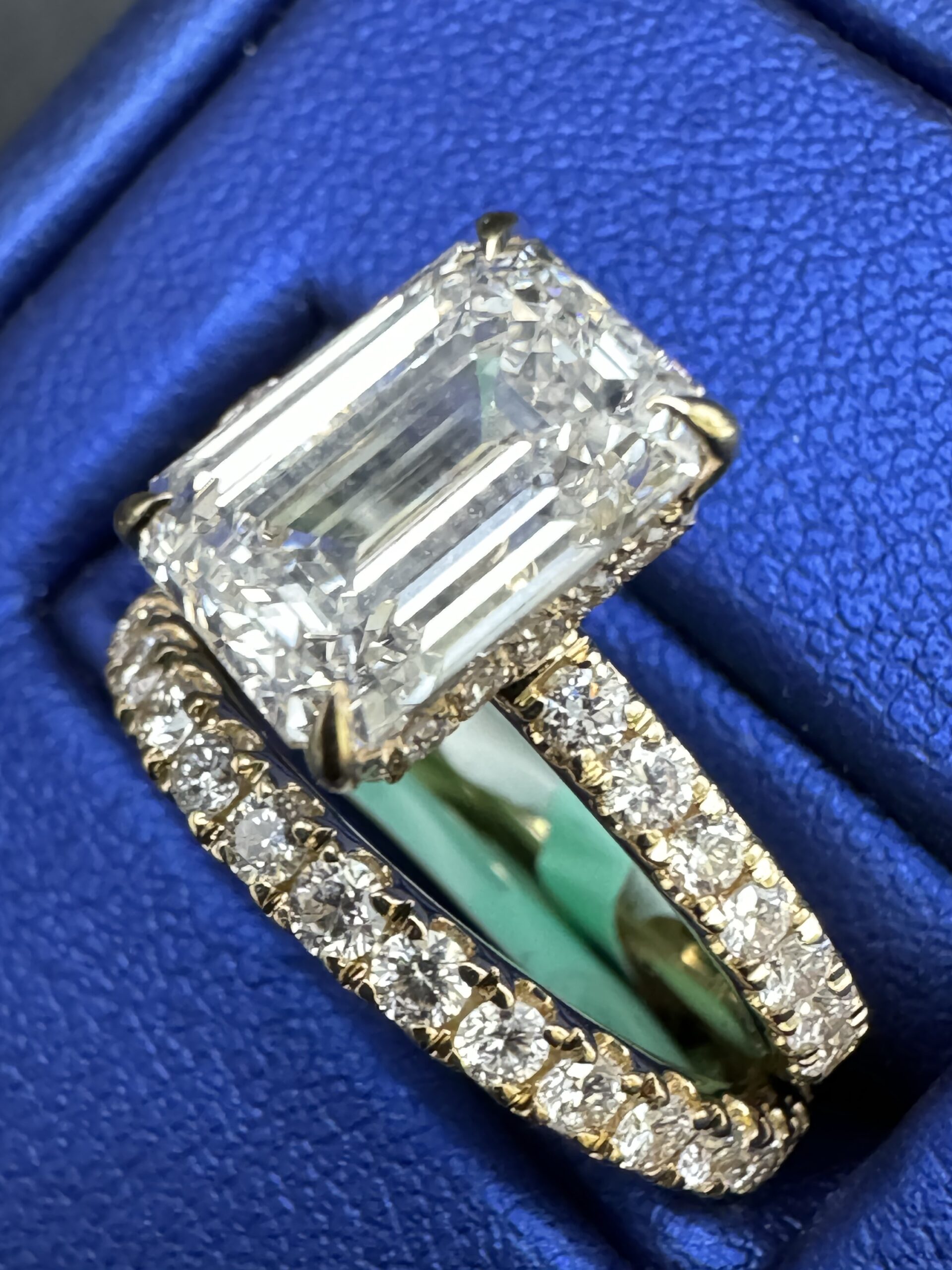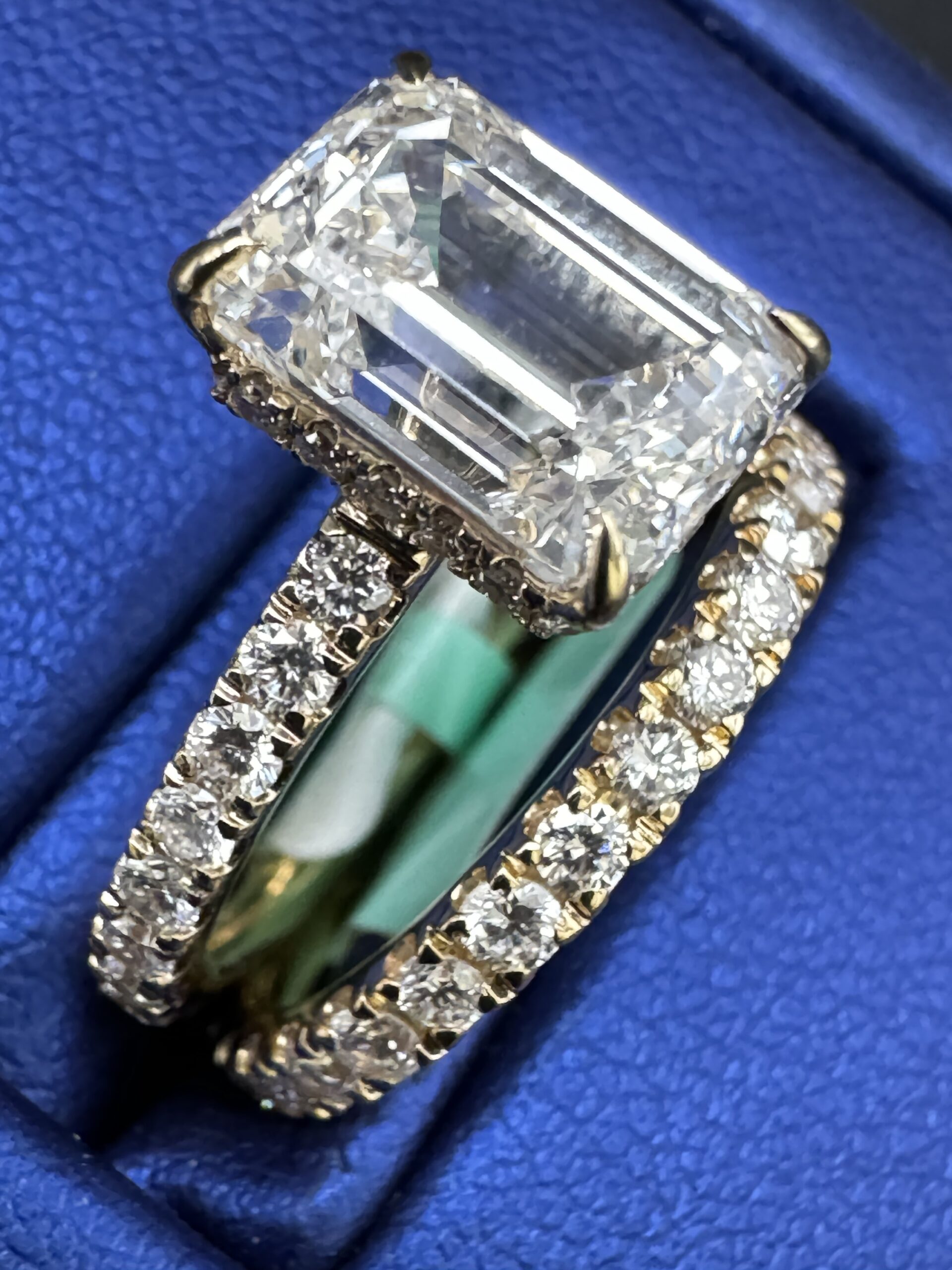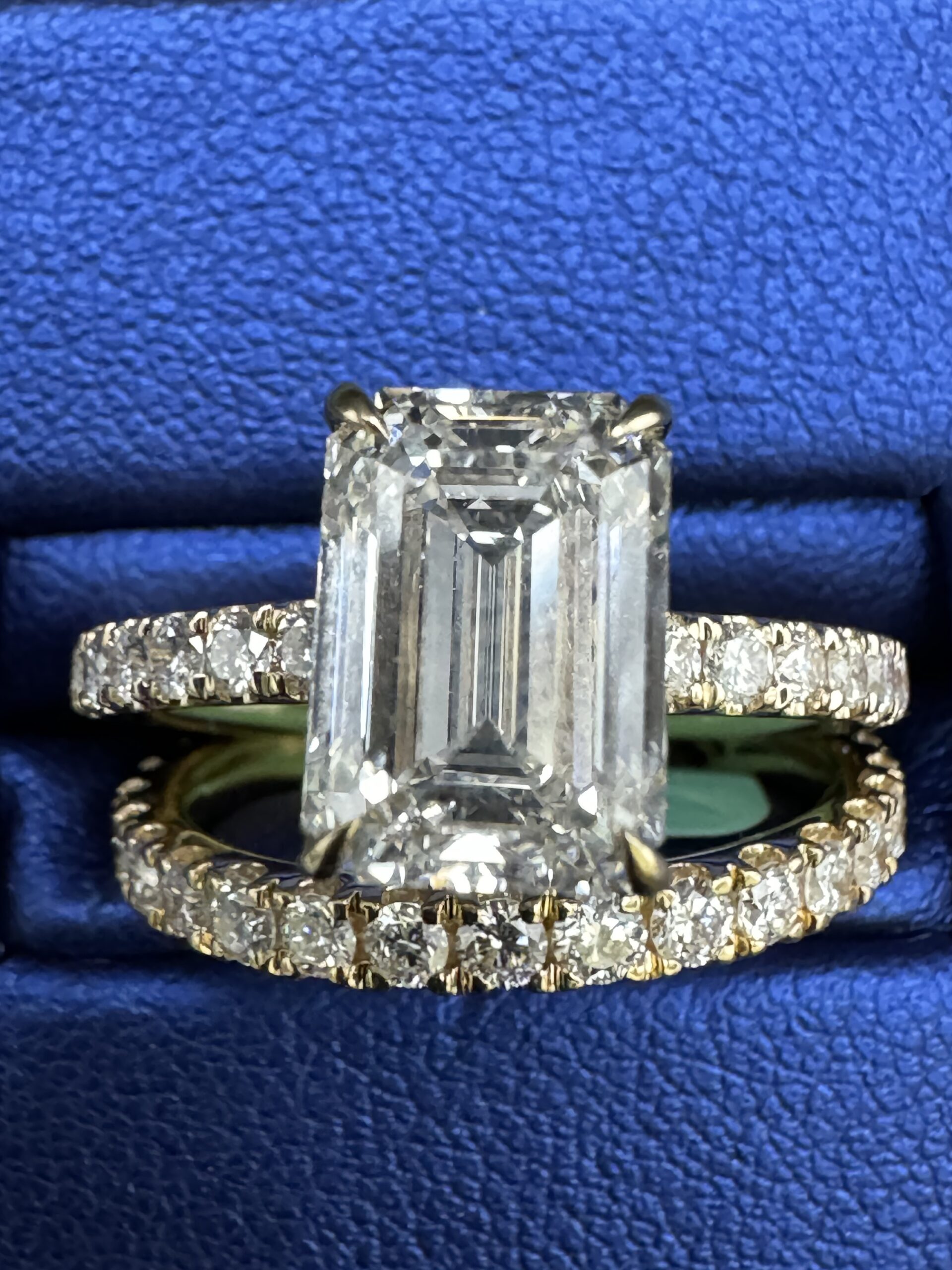 14KT Gold 4.33CT LabGrown Diamond Ring EmeraledCut Bridal Ring 3.00CT Center Stone Size 7 Approx Gold Weight 5.7 Gram 8MM Head 2.5MM Side With Matching Pave Band Clarity F ColorSizing Available