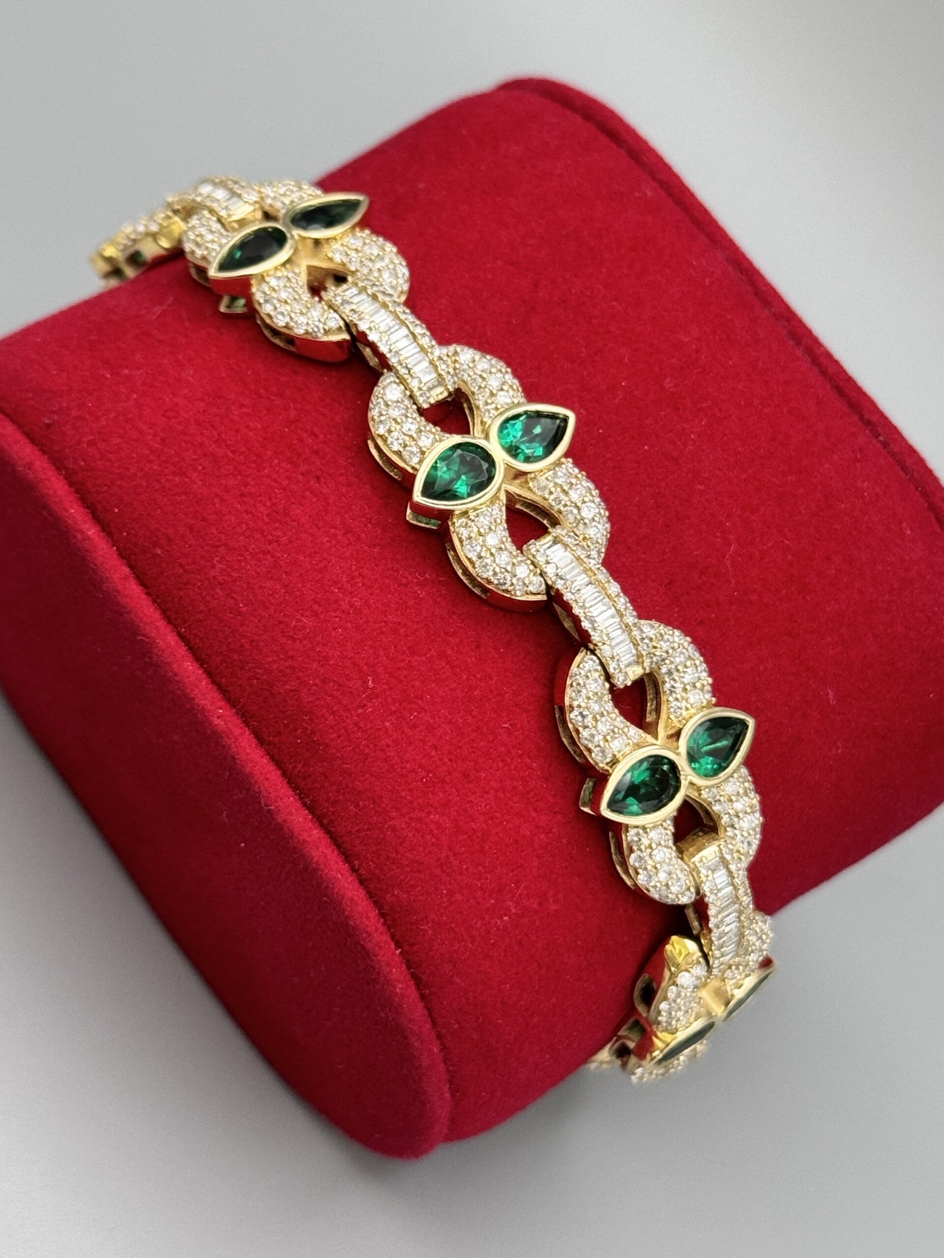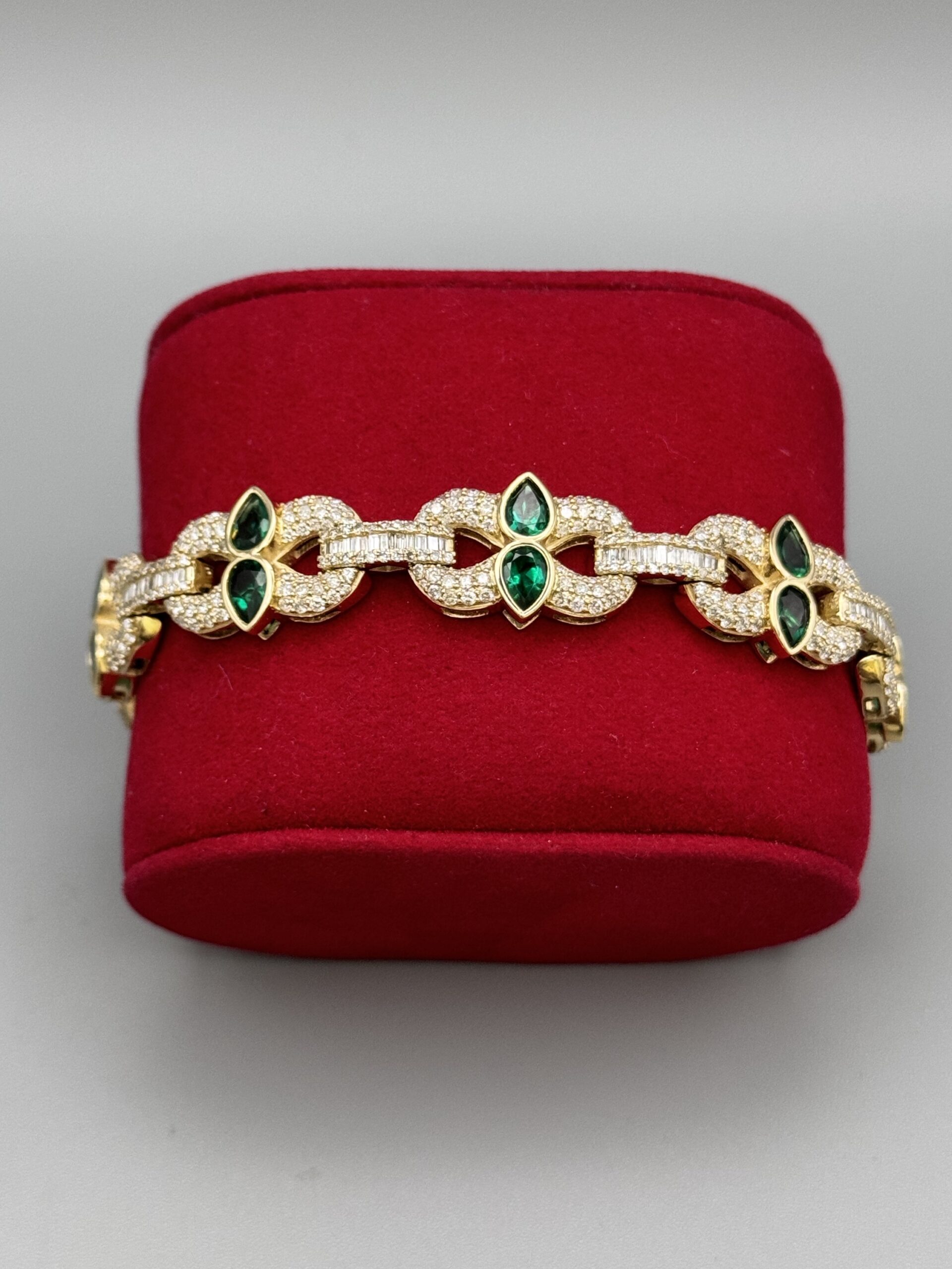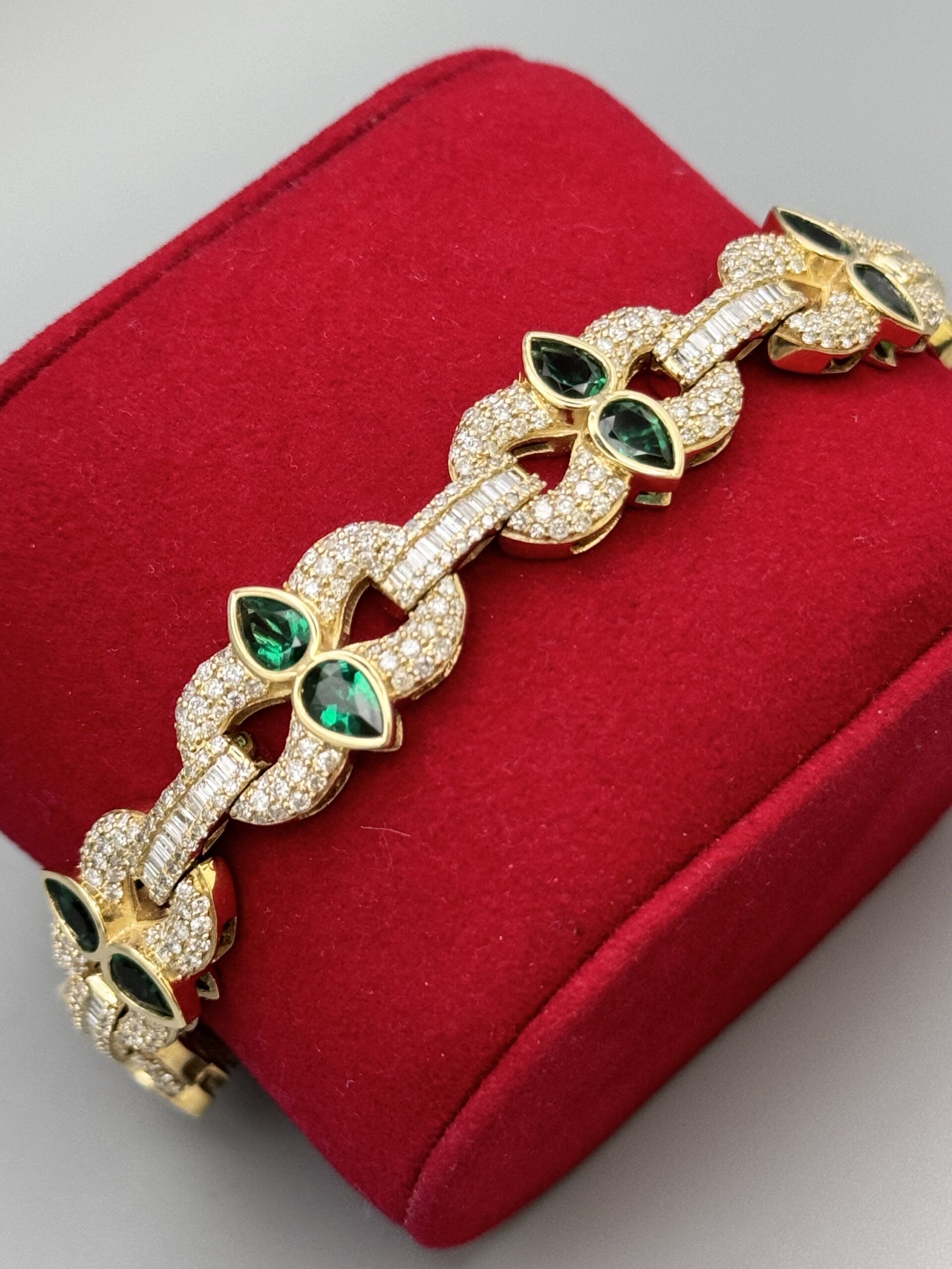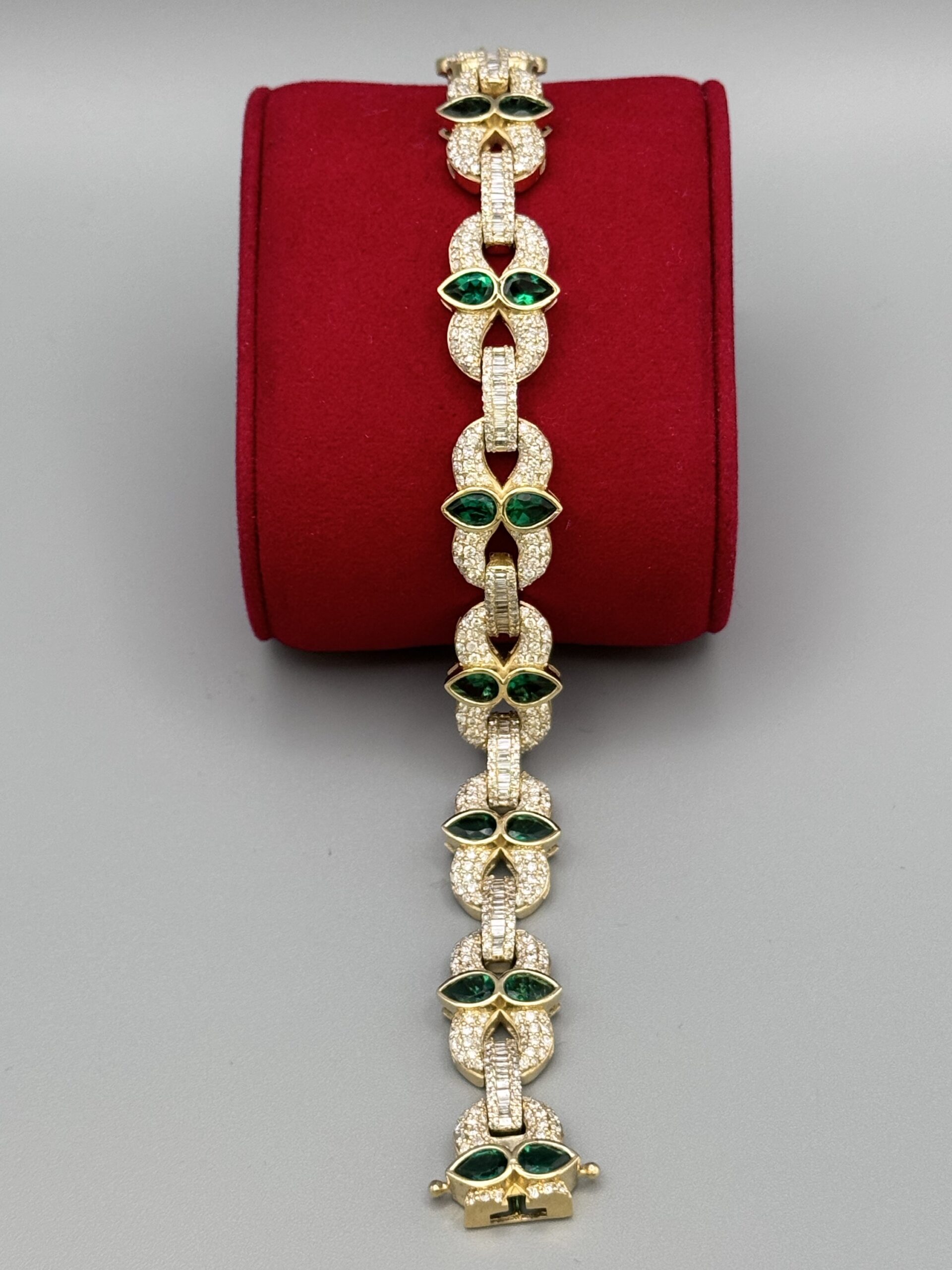 This stunning 14KT Gold Infinity Bracelet features 6.98CT of VS clarity diamonds and vibrant green emerald stones, sized at 8.5″ and weighing 41.3 grams. A timeless treasure for any occasion!