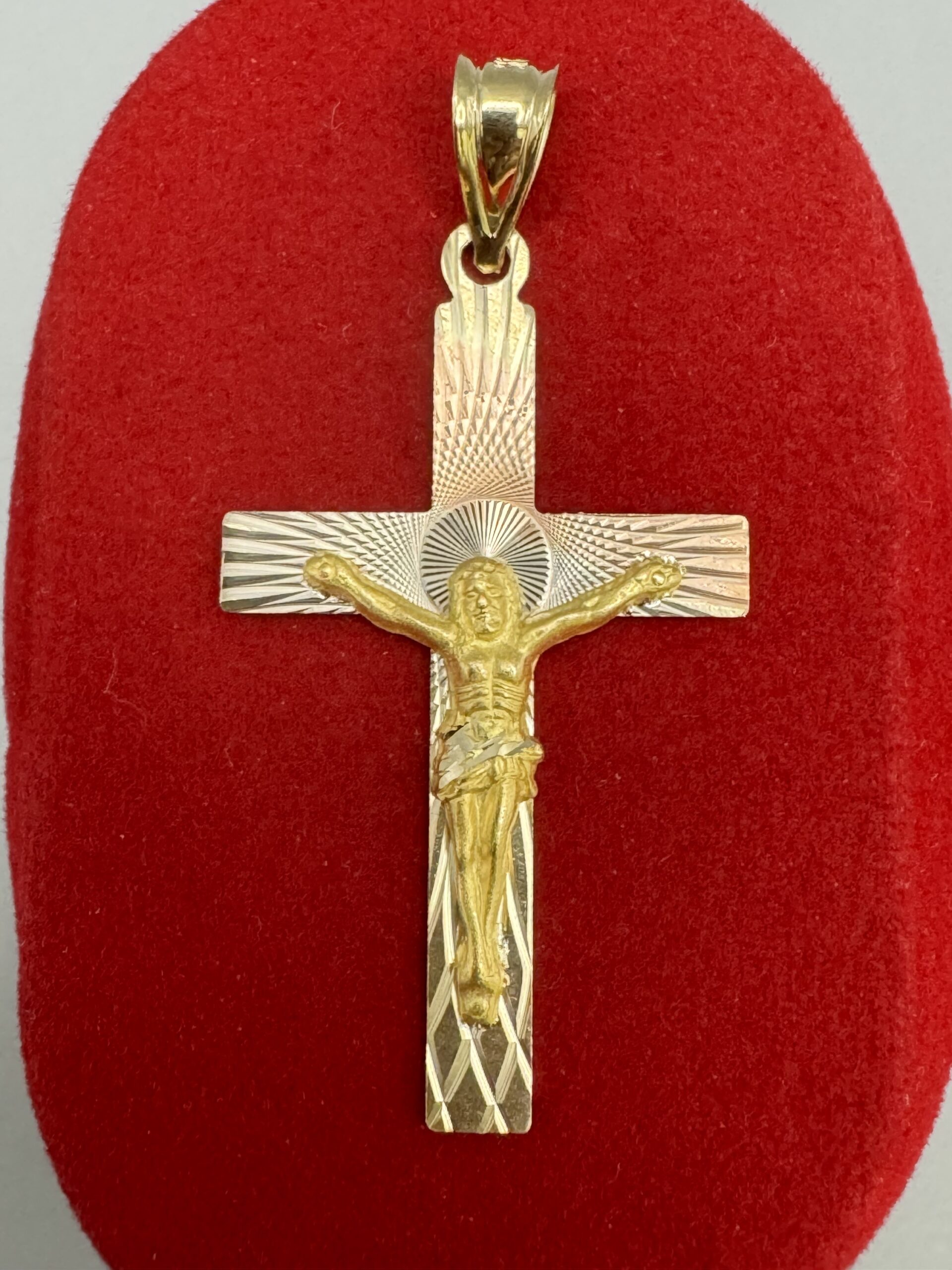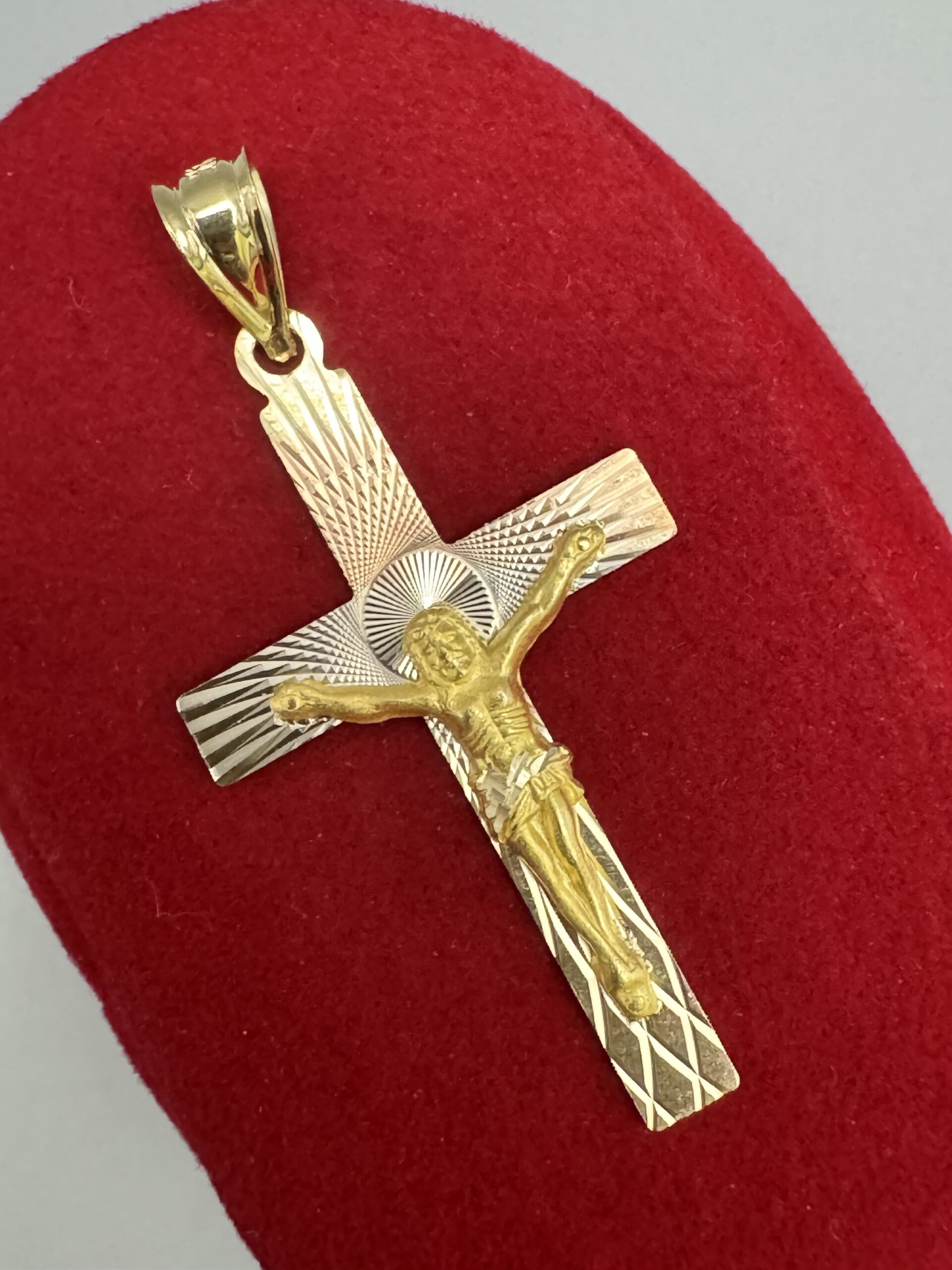 14KT Gold Cross Pendant LaserCut Design TriColor Approx Gold Weight 2.5 Gram 1″ Wide By 1.75″ Tall
