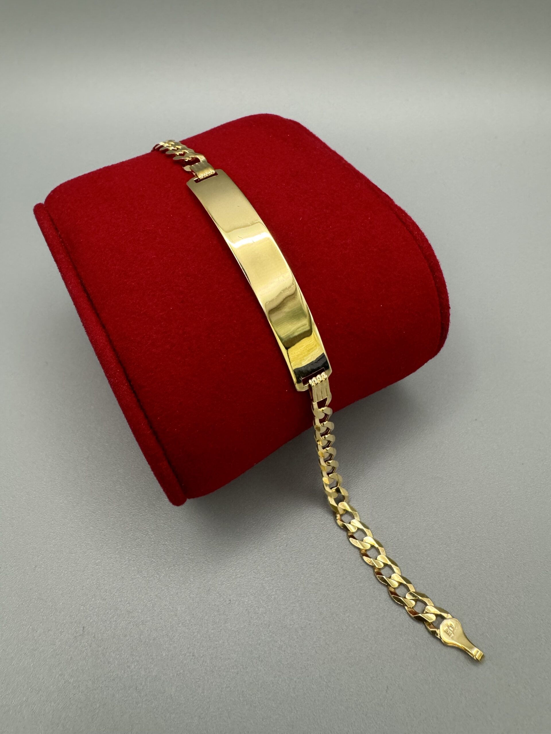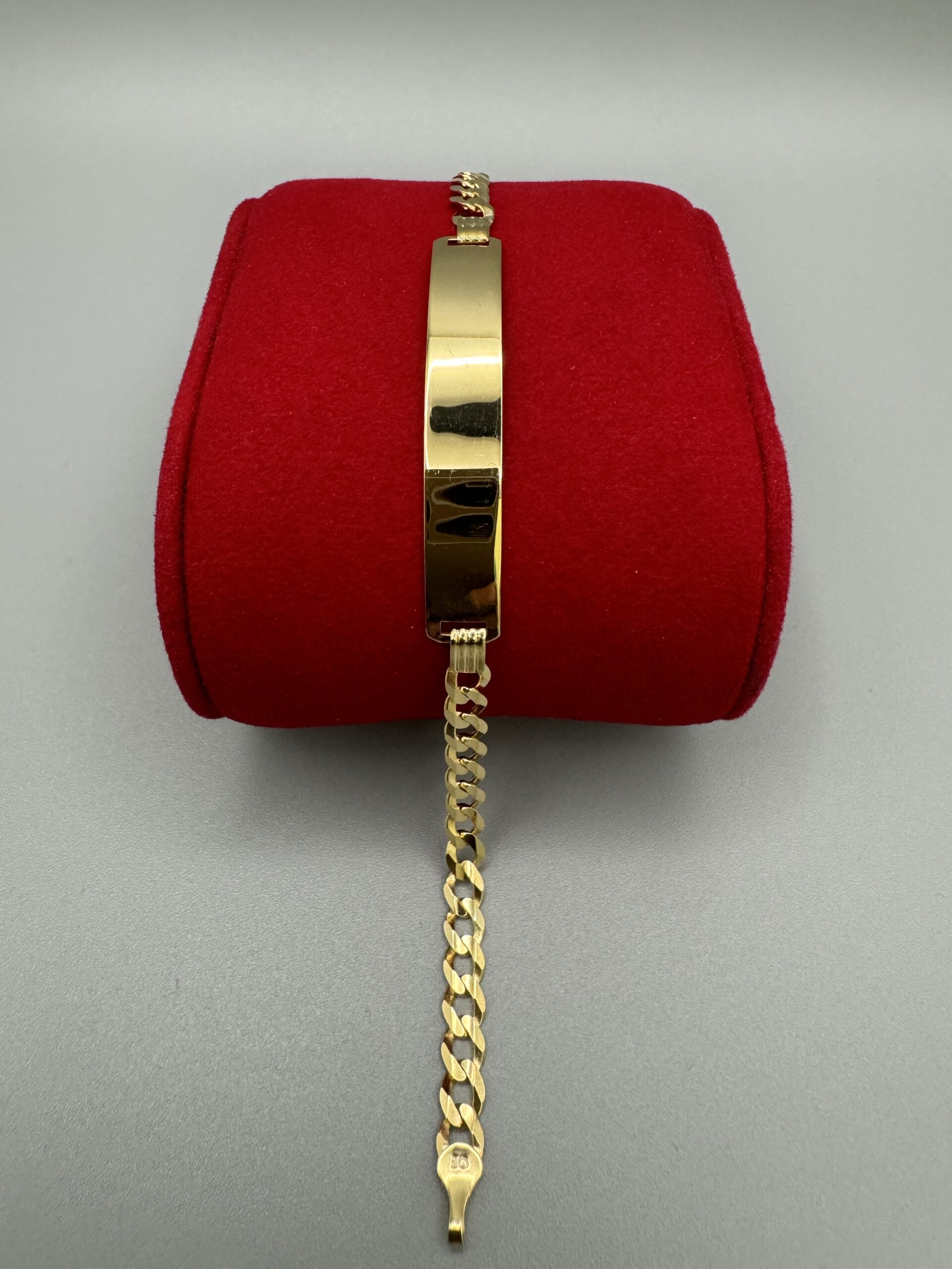 14KT Gold ID Bracelet With CubanLink Design Size 8″ 1.3″ wide ID Engraving Available Approx Gold Weight 6.7 Gram 5MM Bracelet 7MM ID