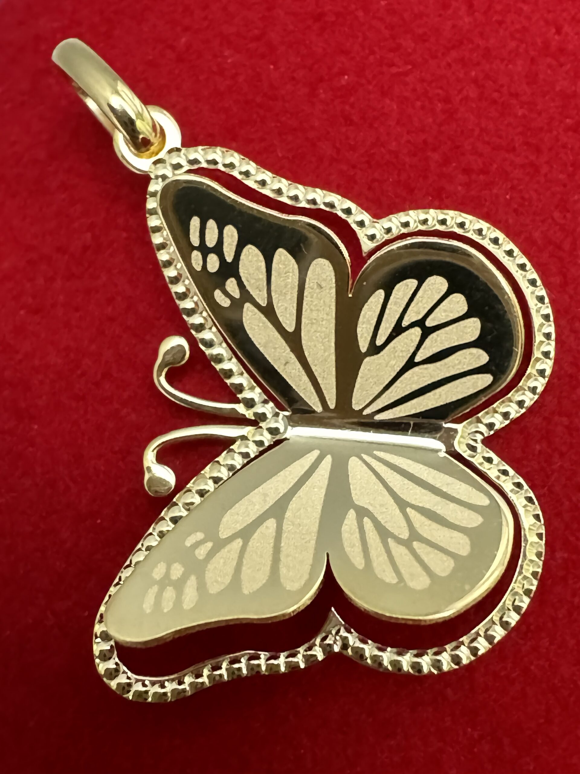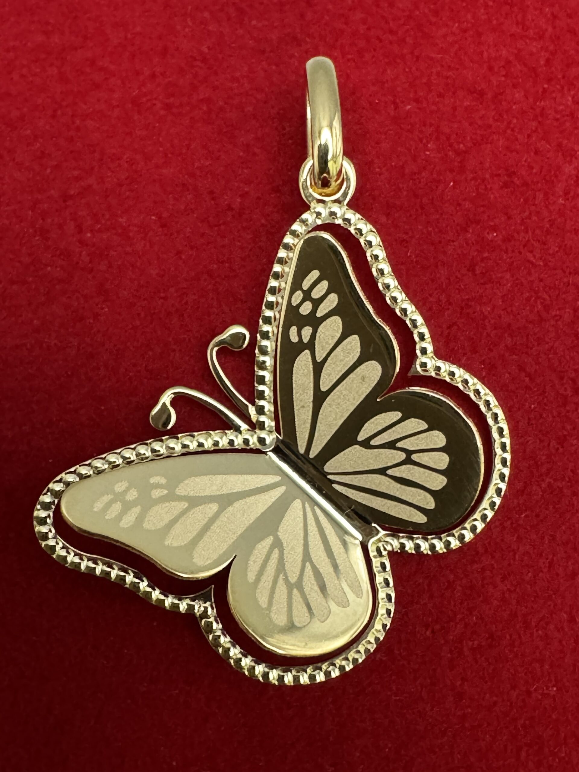 Add a flutter of elegance to your look with this 14KT Gold Fancy Butterfly Pendant, measuring 1.25″ tall by 1″ wide. Gleaming at 1.7 grams, its intricate laser-cut design is truly enchanting!