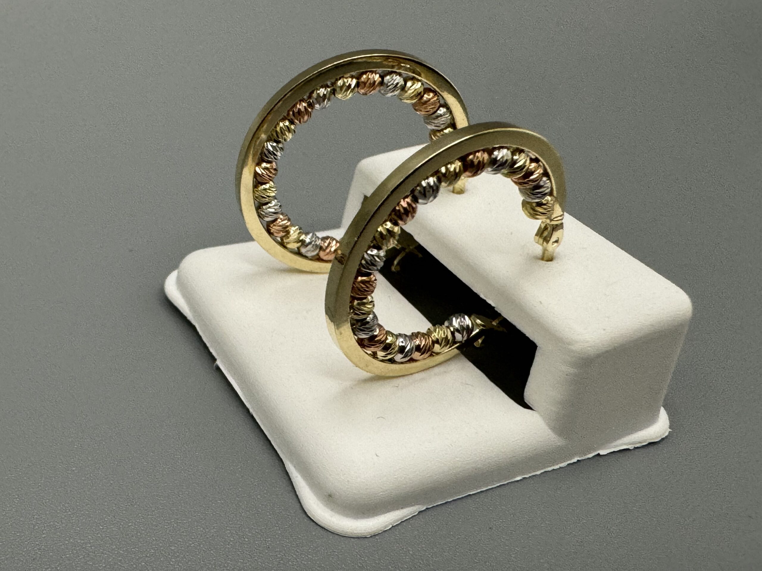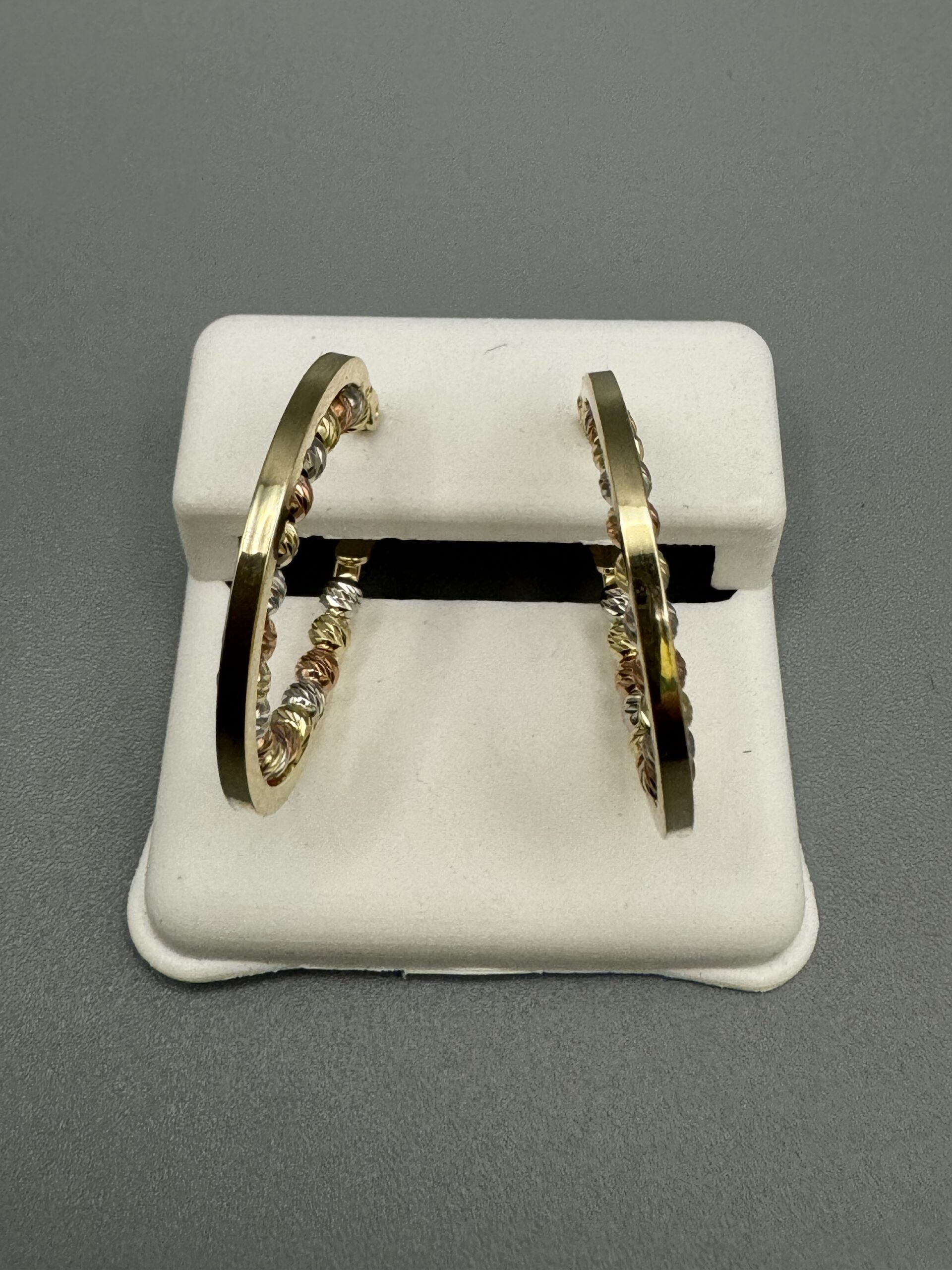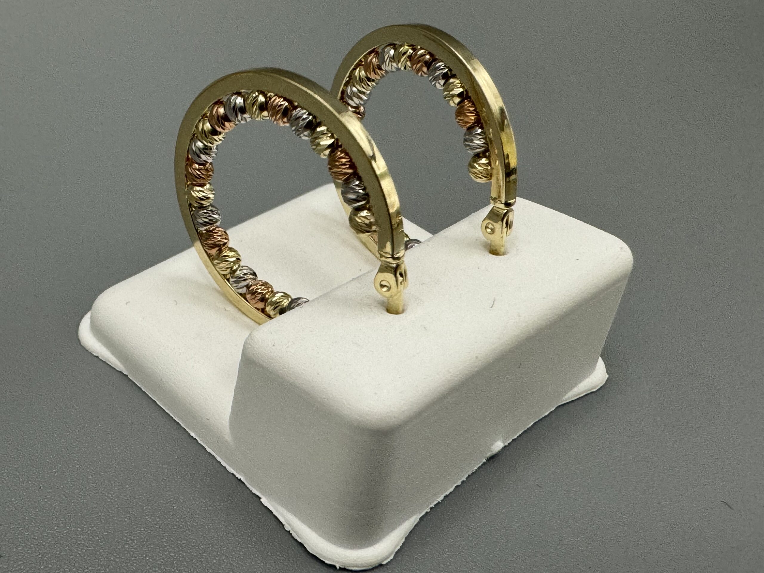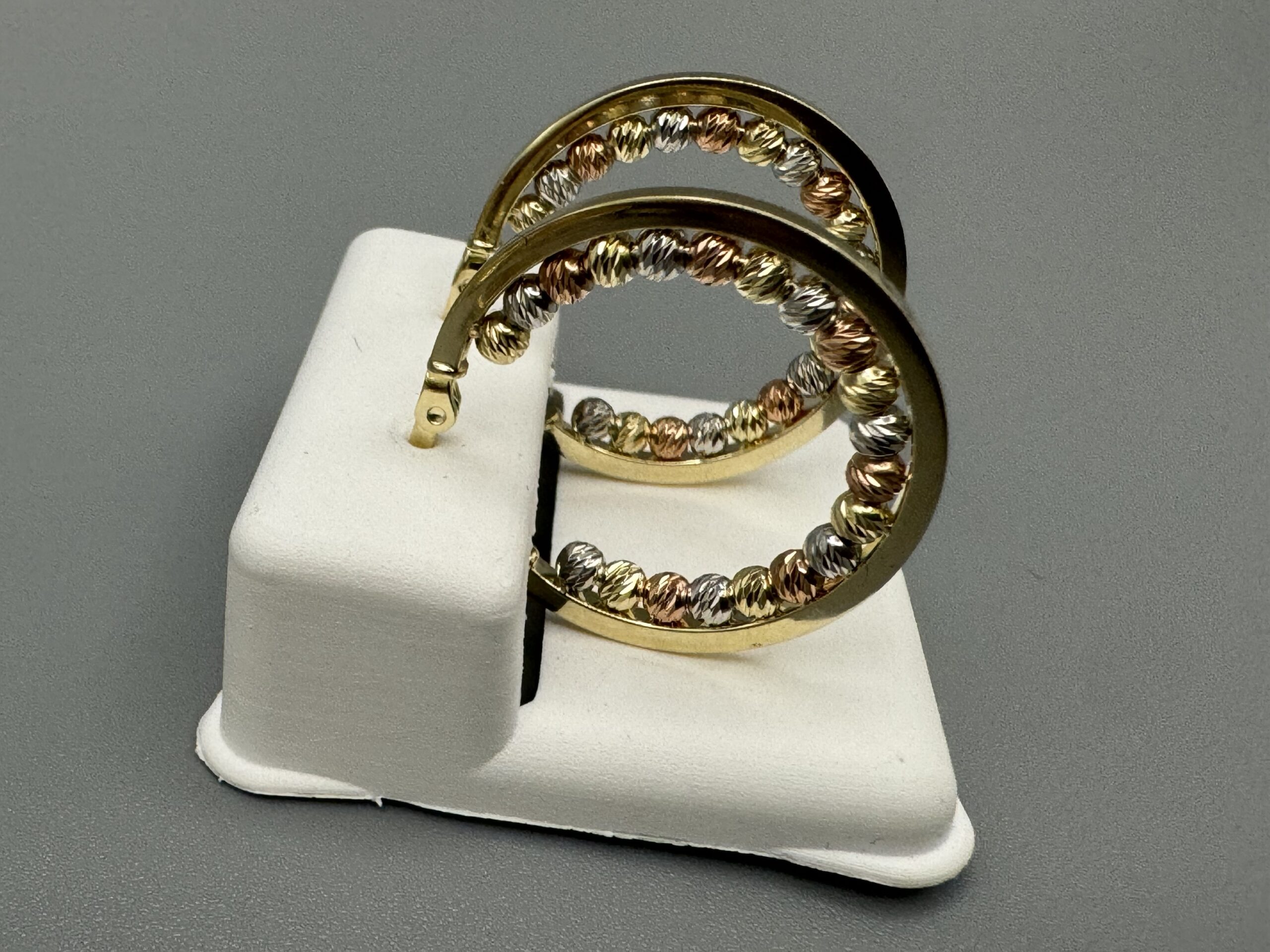 14KT Gold Fancy TriColor Hoop Earrings 2.5MM Width Bead Design Approx Gold Weight 3.7 Gram 1″ Wide