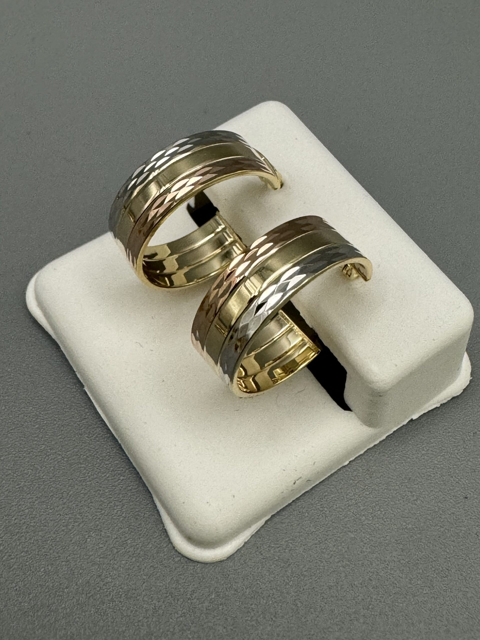 Elevate your style with these stunning 14KT Gold Fancy TriColor Hoop Earrings! With a 6MM width and approximately 3.1 grams of gold, they measure 0.65″ wide, adding a chic touch to any outfit.