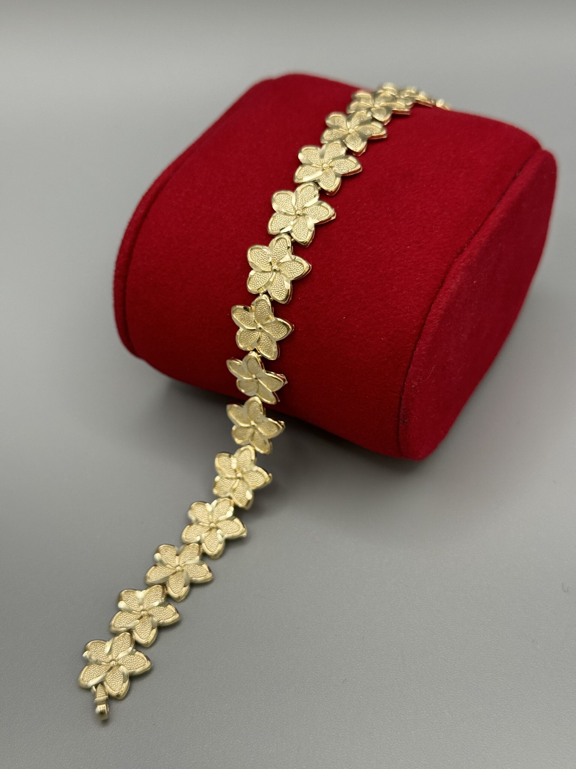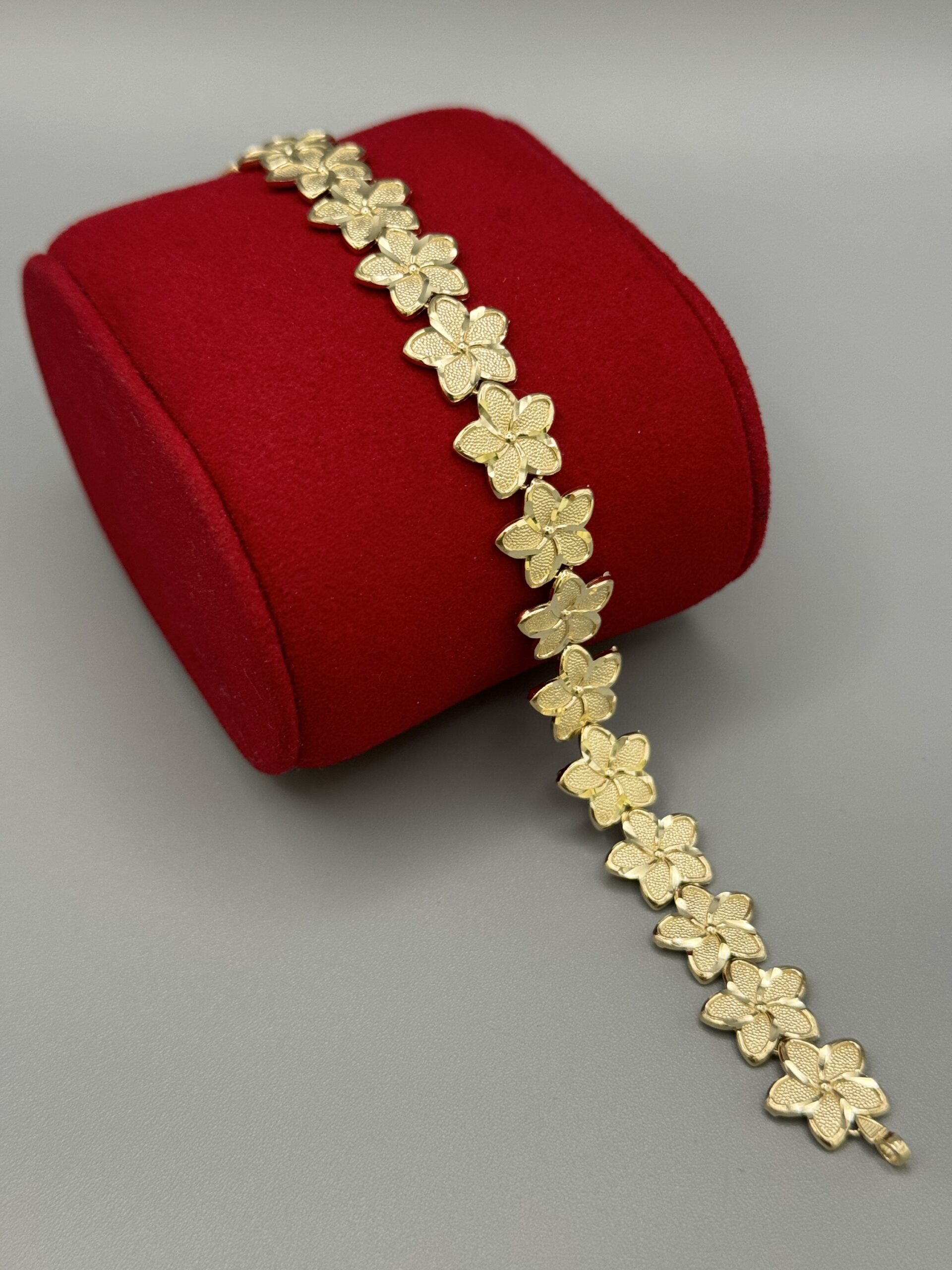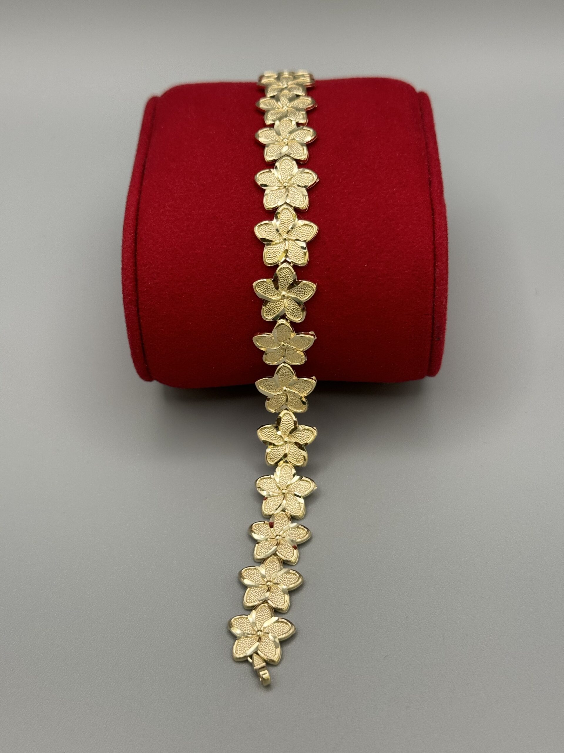 Adorn your wrist with our charming 14KT Gold Fancy Flower Bracelet. Measuring 7.5″ long and weighing 11.9 grams, it’s a floral twist that adds a spark of elegance to any outfit!