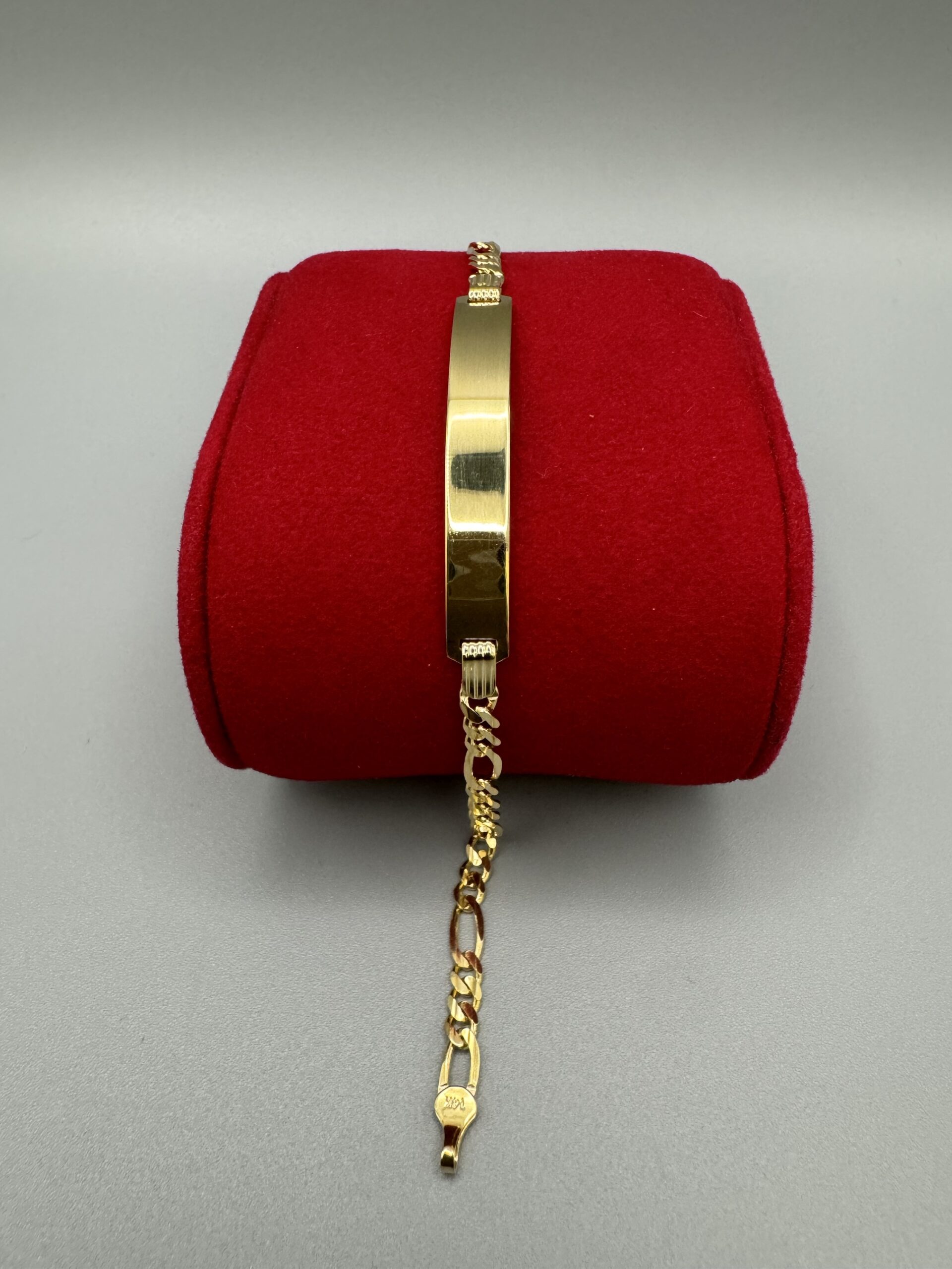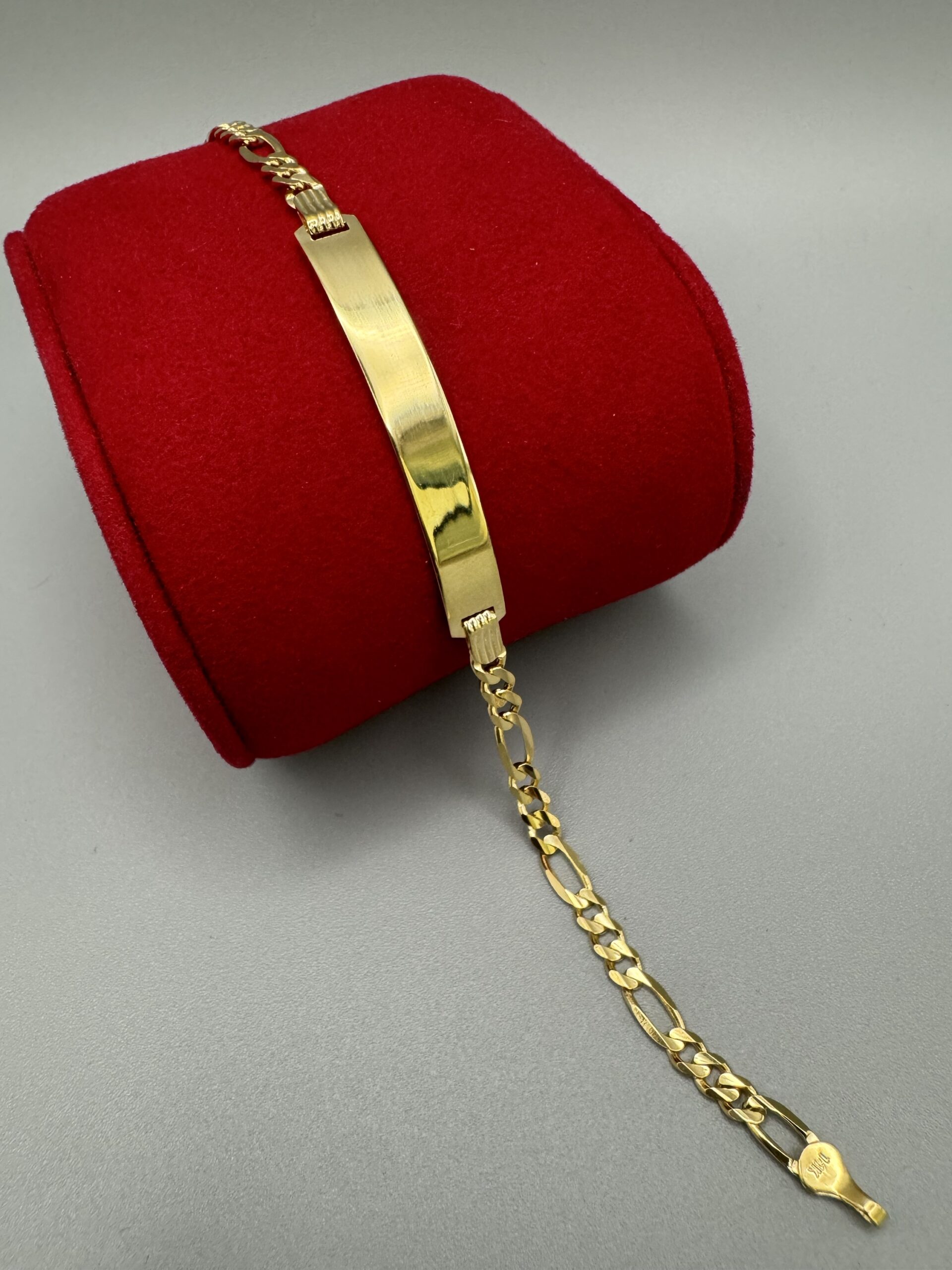 14KT Gold ID Bracelet With Figaro Design Size 8″ 1.5″ wide ID Engraving Available Approx Gold Weight 5.9 Gram 4MM Bracelet 6MM ID