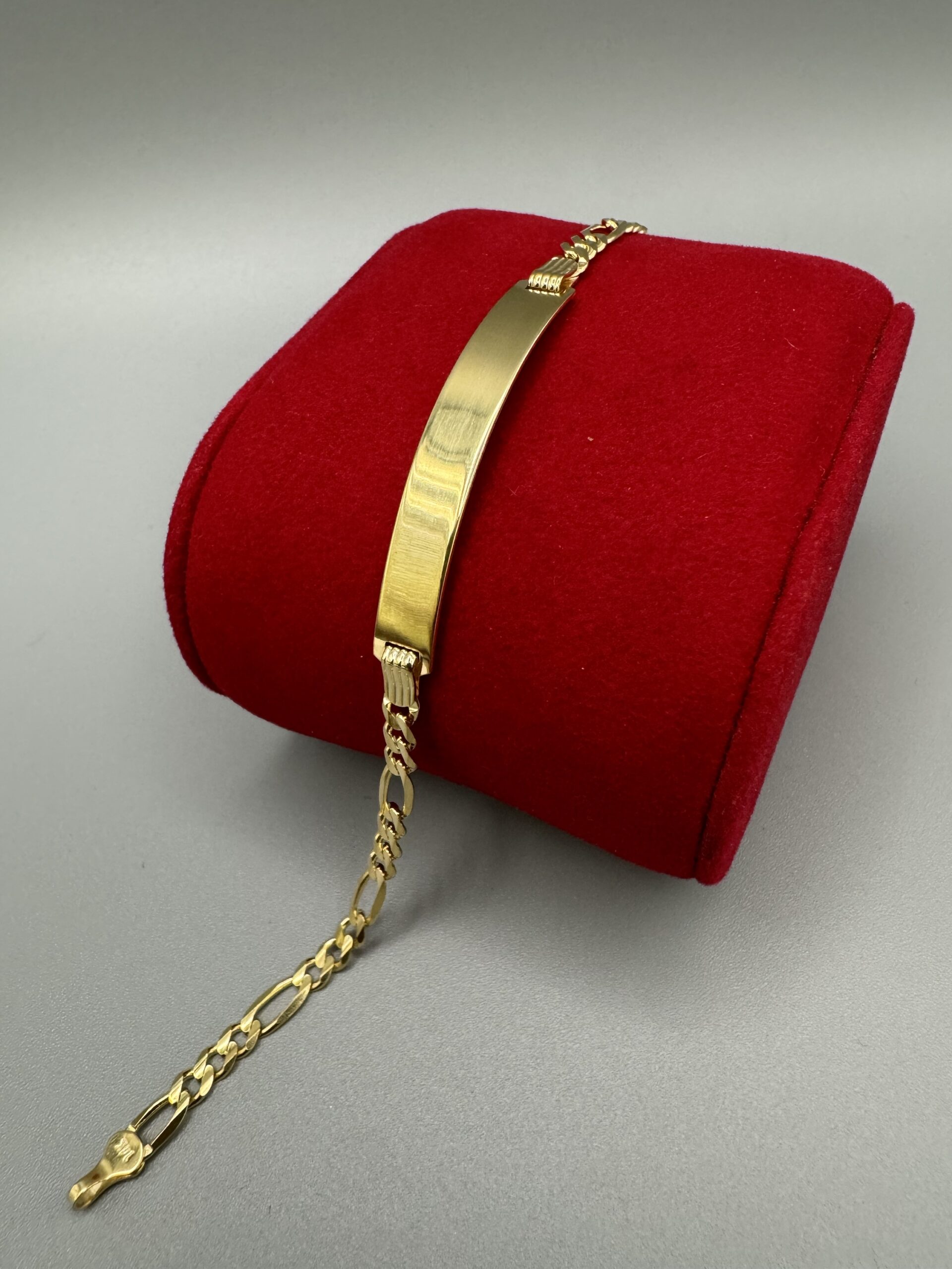 Elevate your style with this stunning 14KT Gold ID Bracelet featuring a sleek Figaro design. Measuring 8″ long and 1.5″ wide, it weighs approx. 5.9 grams. Personalize it with ID engraving for that special touch!