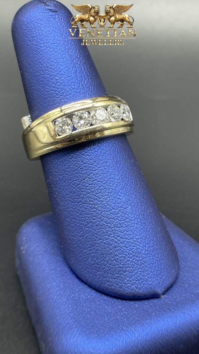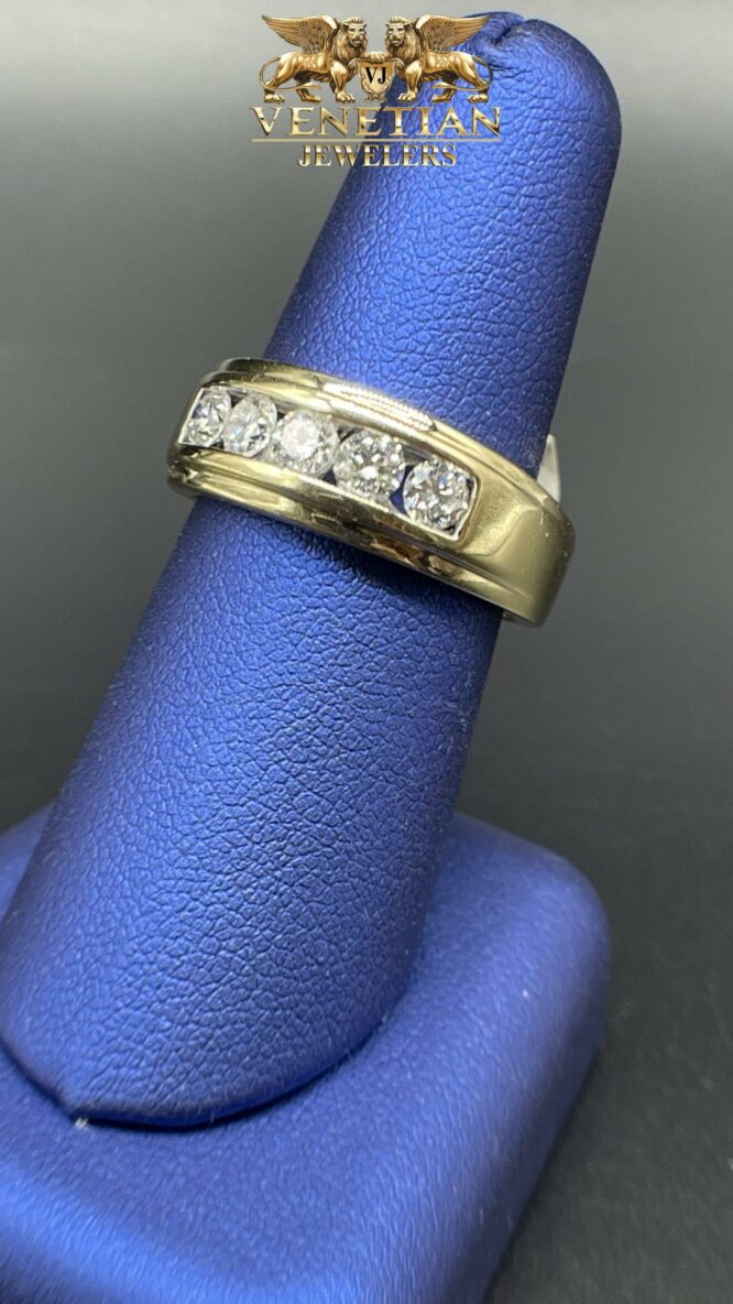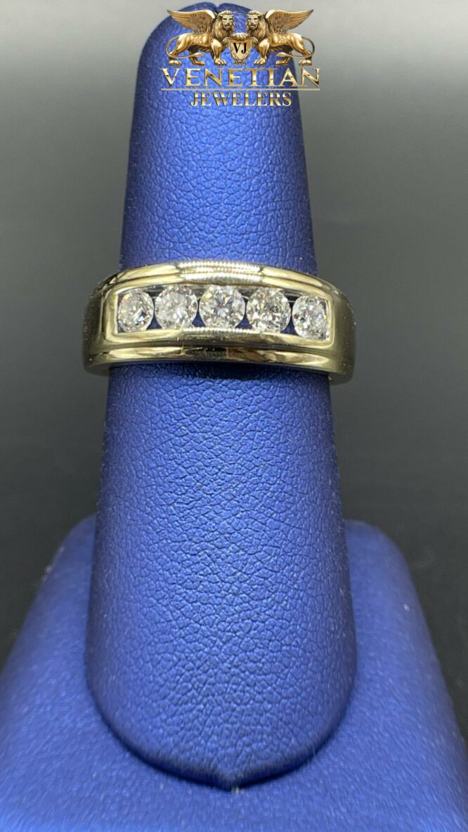 This listing is for a brand new Band made of 14k Yellow Gold with solitaire diamond. The diamond setting includes 5 round cut diamonds set in an invisible setting. A larger center diamond accented with smaller round cut diamonds. The diamonds reflect off each other for a solitaire look. A row of diamonds around the center invisible setting. The total weight of the diamonds are 1.00ctw This shine is guaranteed to last for an eternity, as these are natural, not enhanced diamonds.