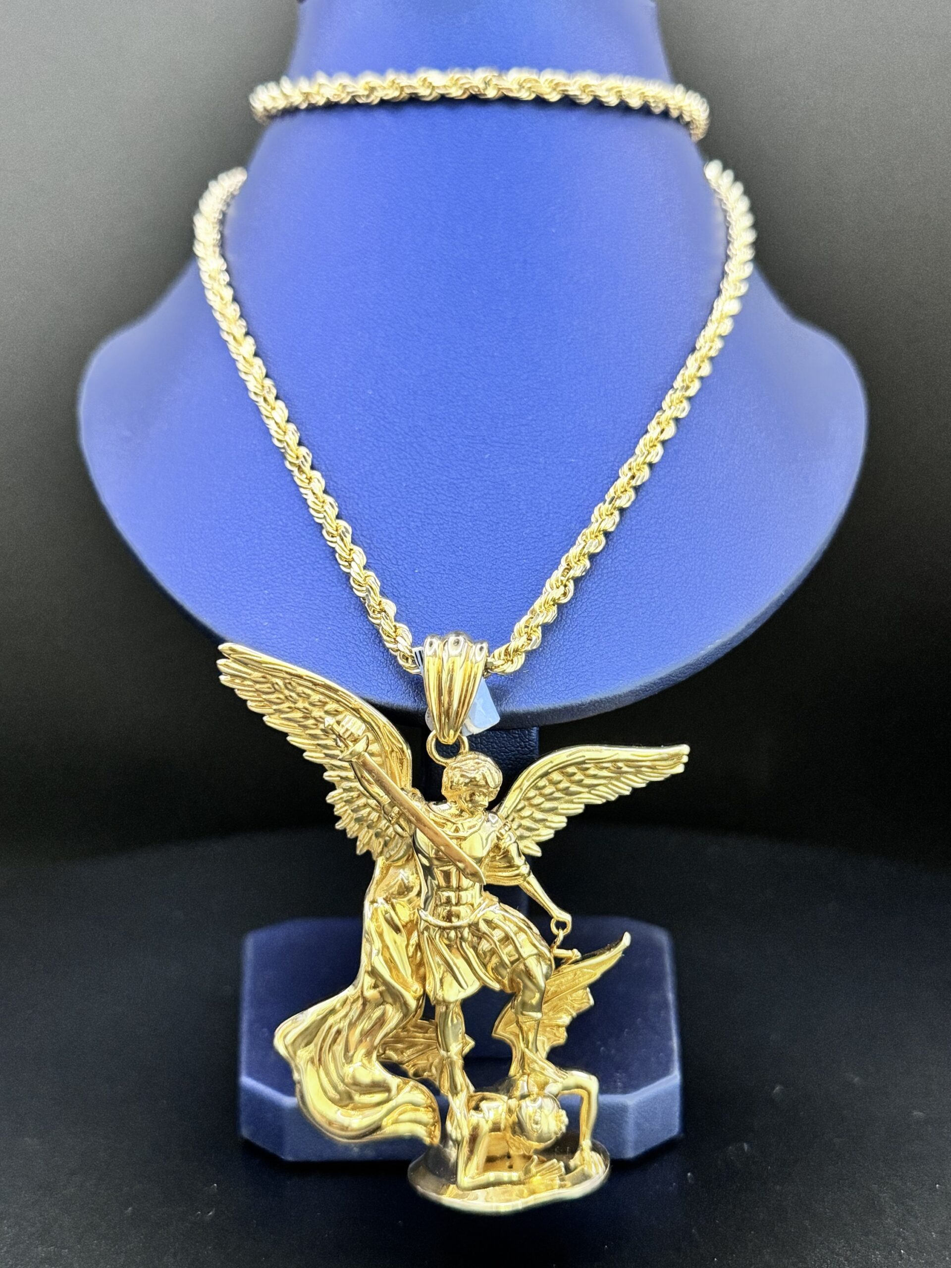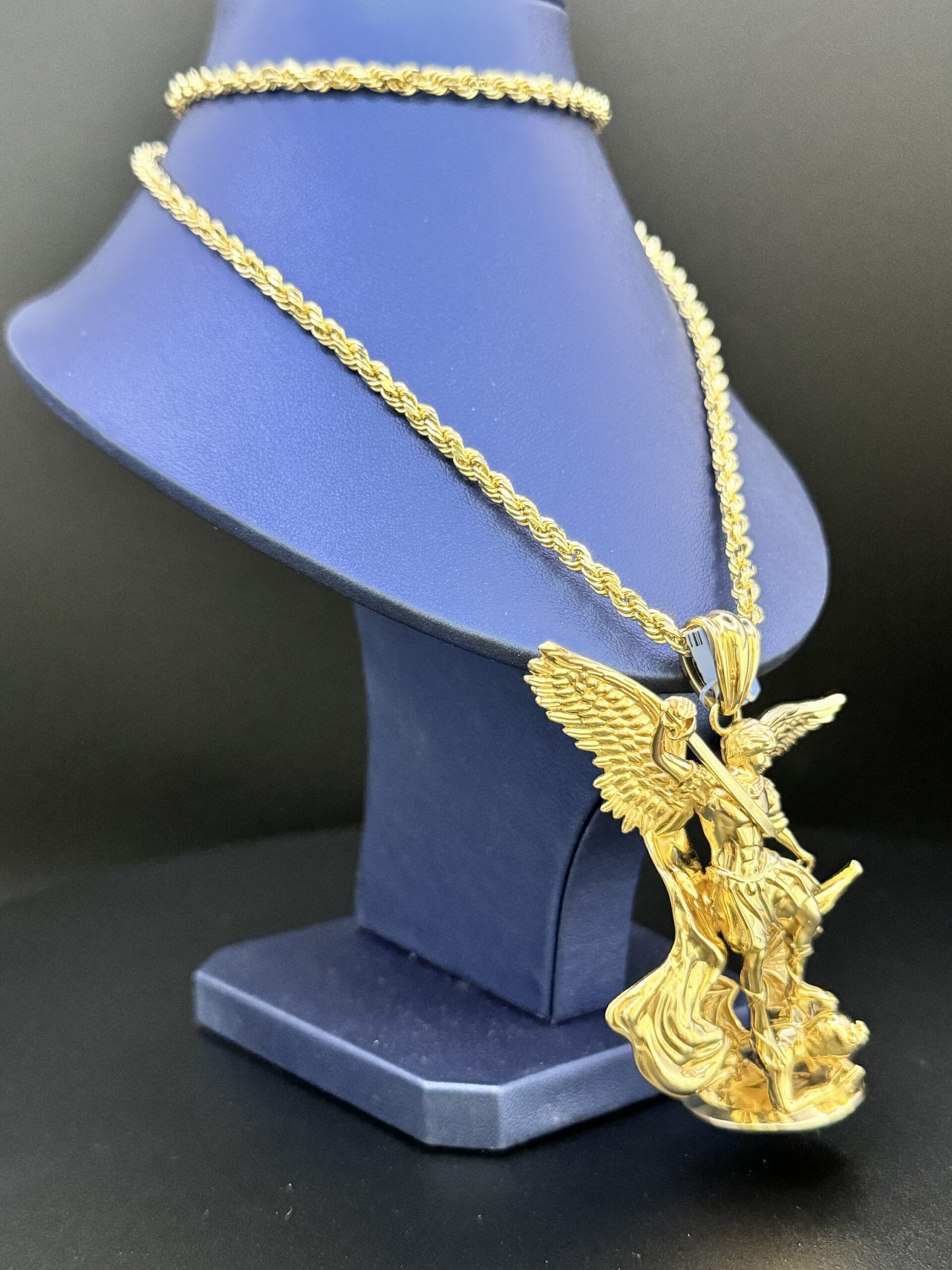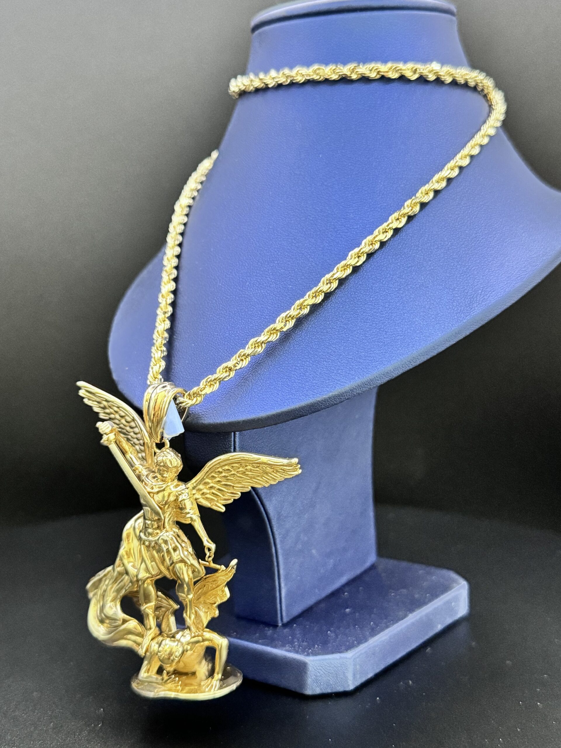 14KT Solid Gold St.Michael Pendant ComboSet Comes With 3.5MM DiaCut 14Kt Rope Necklace 24″ Approx Gold For Pendant 47.2 Gram Necklace 30.4 Gram 2.75″ Tall By 2.25″ Width