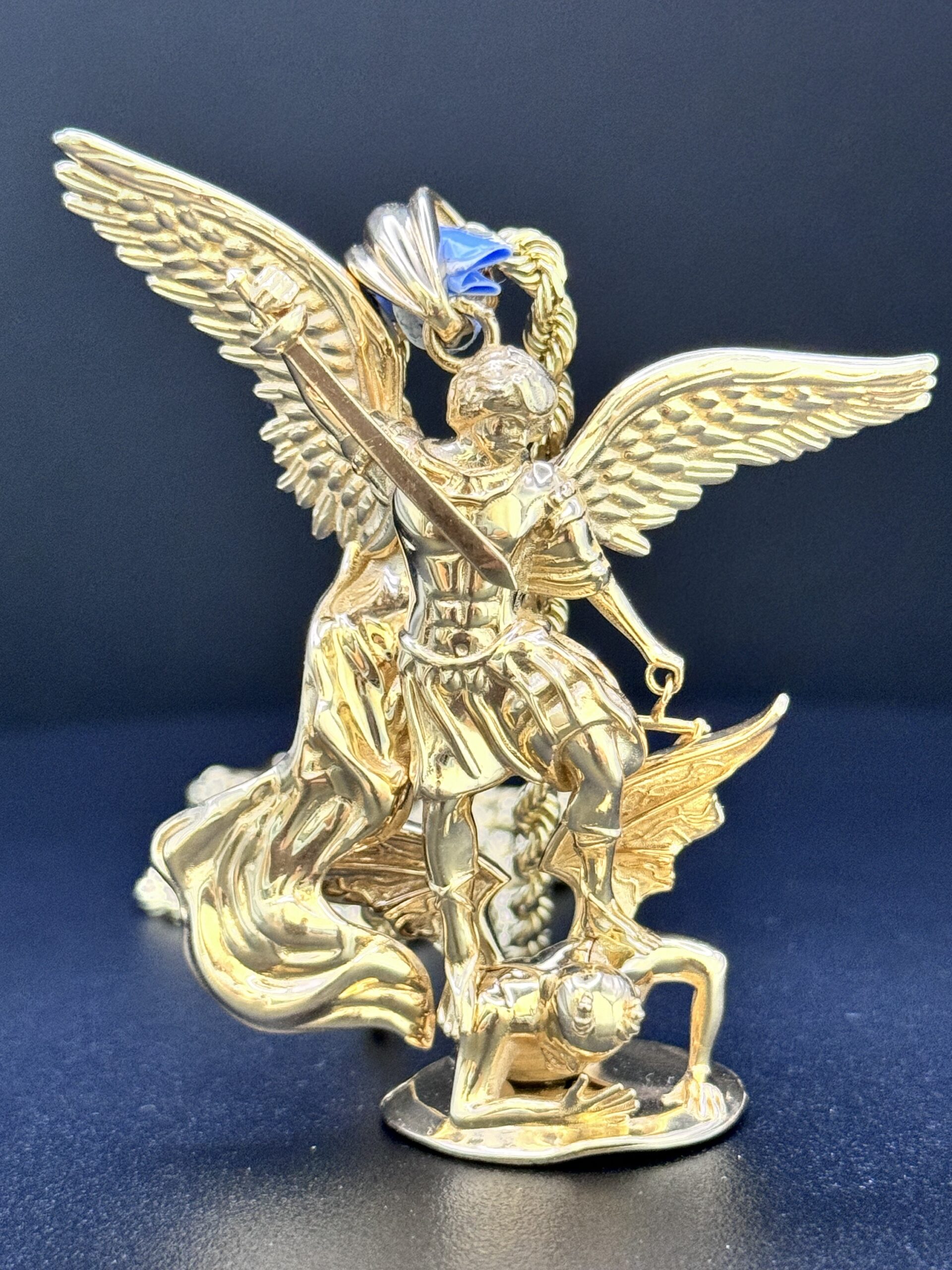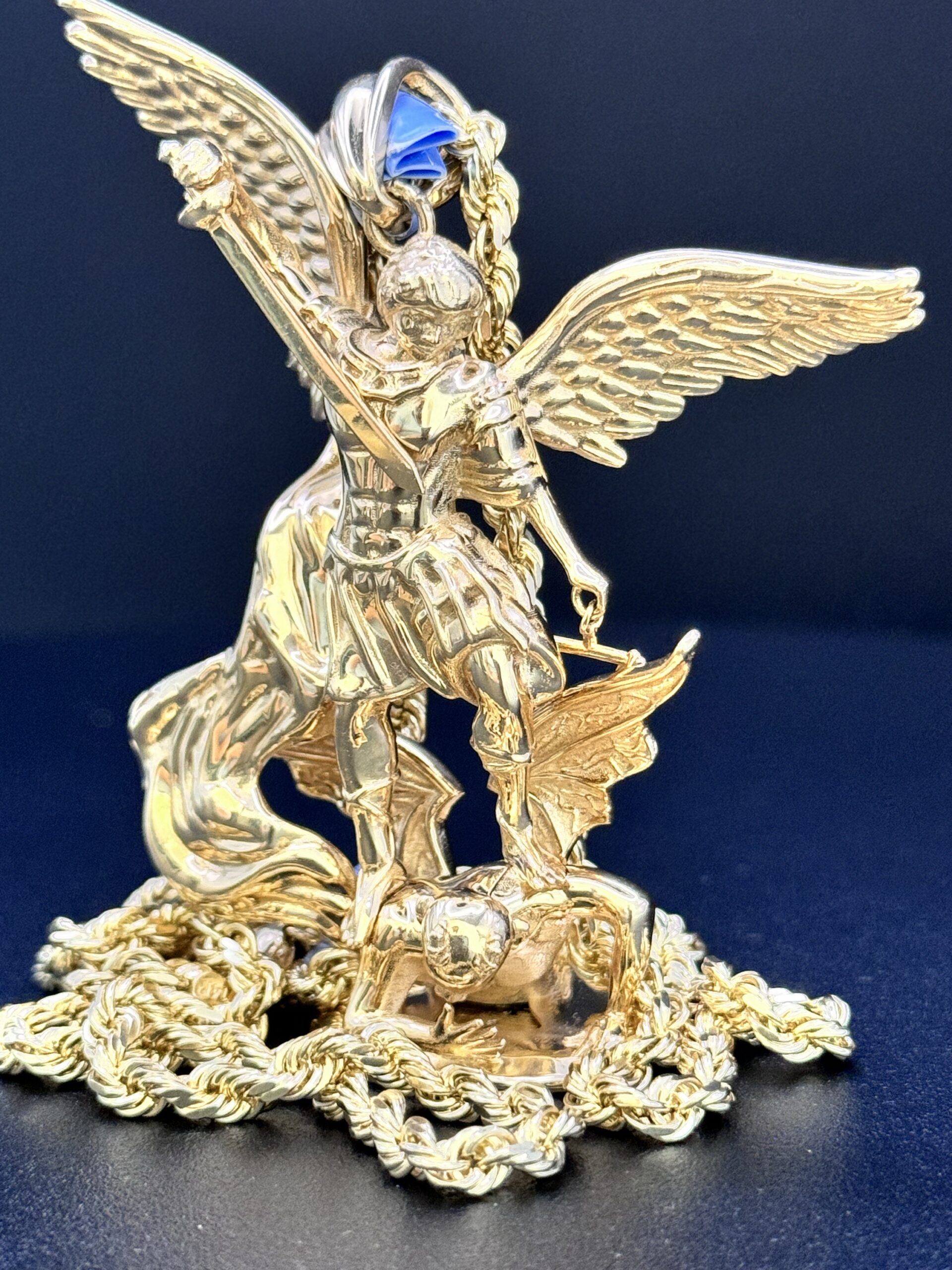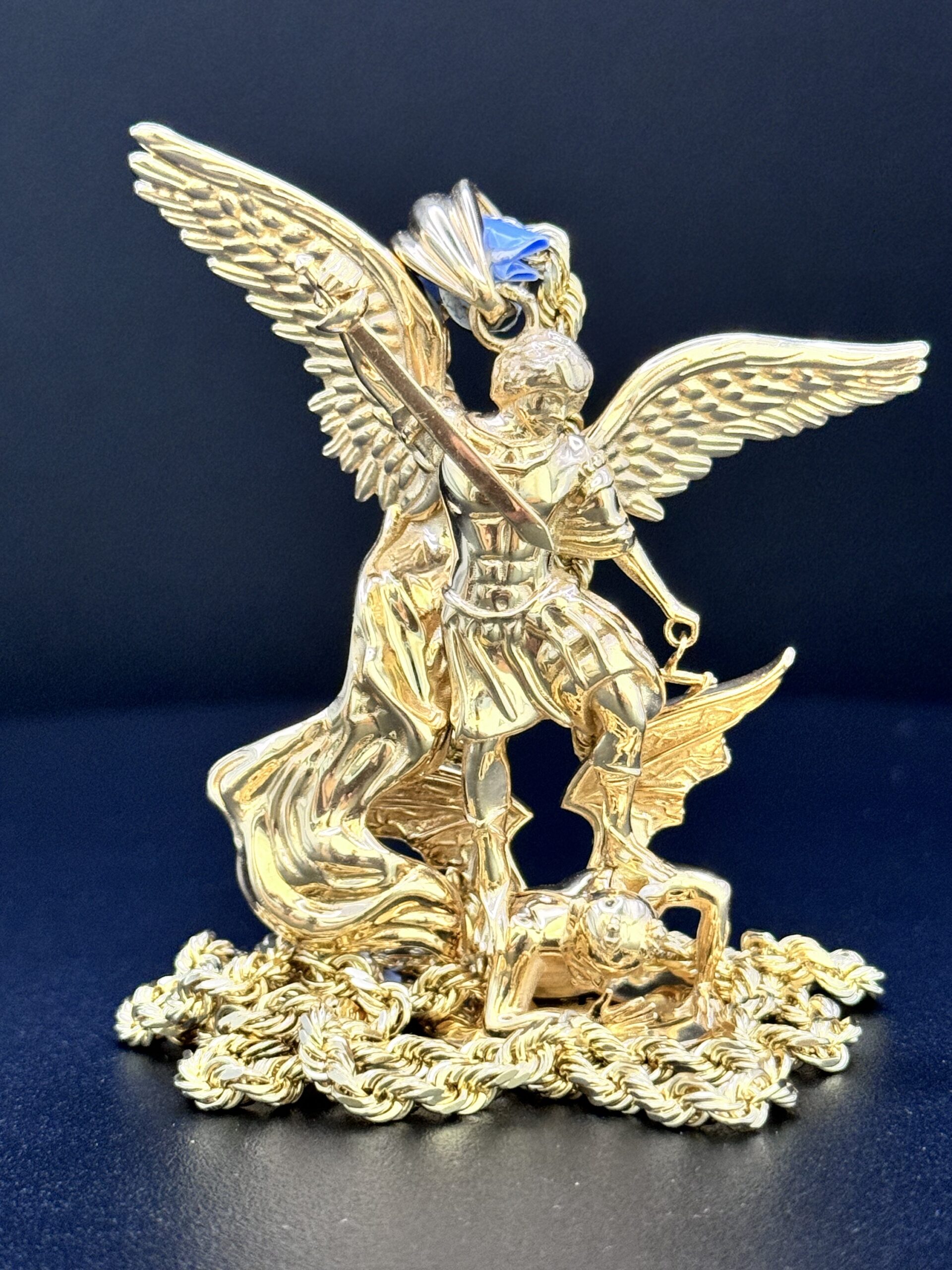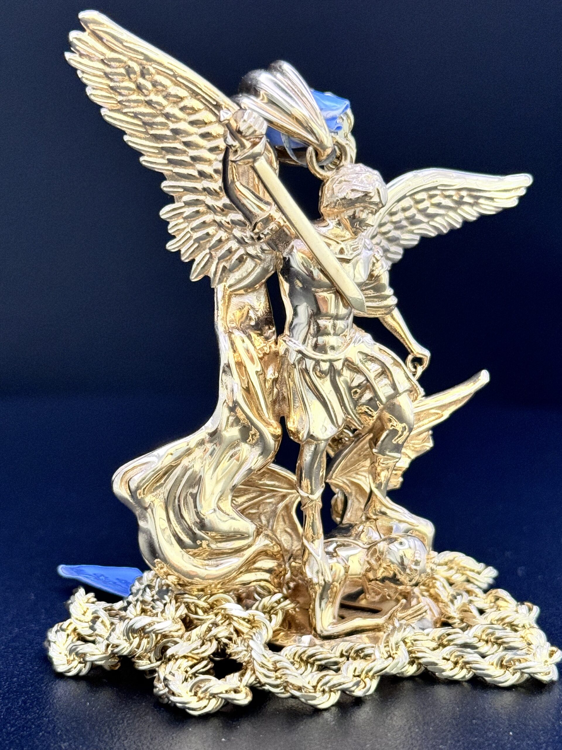 14KT Solid Gold St.Michael Pendant ComboSet Comes With 3.5MM DiaCut 14Kt Rope Necklace 24″ Approx Gold For Pendant 47.2 Gram Necklace 30.4 Gram 2.75″ Tall By 2.25″ Width