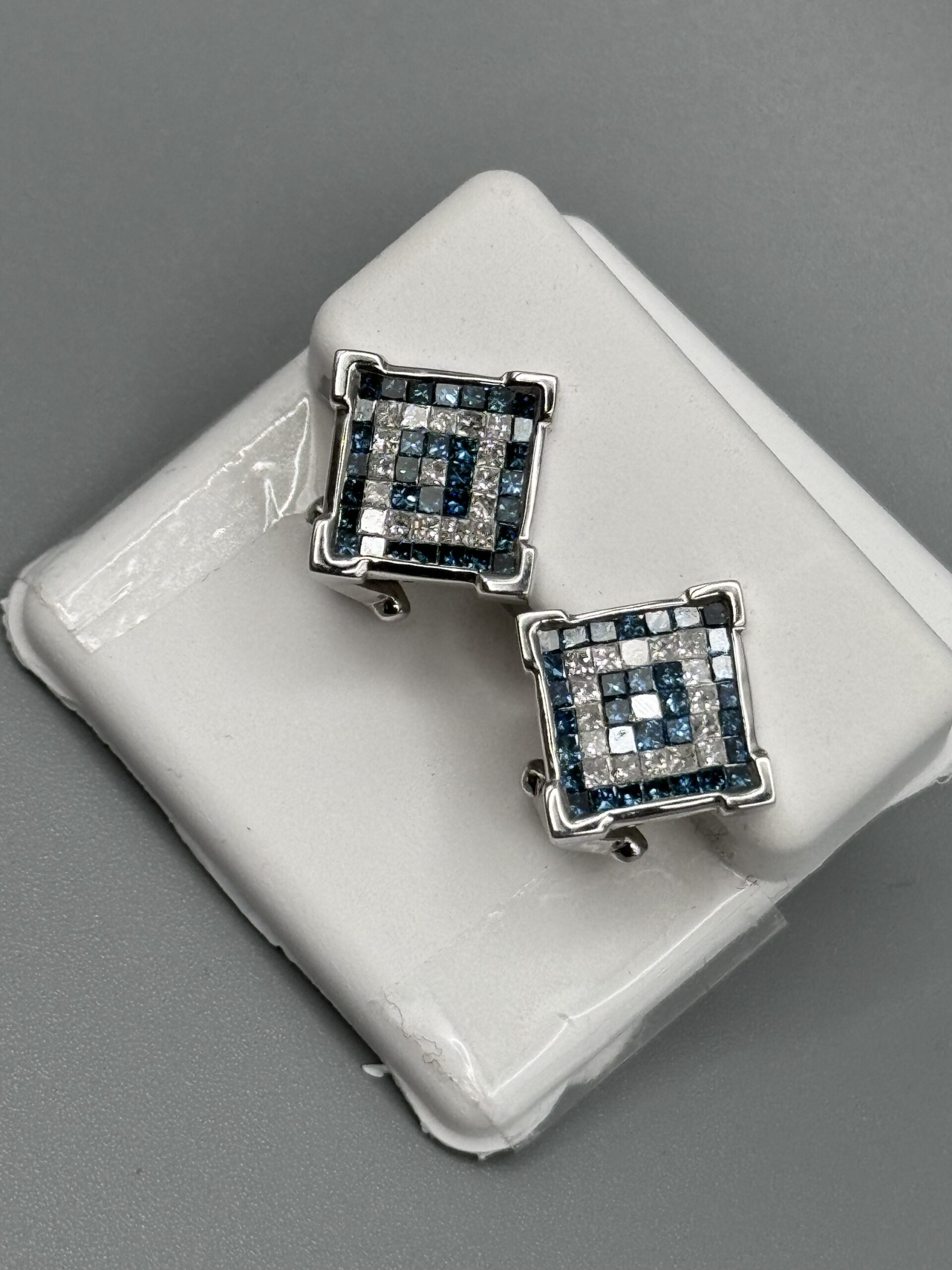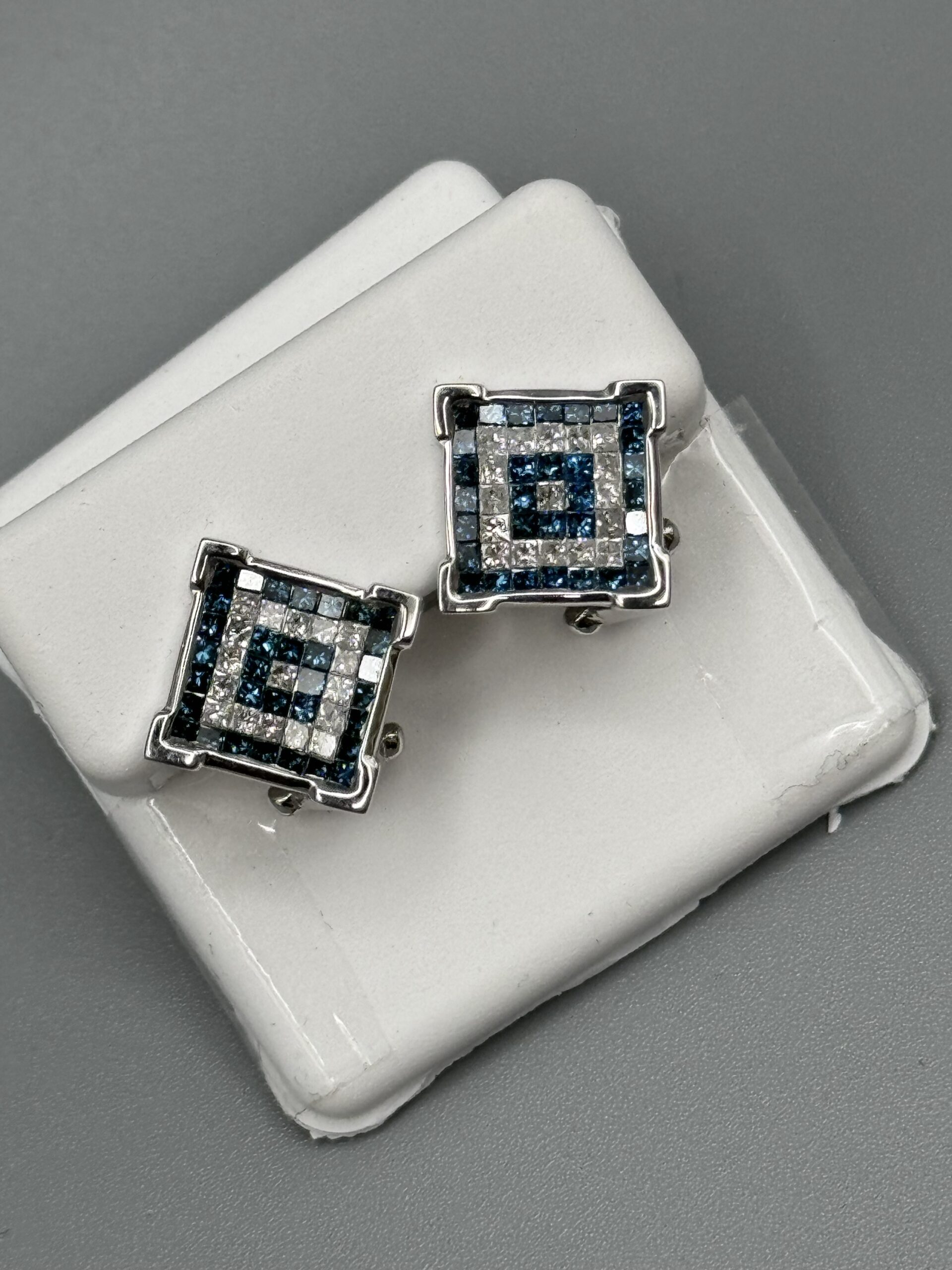 Elevate your style with these 14KT white gold earrings featuring 2.00CT blue and white diamonds, invisibly set for a seamless shine. At 12MM width, they perfectly blend elegance with ease.