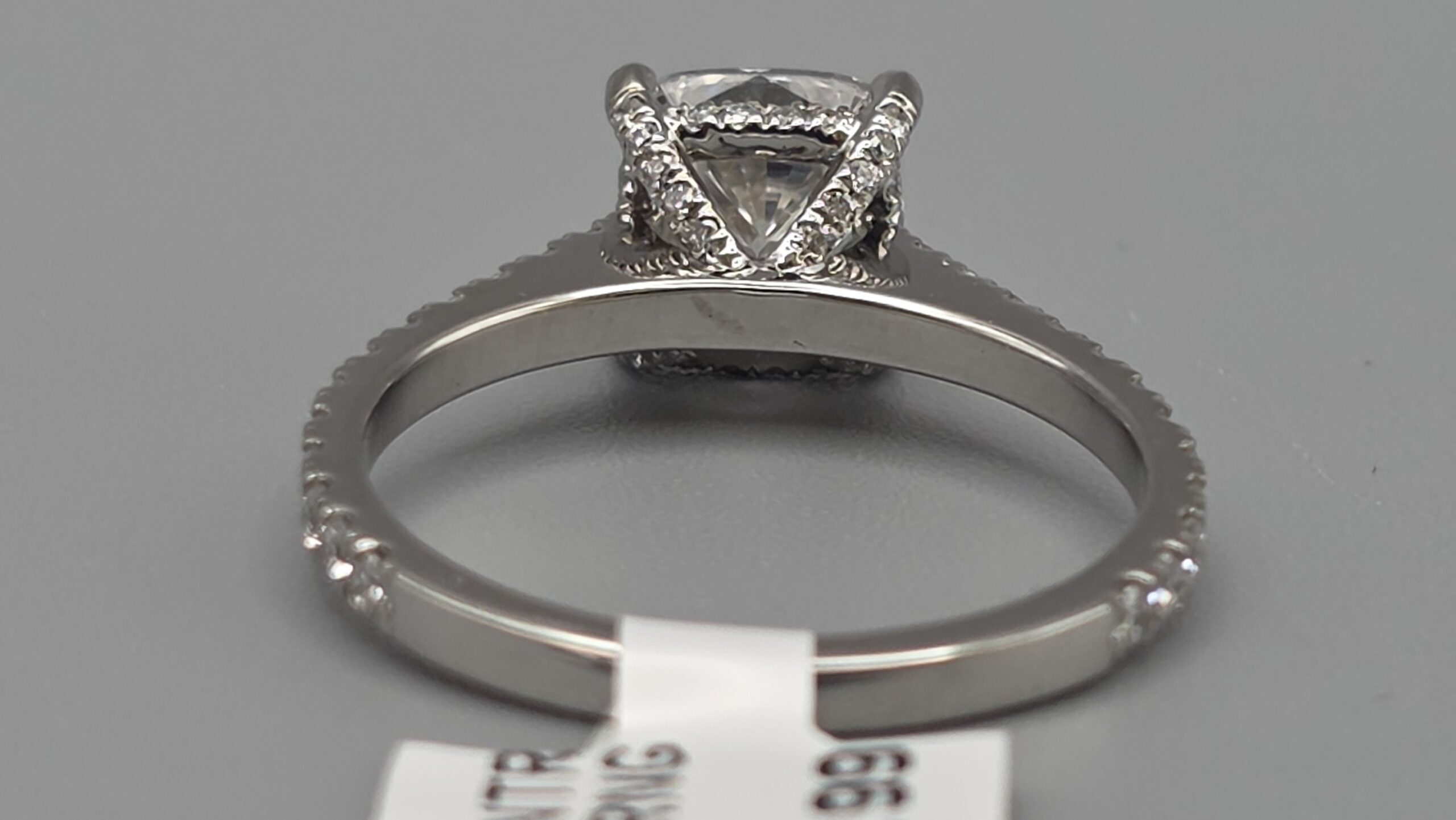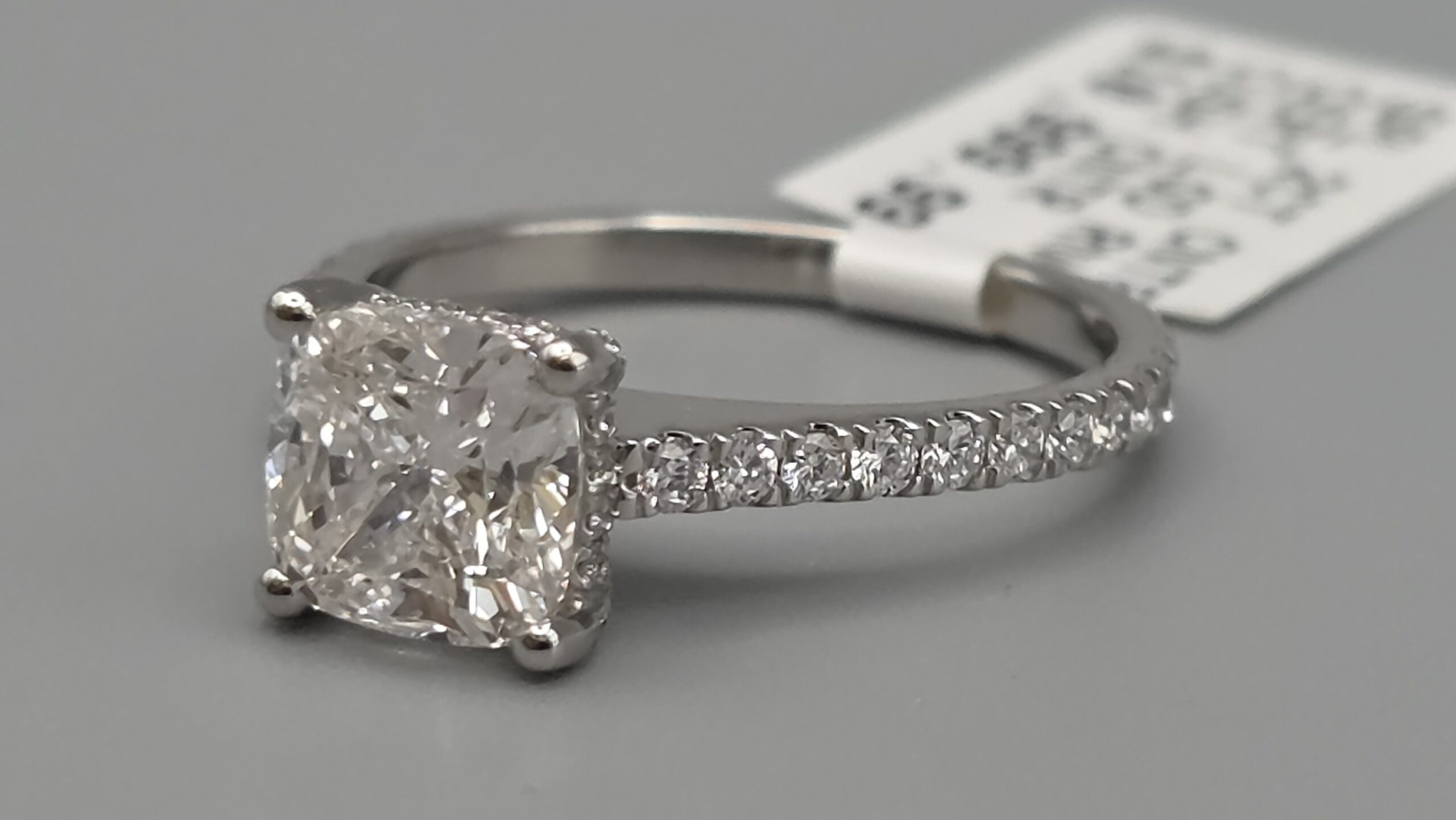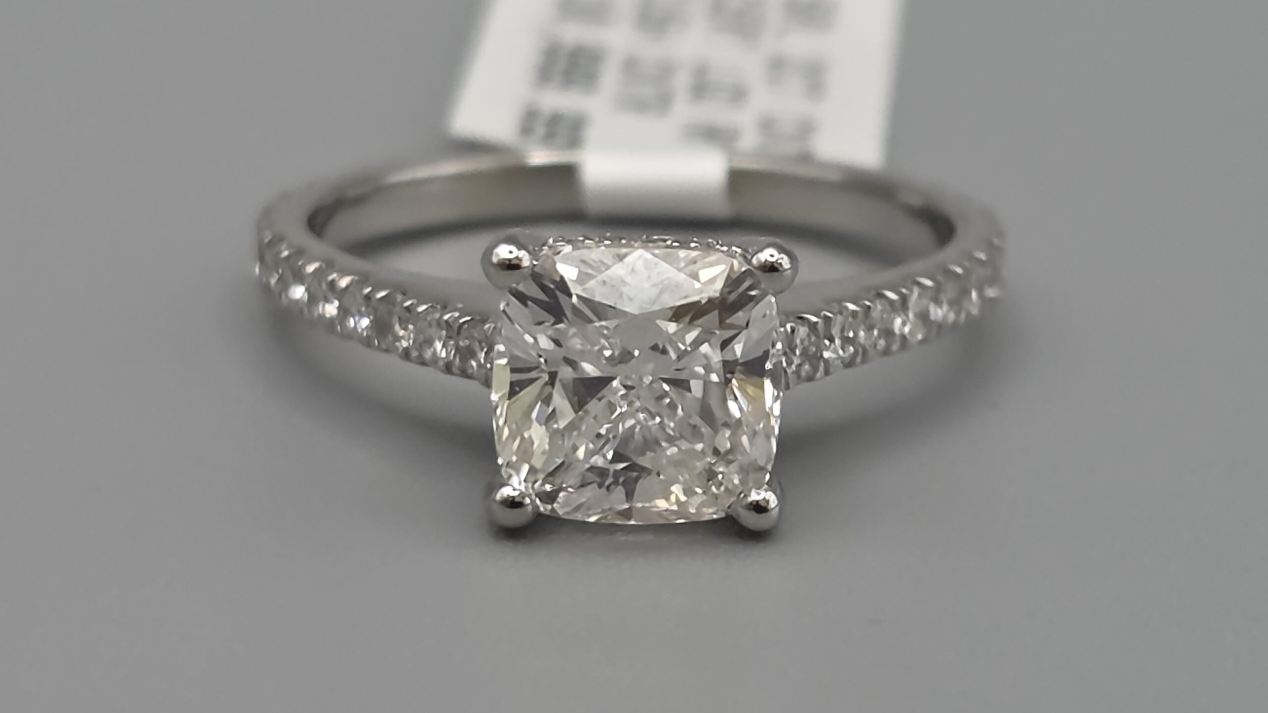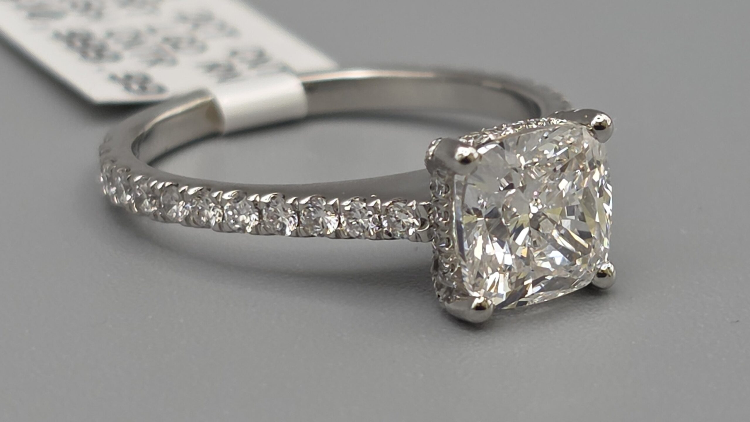This stunning 14KT white gold ring features a dazzling 2.52CT cushion-cut diamond solitaire at its heart. Weighing 2.00CT, it boasts VS clarity and E-F color. Sized at 7, it’s sure to shine!