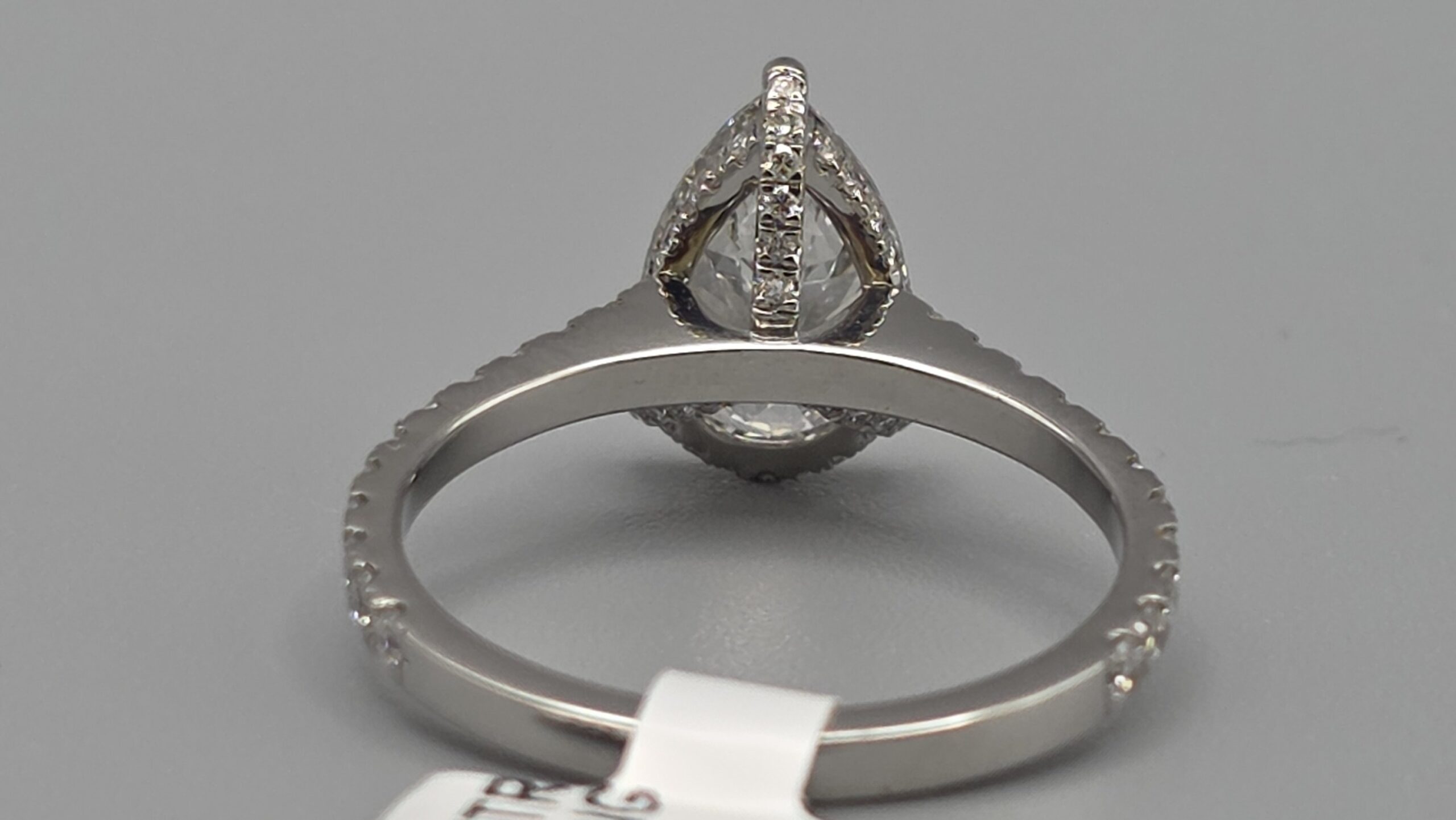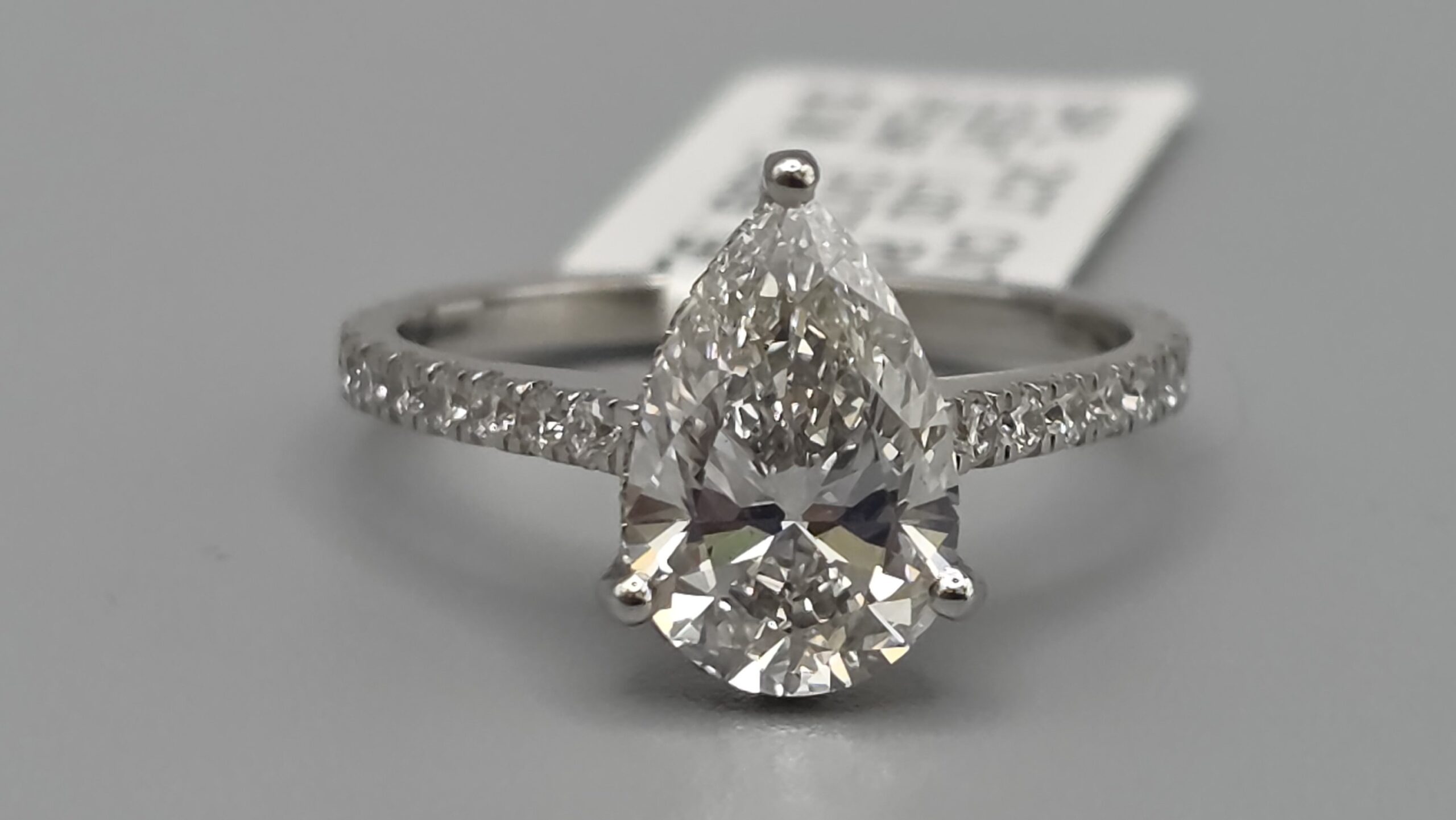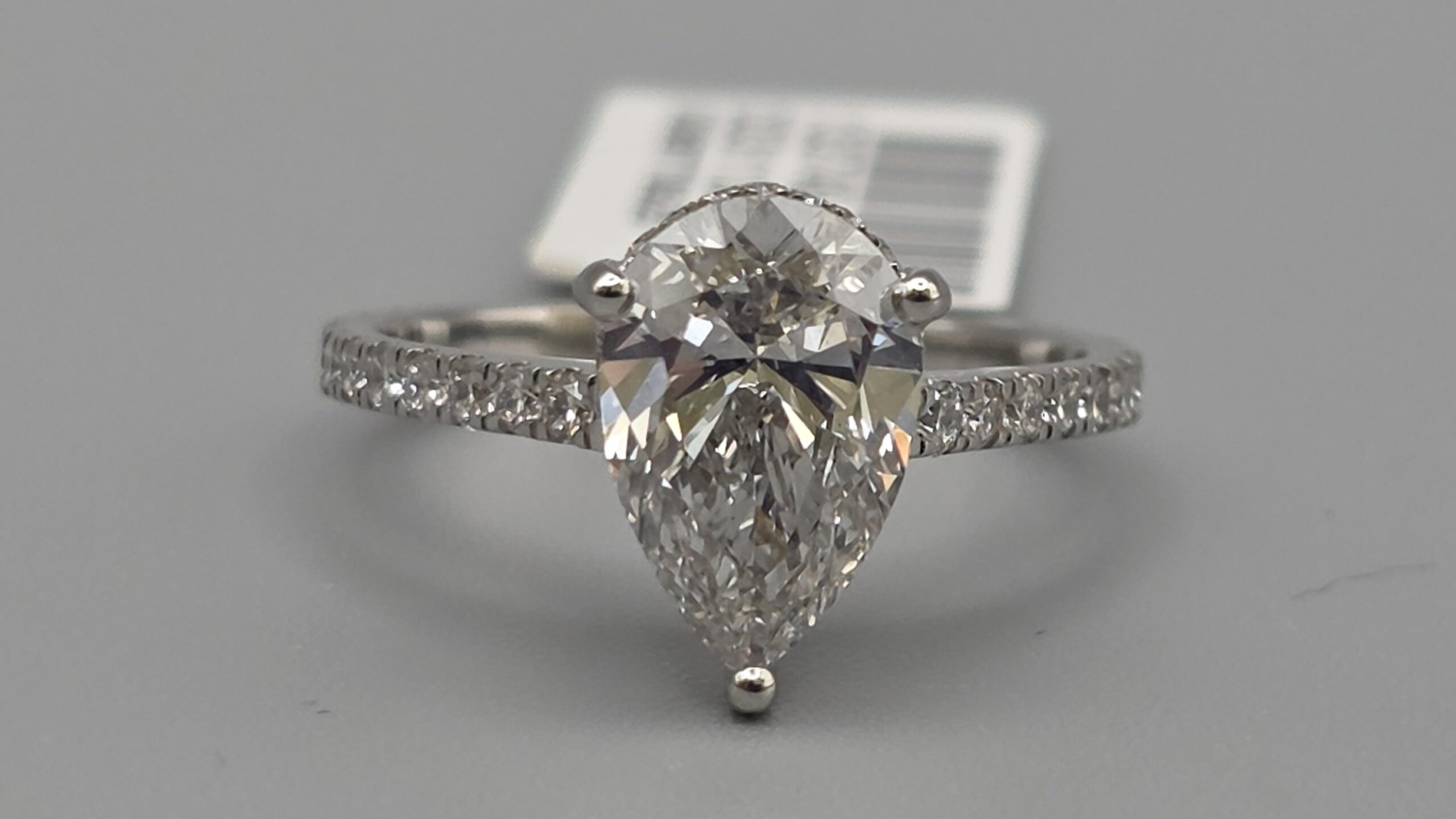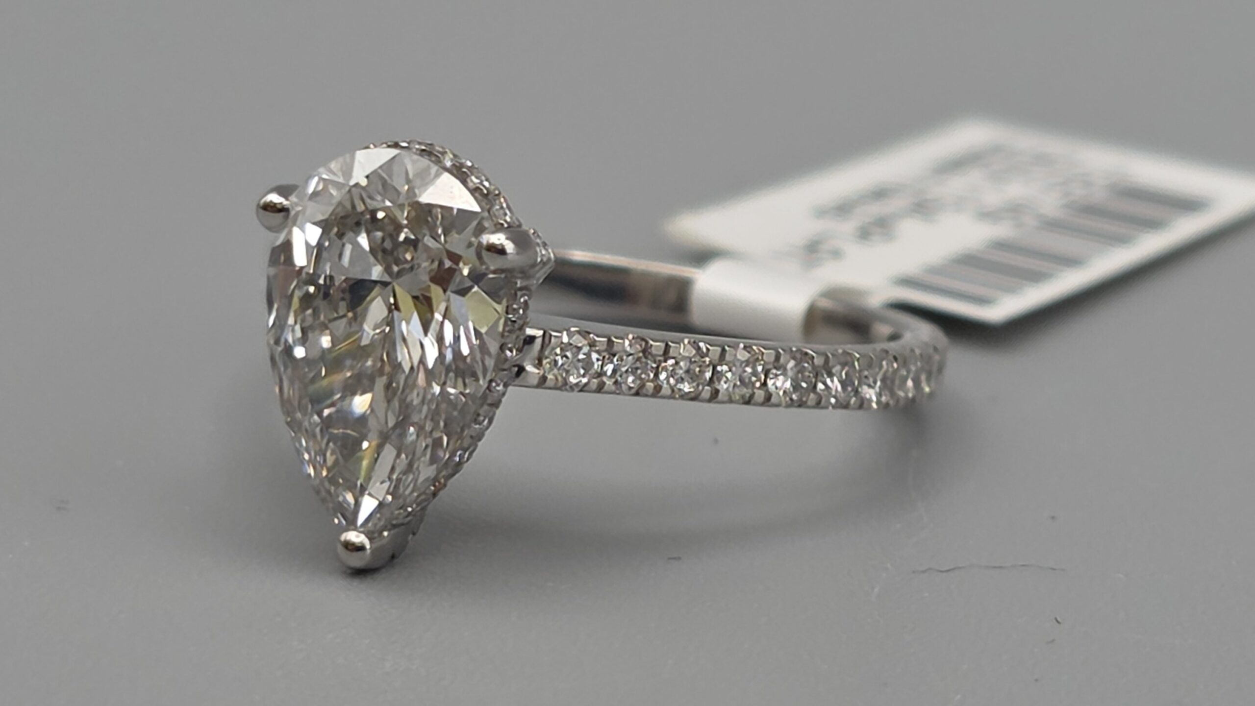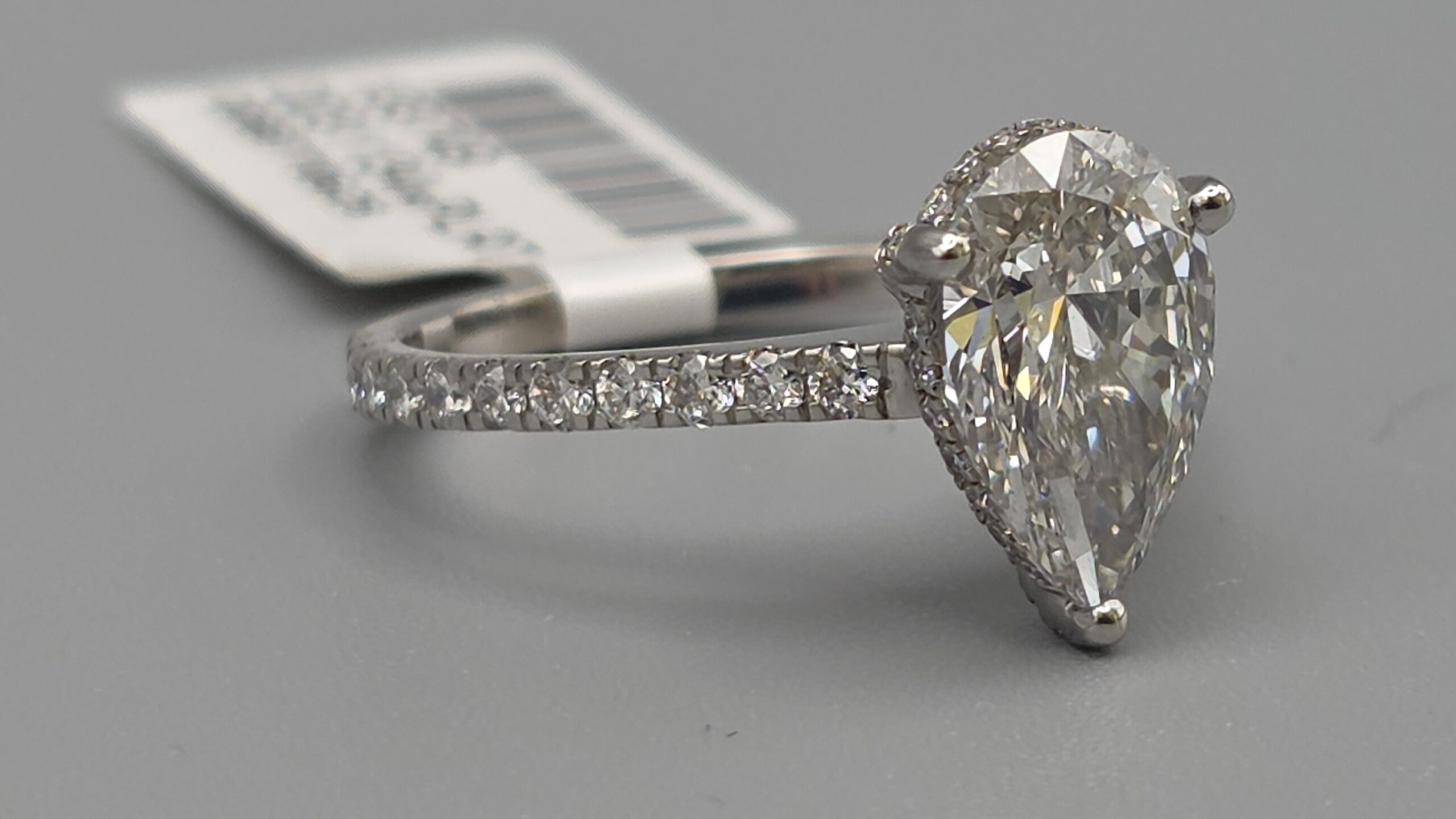 Unlock elegance with this stunning 14KT white gold ring featuring a 2.57CT pear-cut diamond. The 2.00CT center stone boasts VS clarity and E-F color, all while sizing options are available!✨