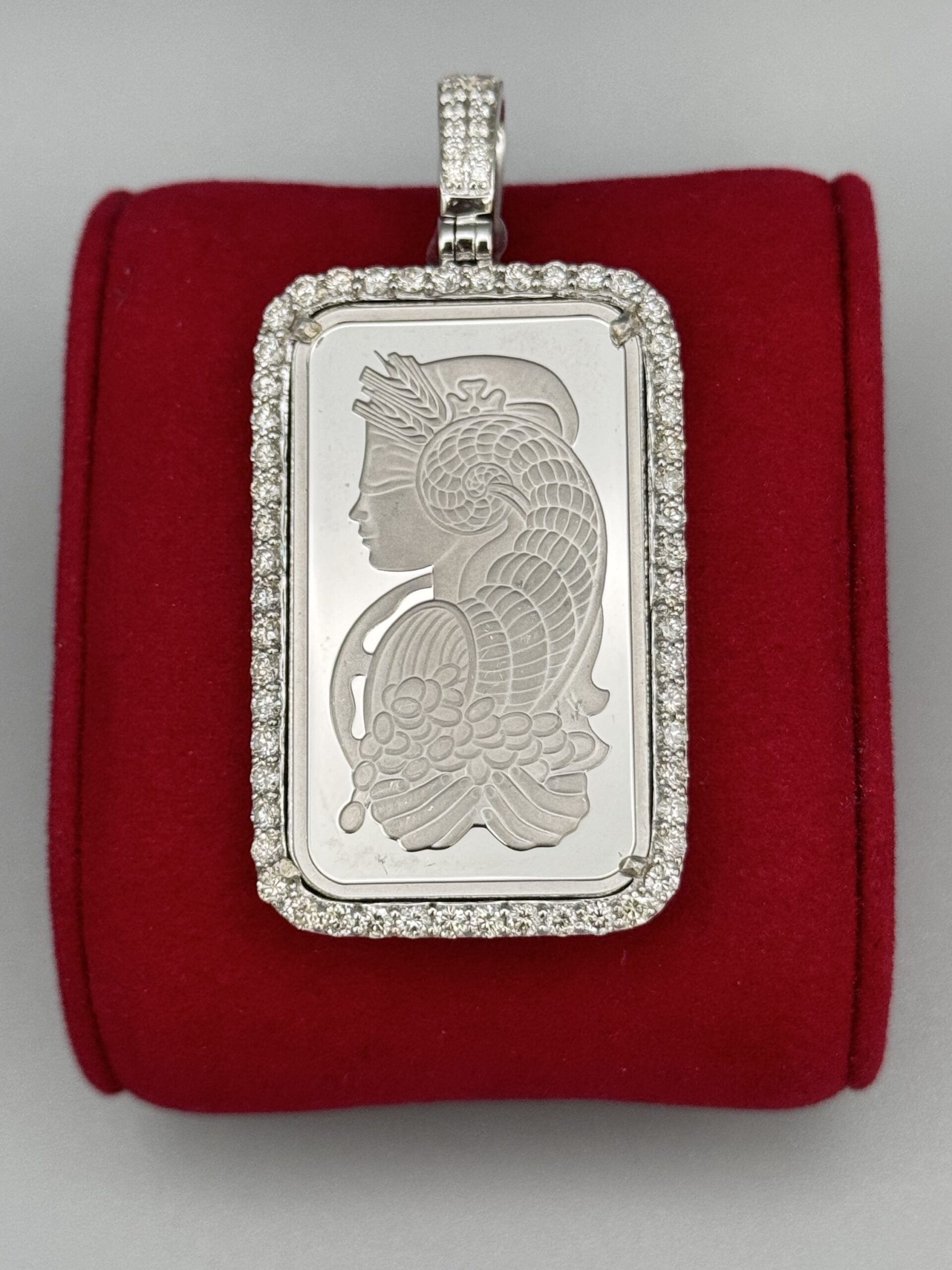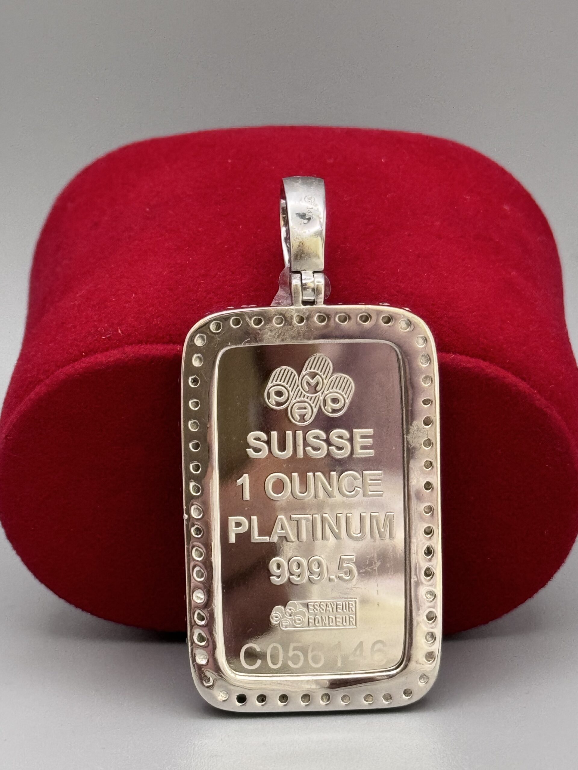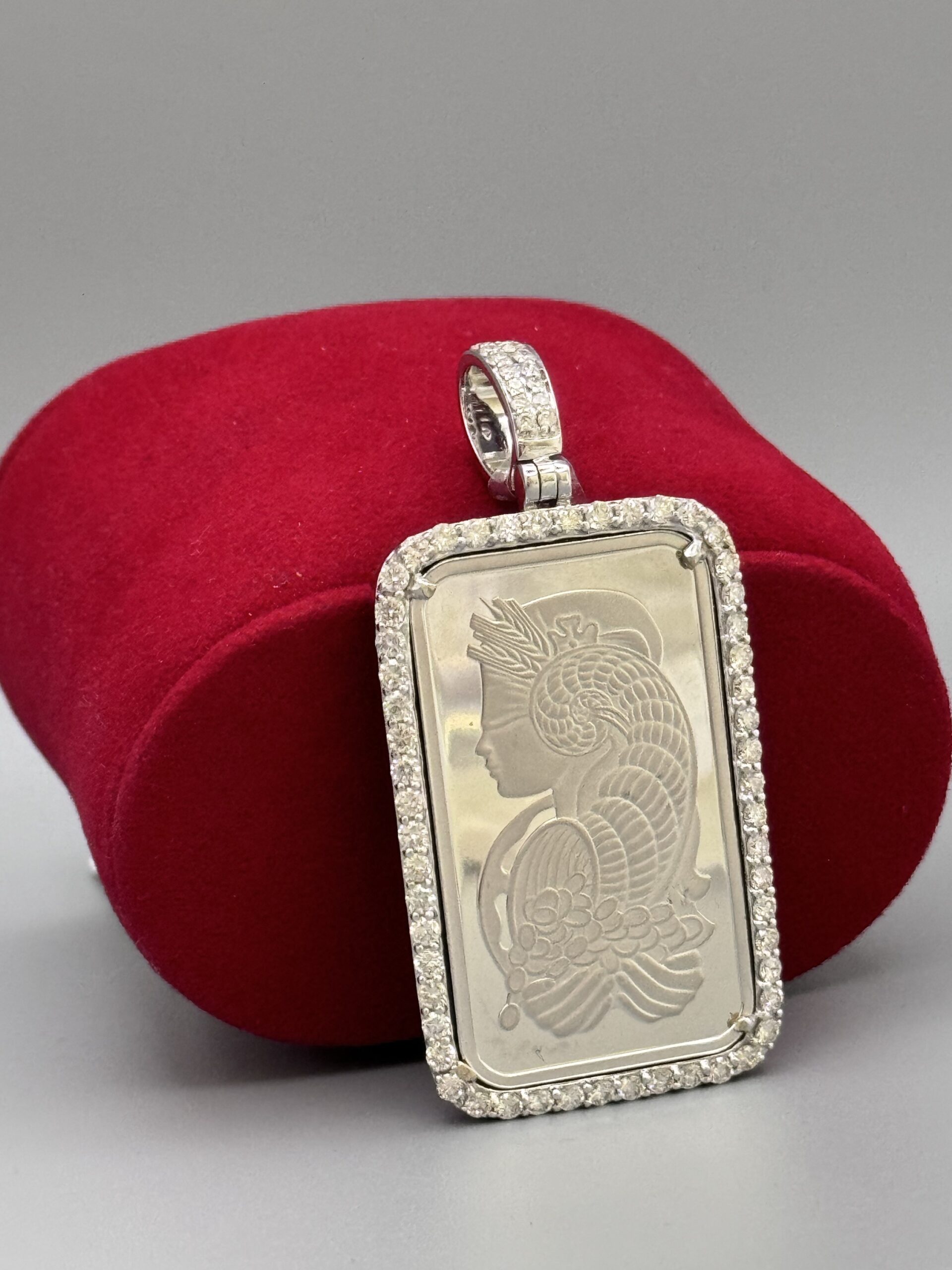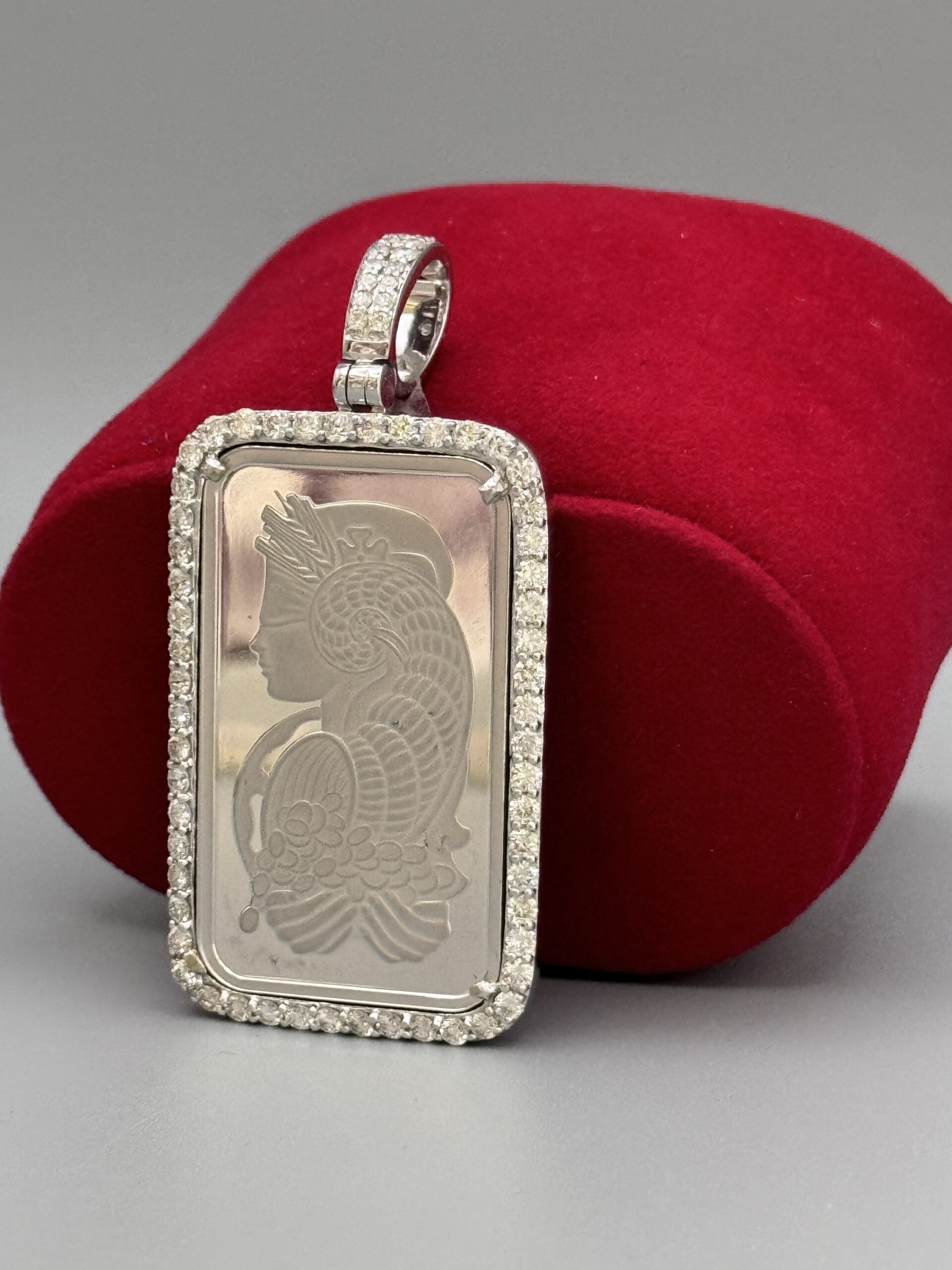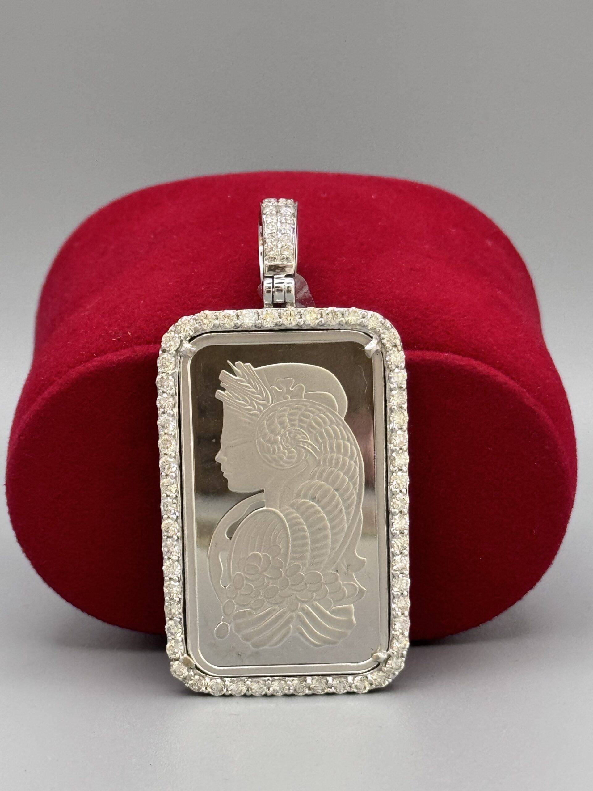 14Kt W/Gold 2.85CT Diamond Bezel 1 Ounce Platinum Bar Pendant 2.5″ Tall By 1.15″ Wide All Genuine VS Clarity Diamond’s Around The Bezel Approx Gold Weight Includes Bezel 48.00 Gram 31.1 Gram Coin Weight
