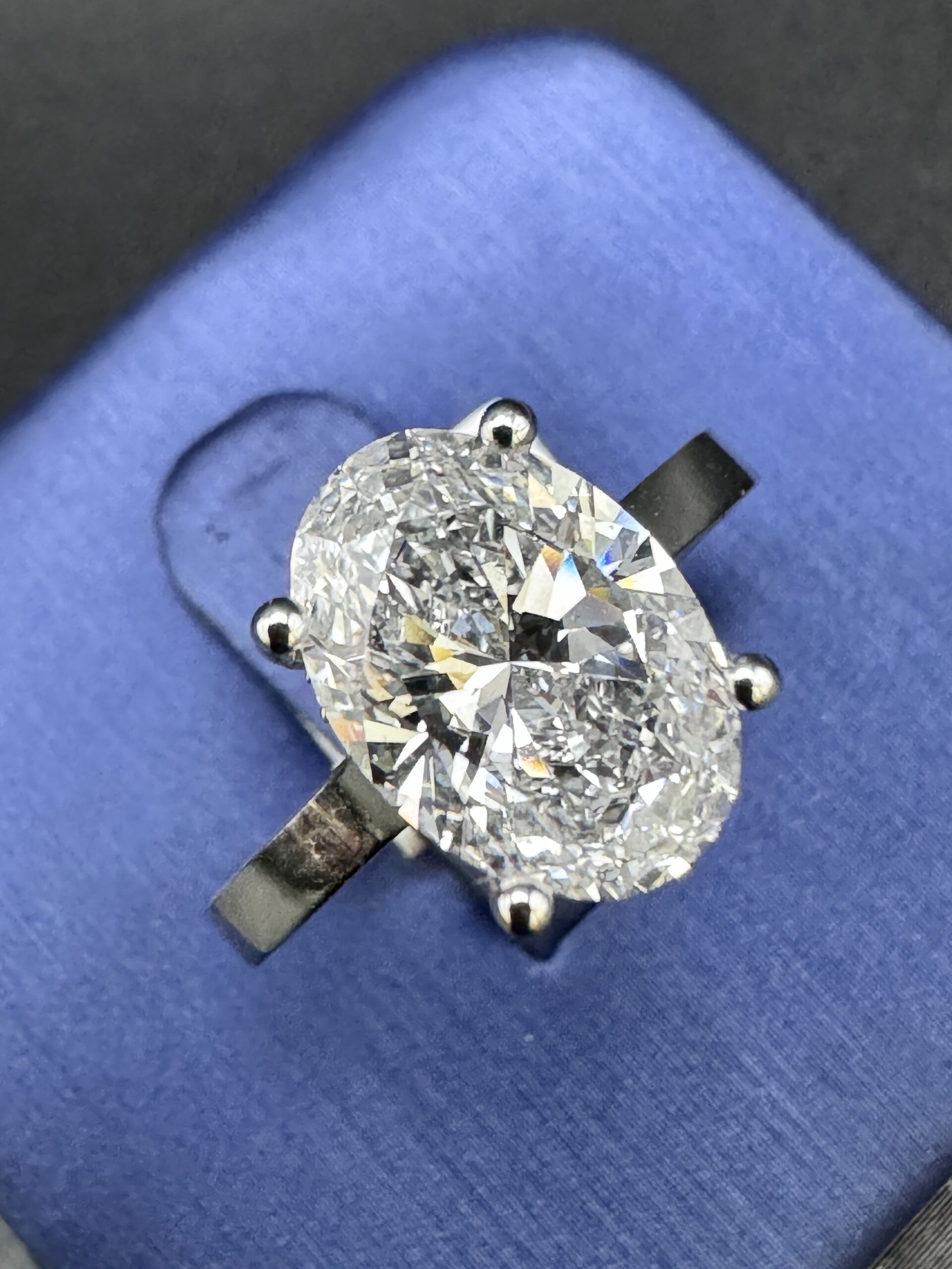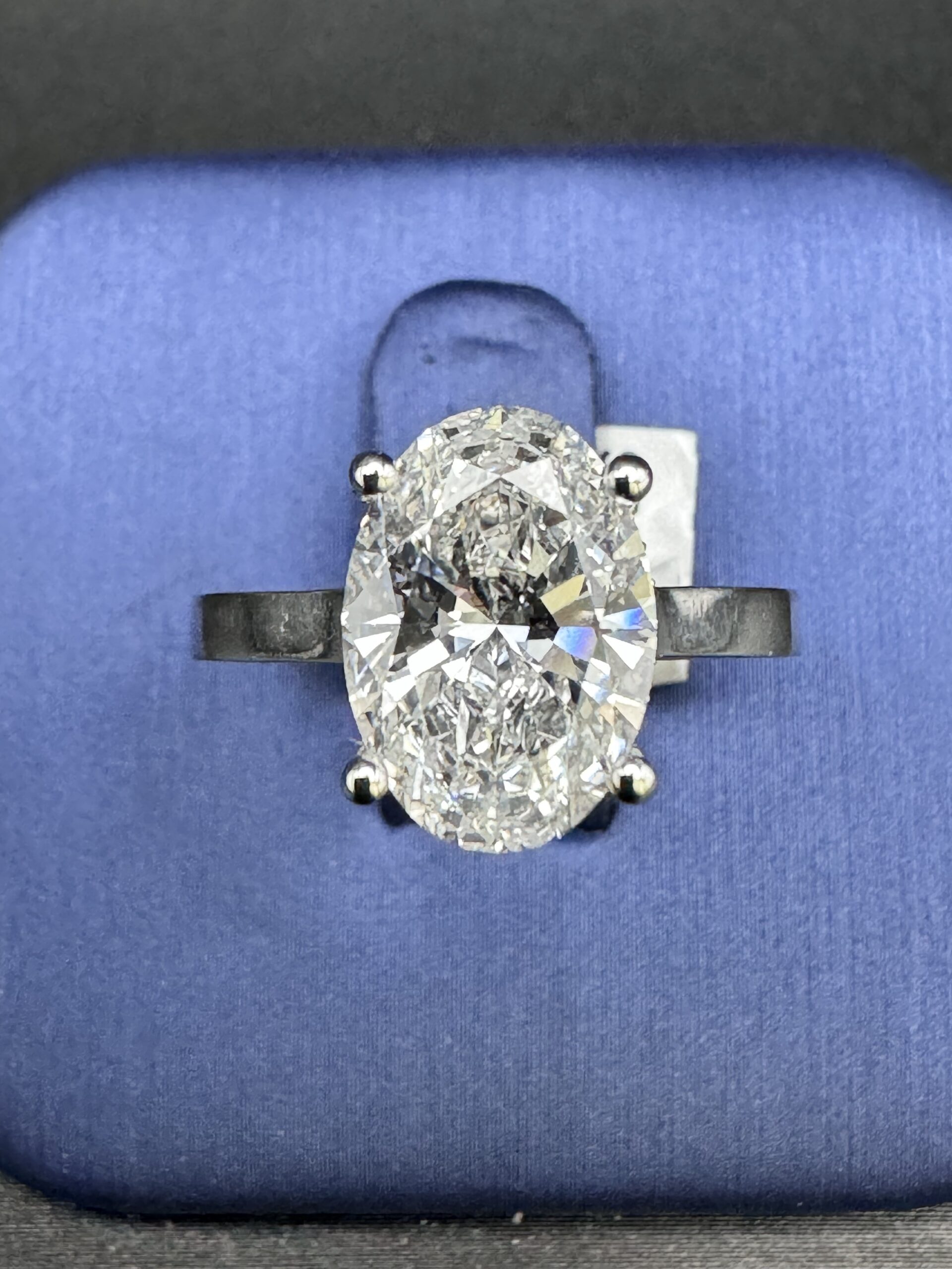 Shine bright with our 14KT White Gold Lab-Grown Diamond Solitaire Ring, featuring a stunning 3.10CTW diamond (12MM x 9MM) set on a 3.8-gram gold band. Comes in size 7 with a VS F color certificate!