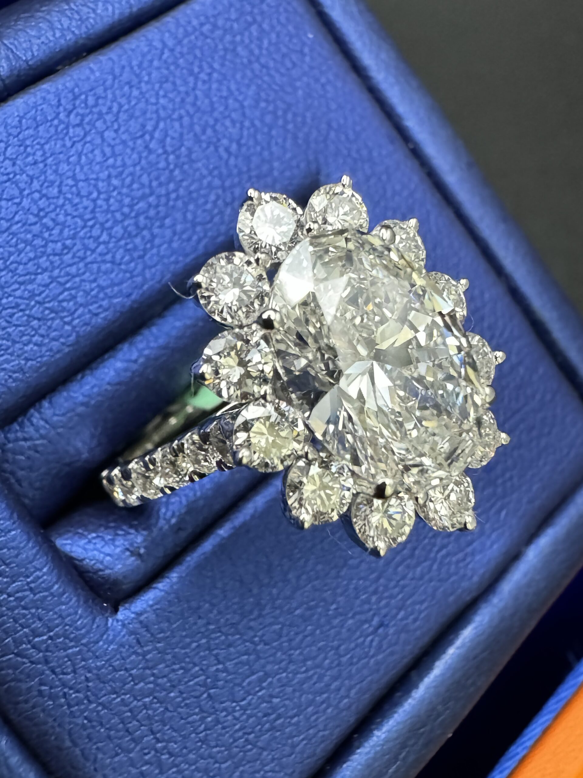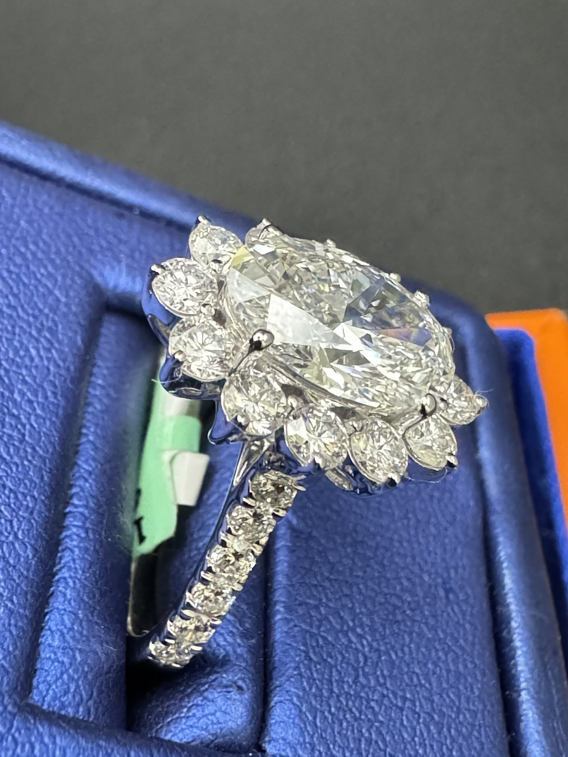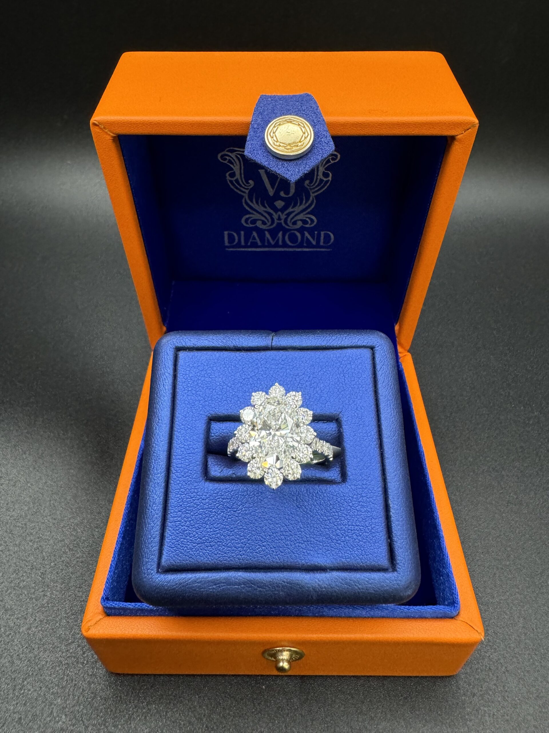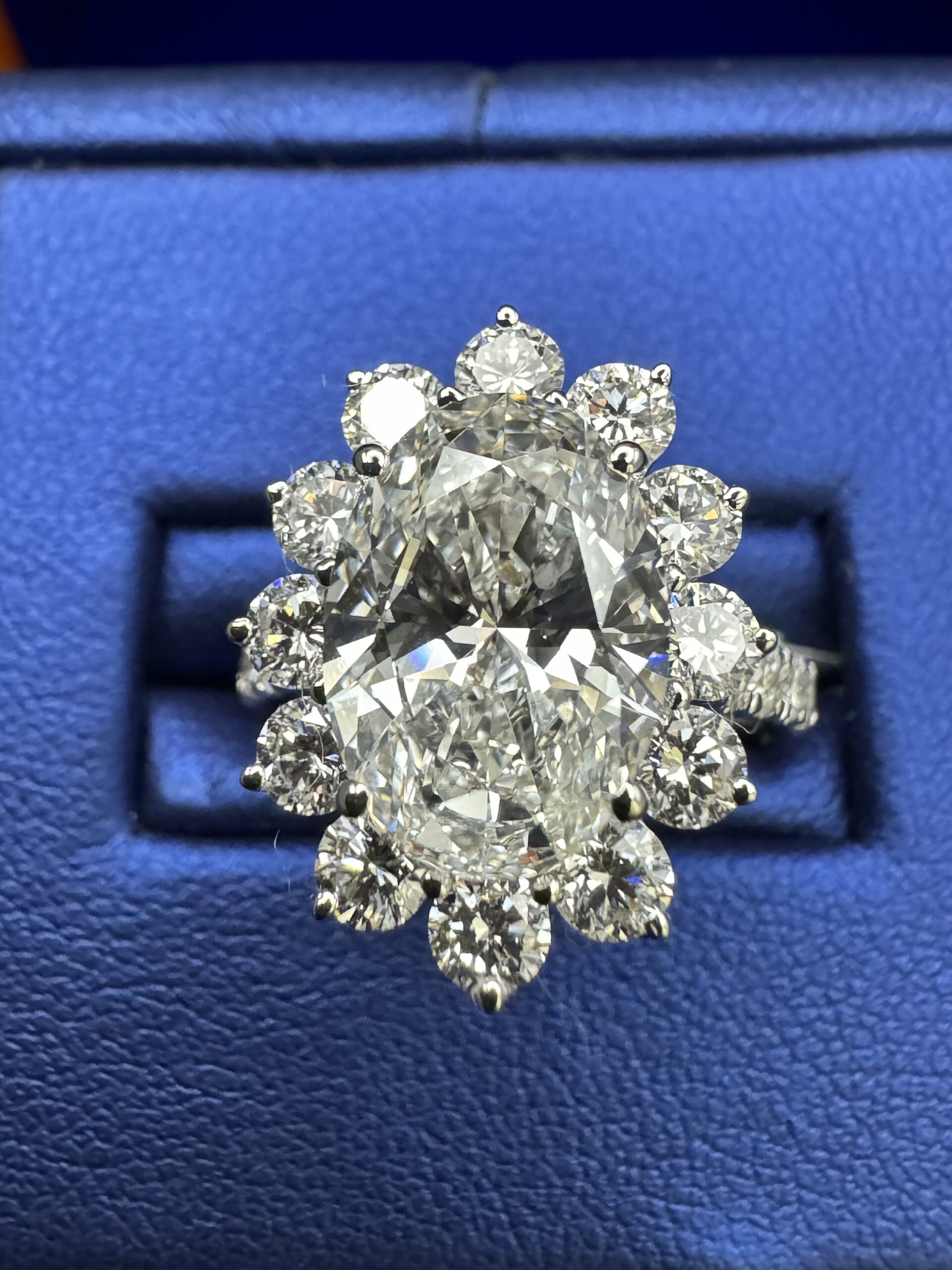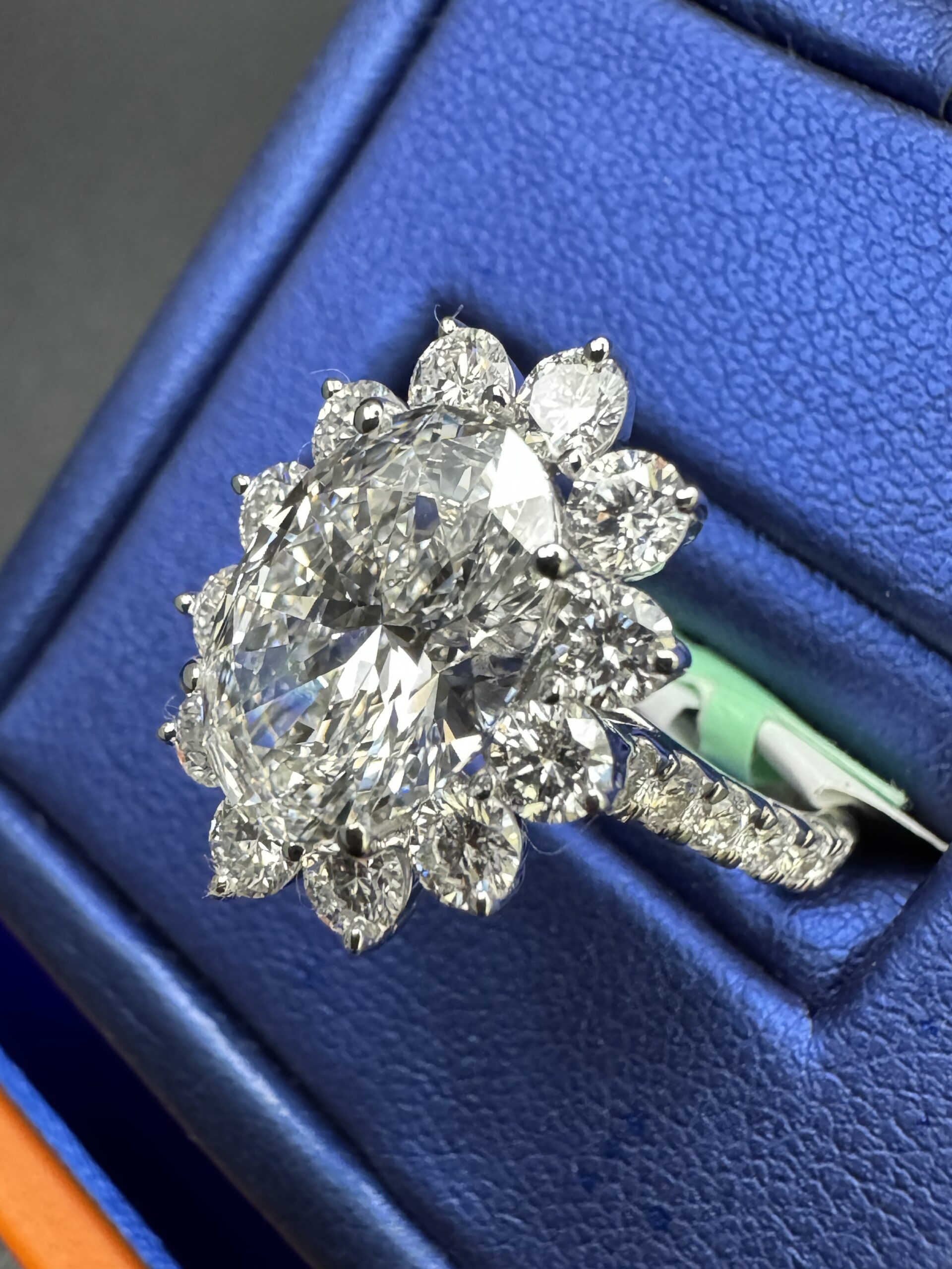 14KT W/Gold 4.62CT LGD Ladies Ring 3.00CT Center Oval Solitaire With Halo Flower Look Size 7 Approx Gold Weight 5.1 Gram Sizing Available Certified AVC’s Clarity