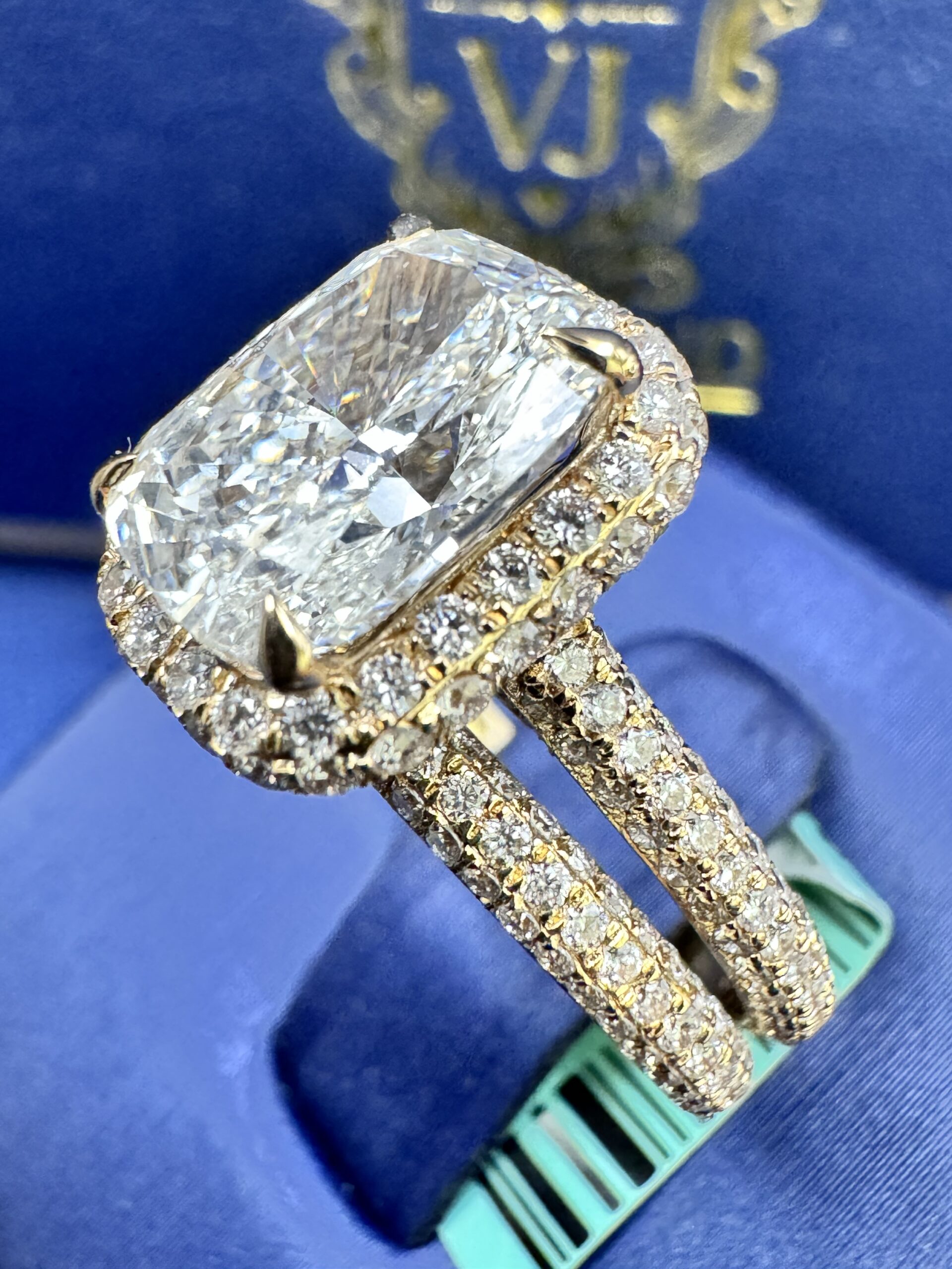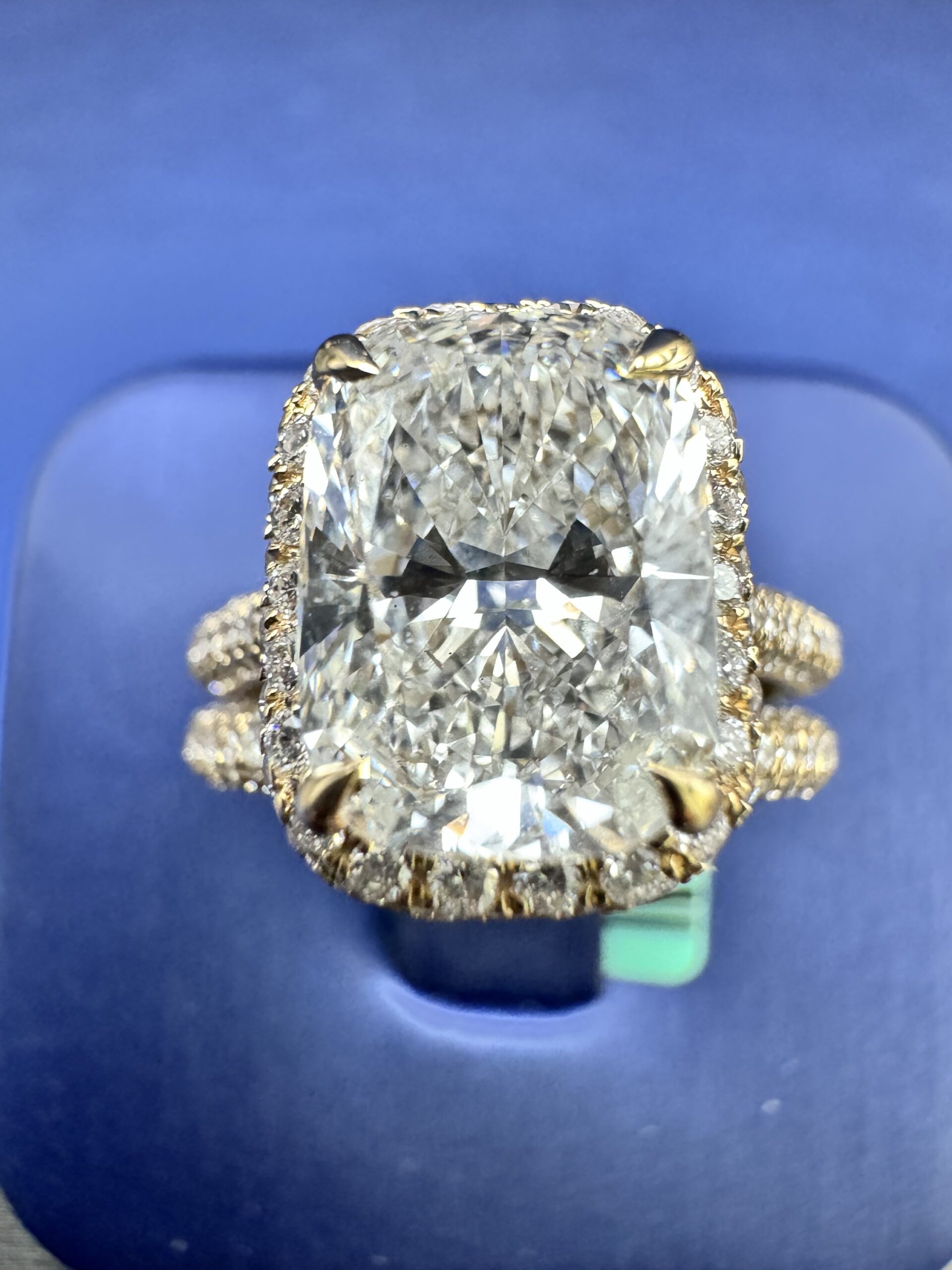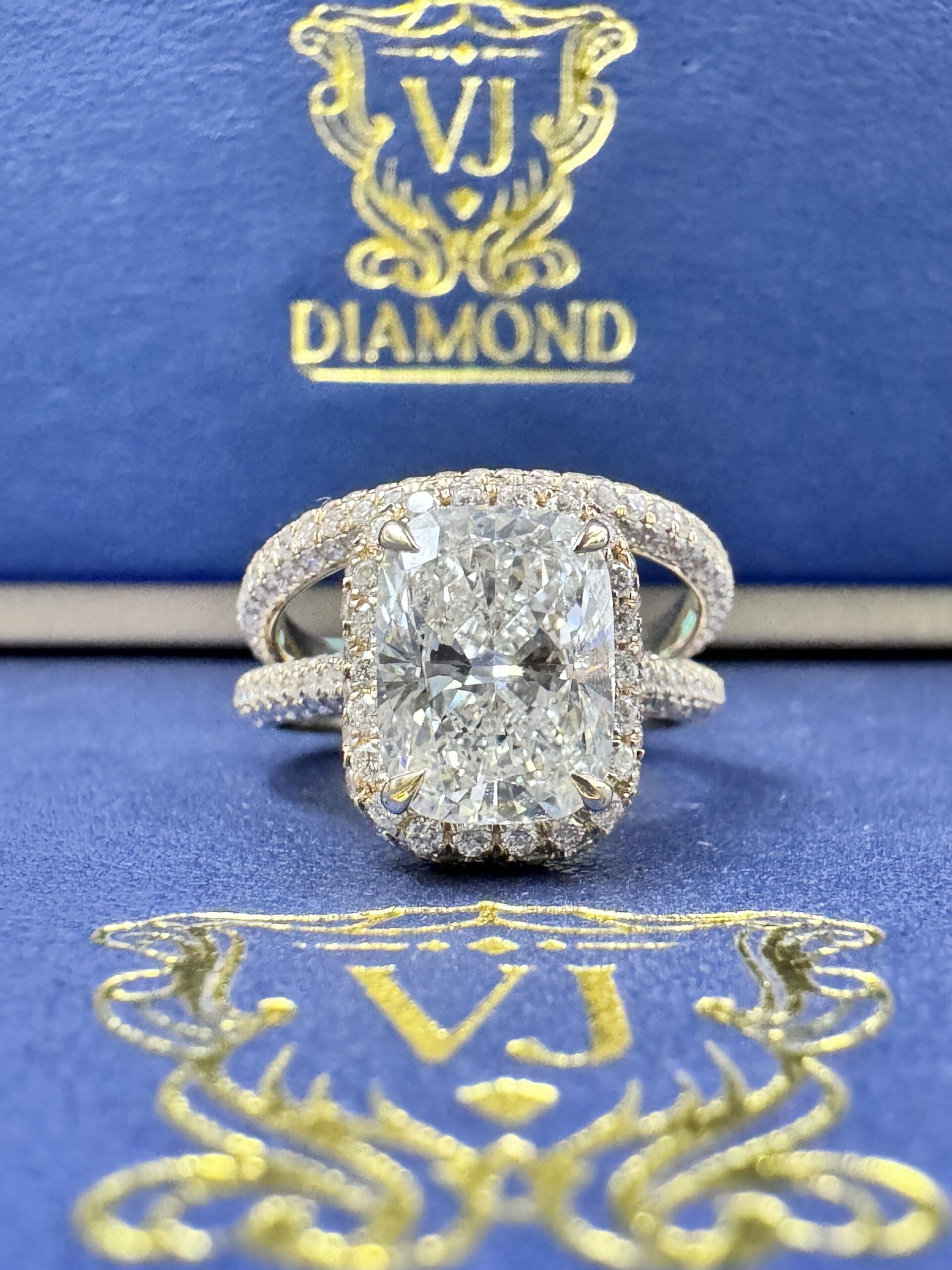 14KT Gold 4.74CT LabGrown Rectangle CushionCut Bridal Ring Custom Made Center Solitaire 3.08CT VVs Clarity F Color Size 7 RoundCut Pave ProngSet Diamonds All Over Band awns Wedding Band Certified F Color Sizing Available Approx Gold Weight 6.6Gram