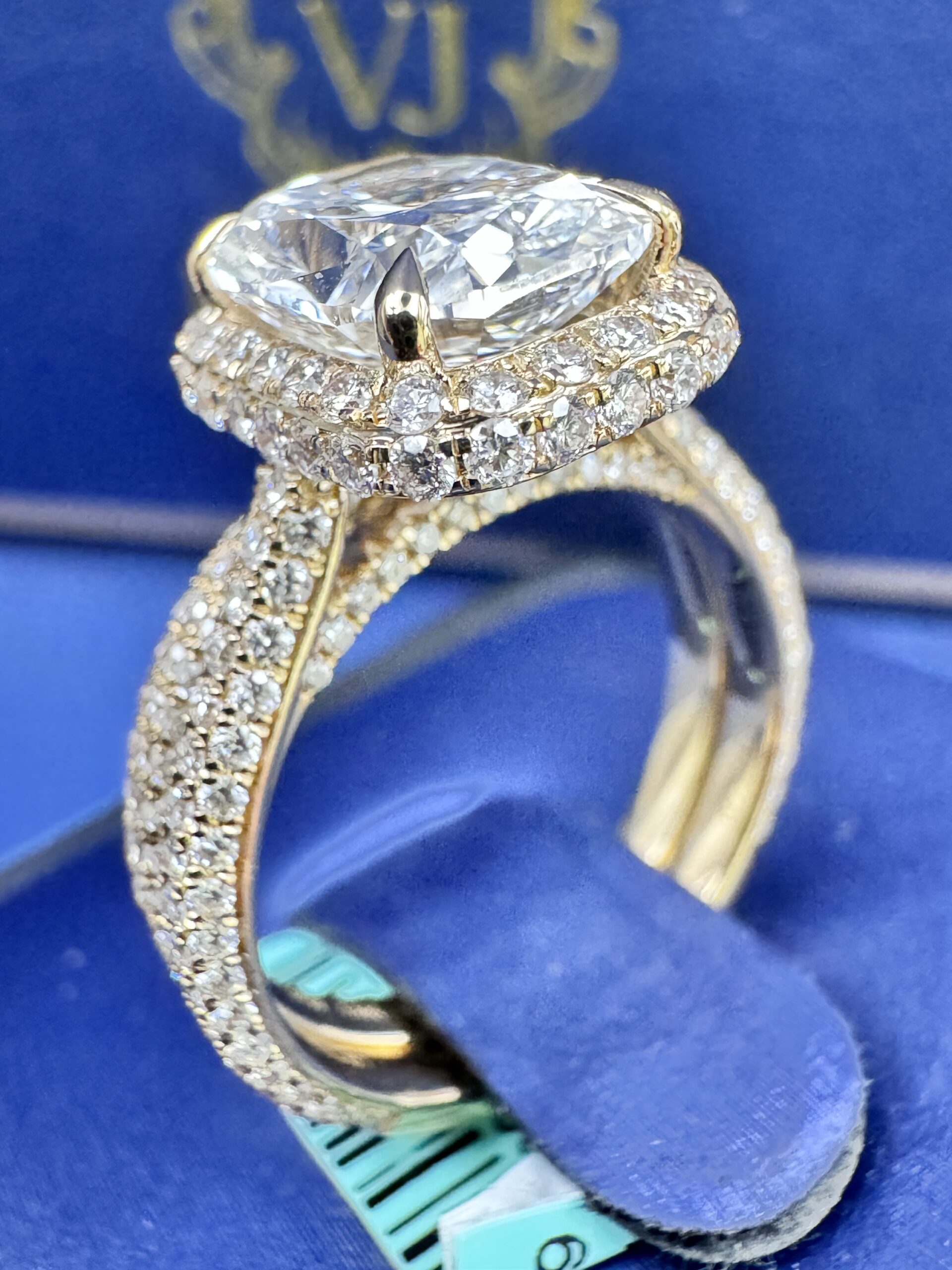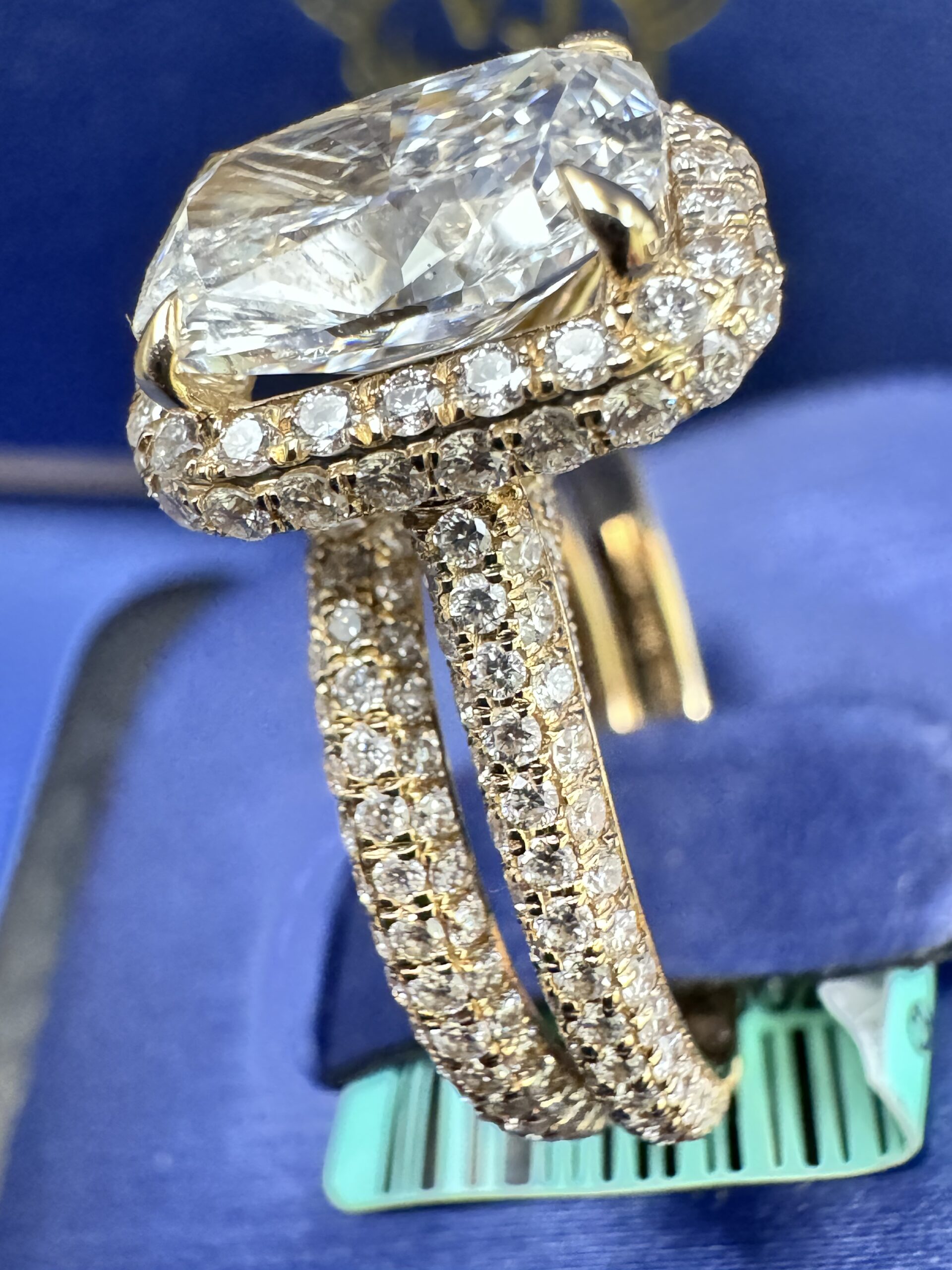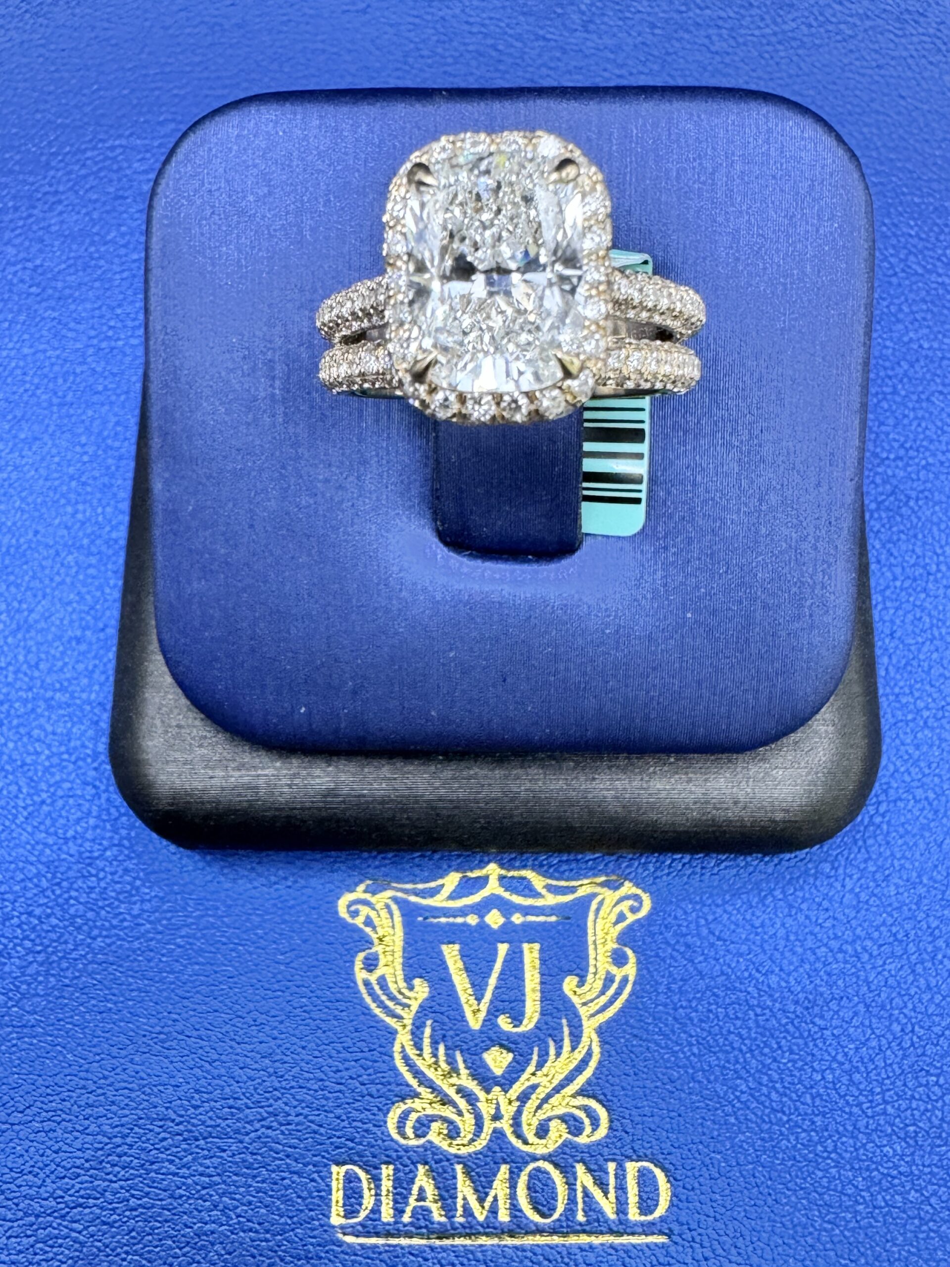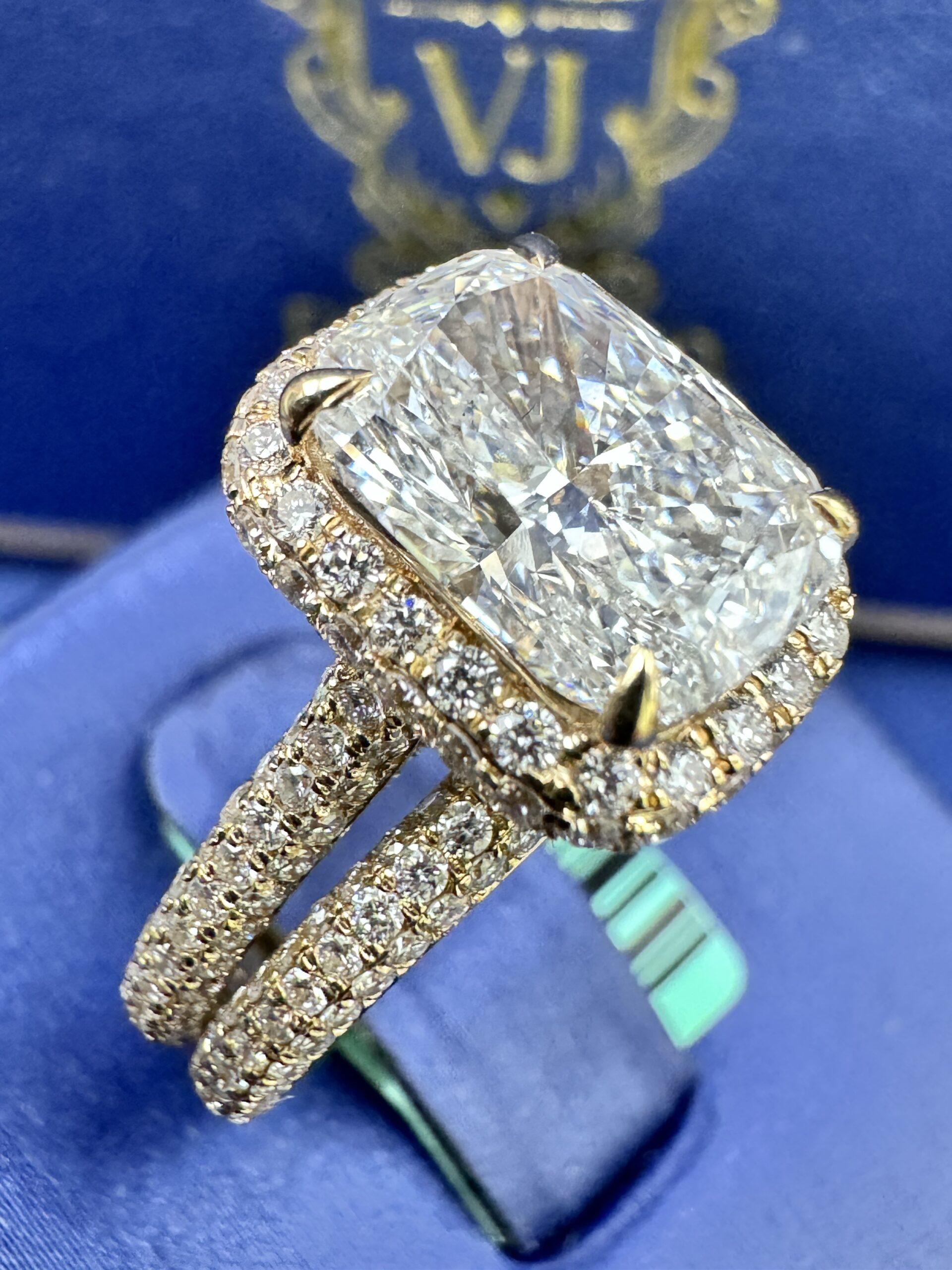14KT Gold 4.74CT LabGrown Rectangle CushionCut Bridal Ring Custom Made Center Solitaire 3.08CT VVs Clarity F Color Size 7 RoundCut Pave ProngSet Diamonds All Over Band awns Wedding Band Certified F Color Sizing Available Approx Gold Weight 6.6Gram