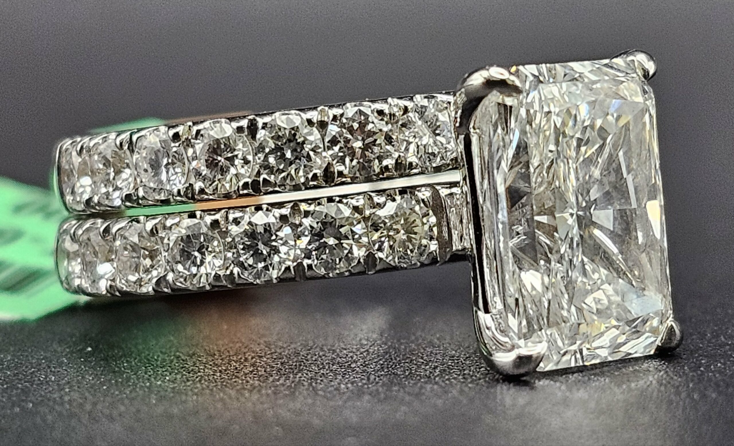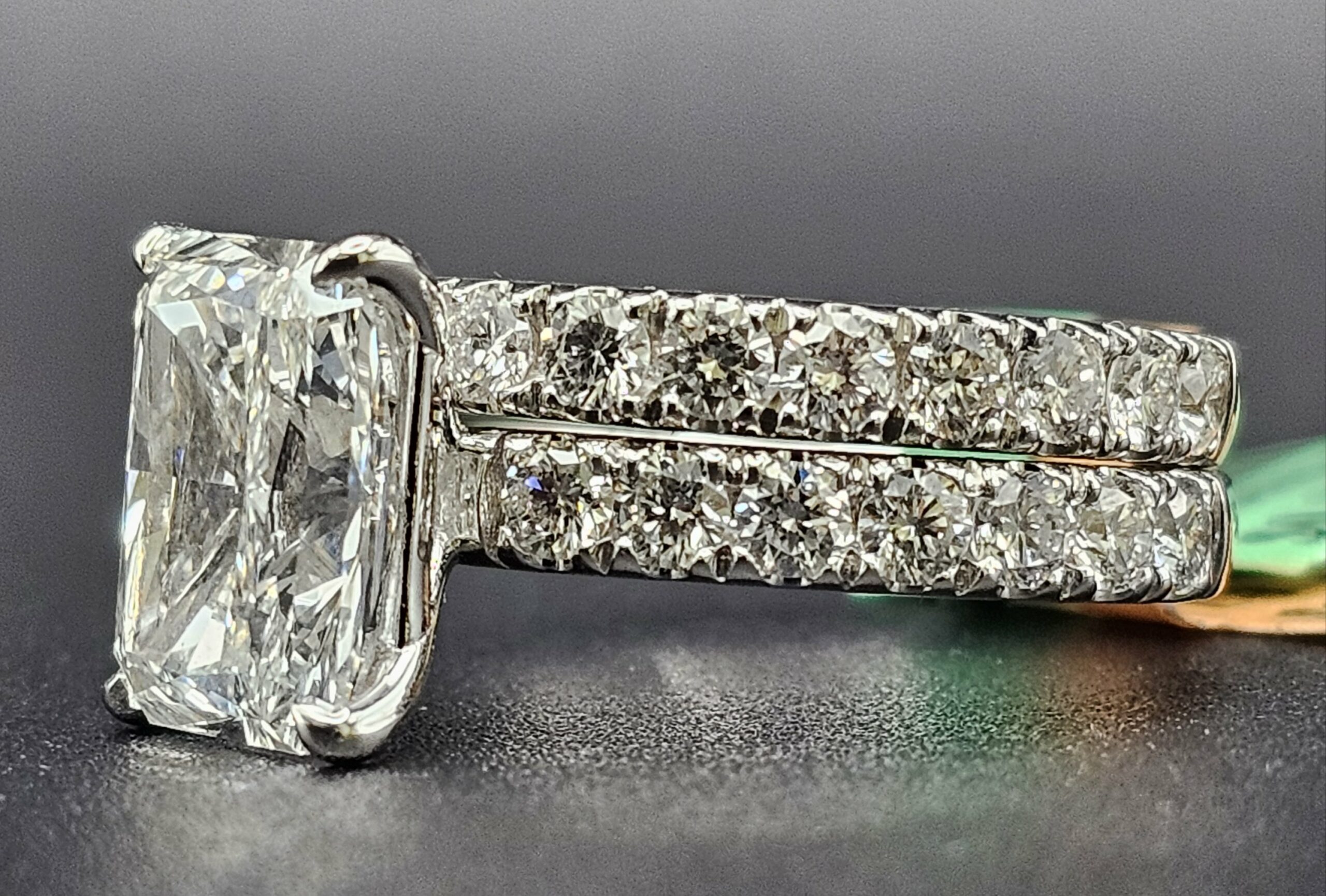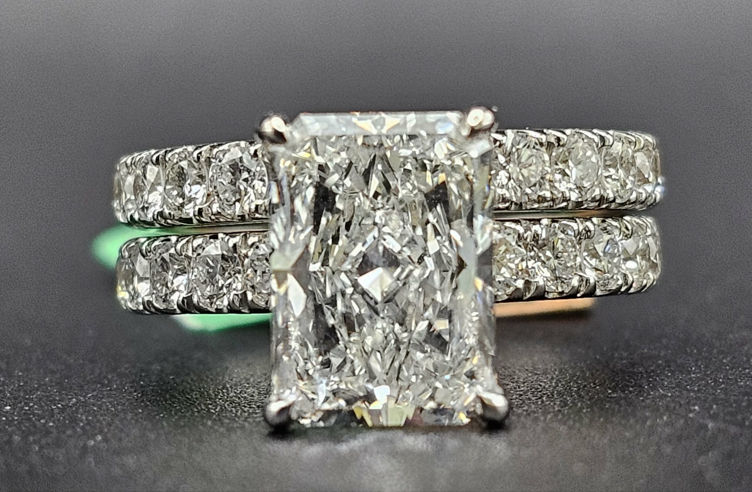 14KT W/Gold 6.01CT LG Diamond Bridal Emeraled Cut Solitaire 4.06CT Center Stone With Custom ProngSet Band VS1 F Color Size 7 Sizing Available