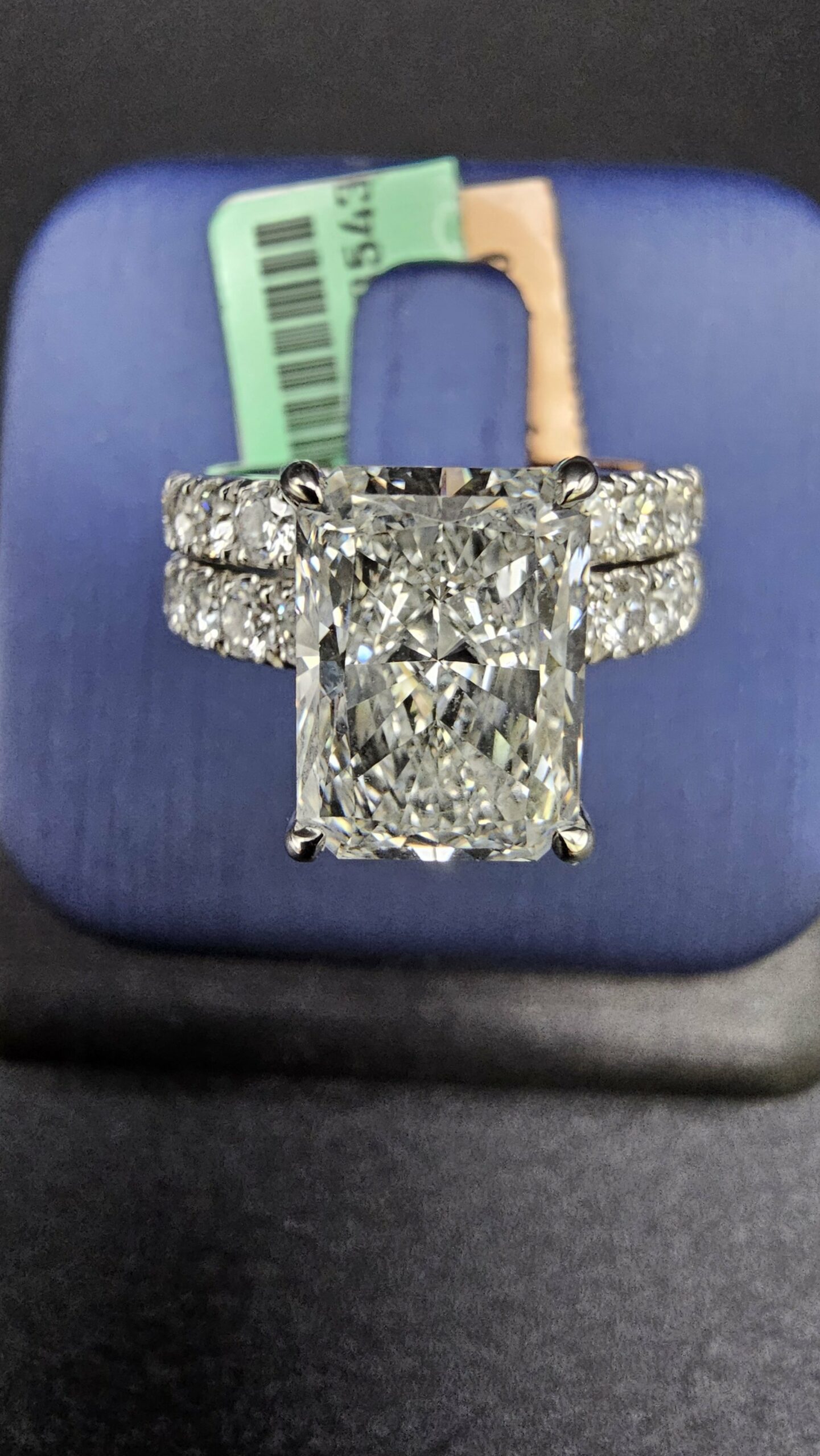 This exquisite 14KT white gold bridal ring features a stunning 6.01CT emerald cut diamond with a 4.06CT center stone, beautifully enhanced by a custom prong-set band. Size 7, resizing available.