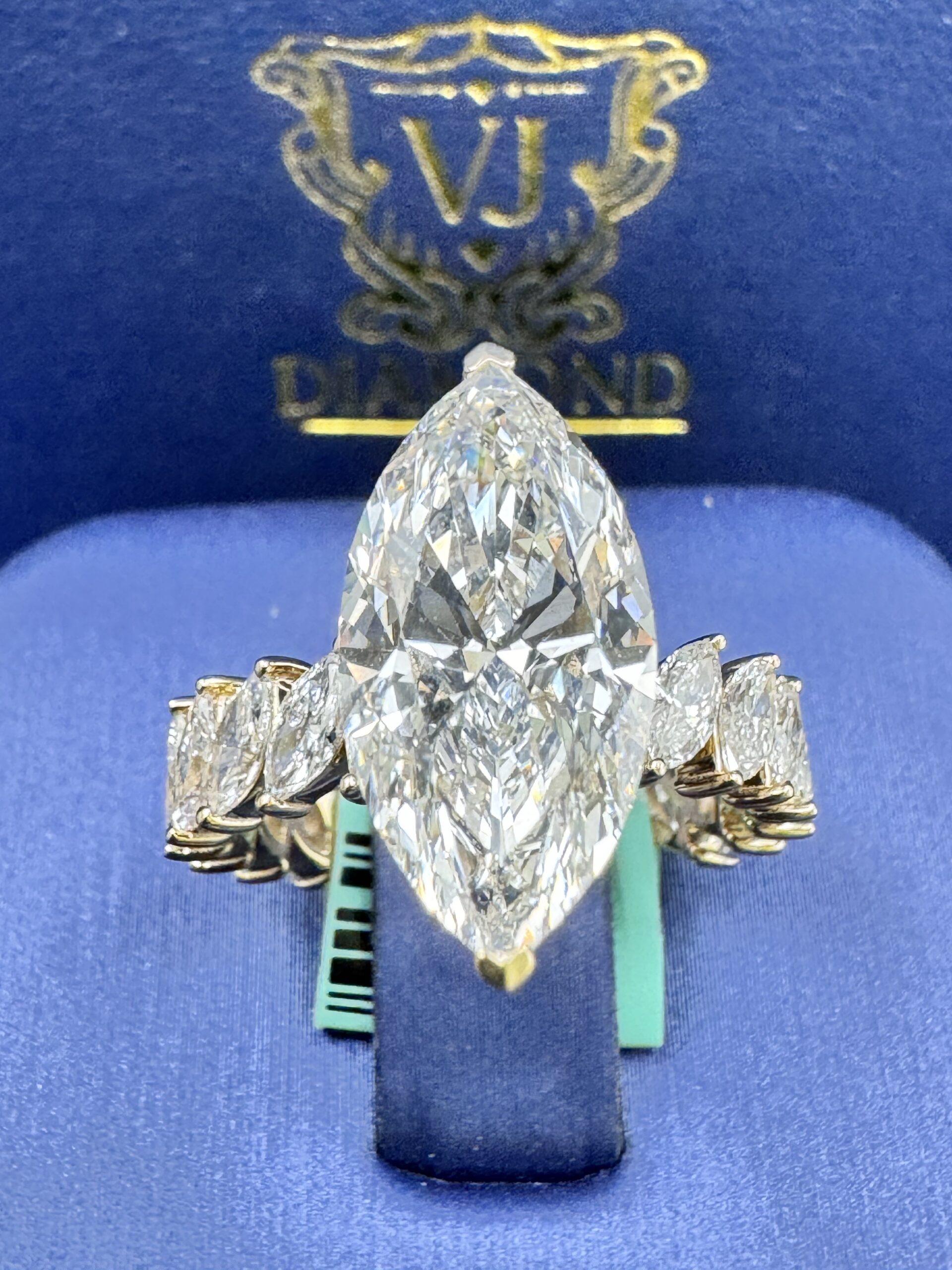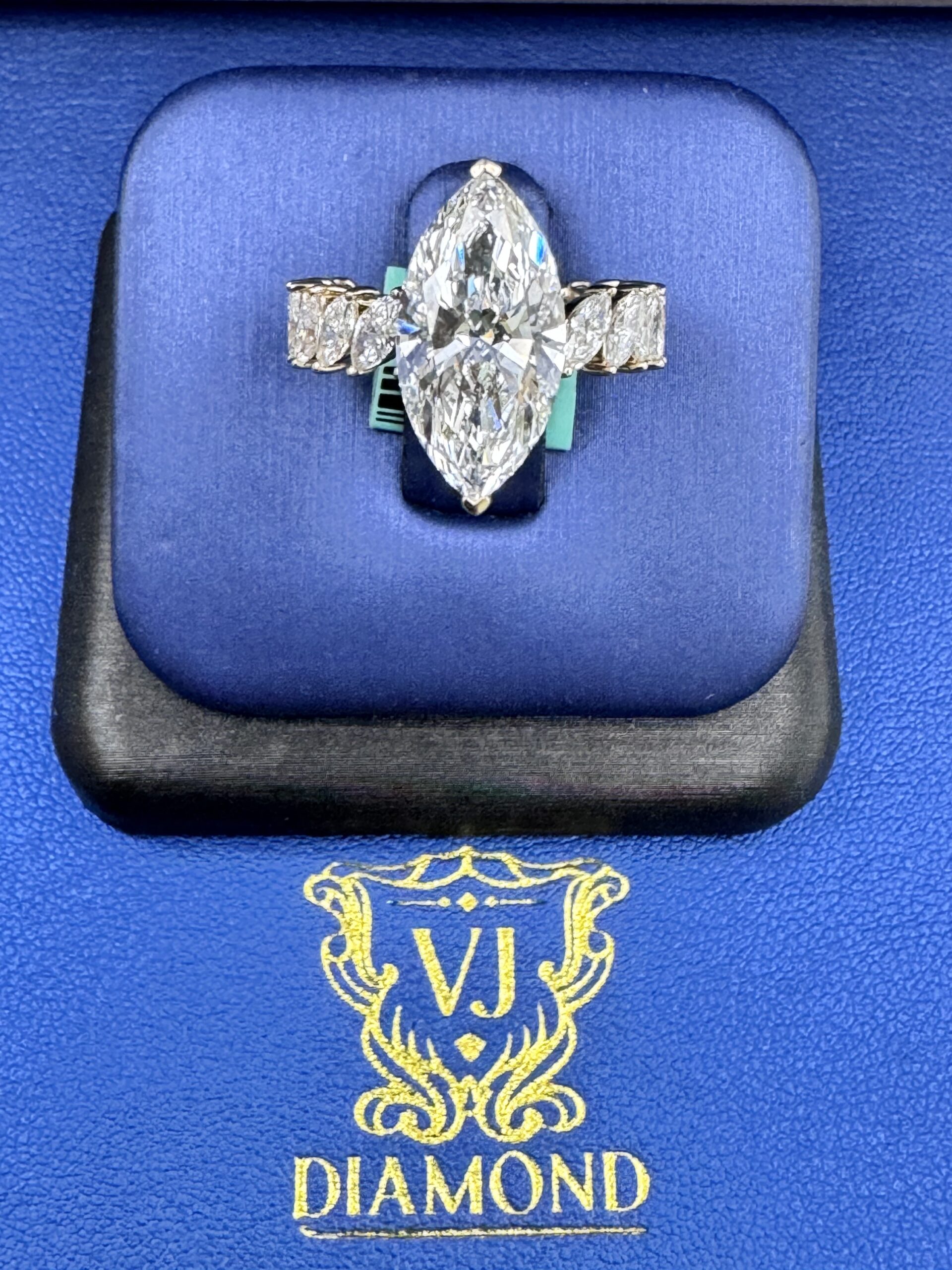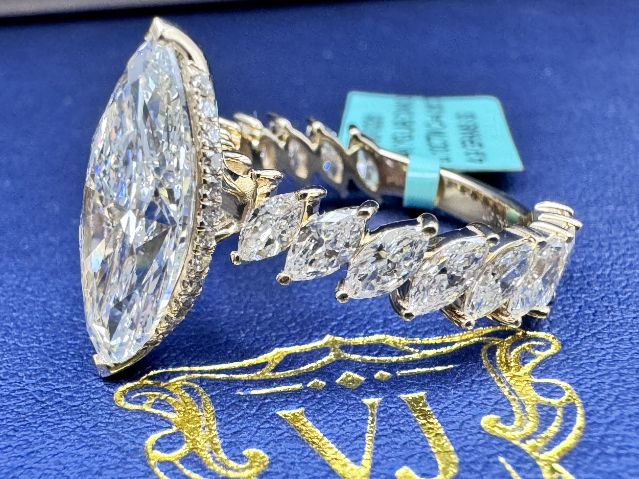 14KT Gold 6.10CT LabGrown Marques Cut Ring Custom Made Center Solitaire 4.06CT VVs Clarity F Color Size 7 Marquee Cut Diamonds All Over Band Certified F Color Sizing Available Approx Gold Weight 4.9 Gram