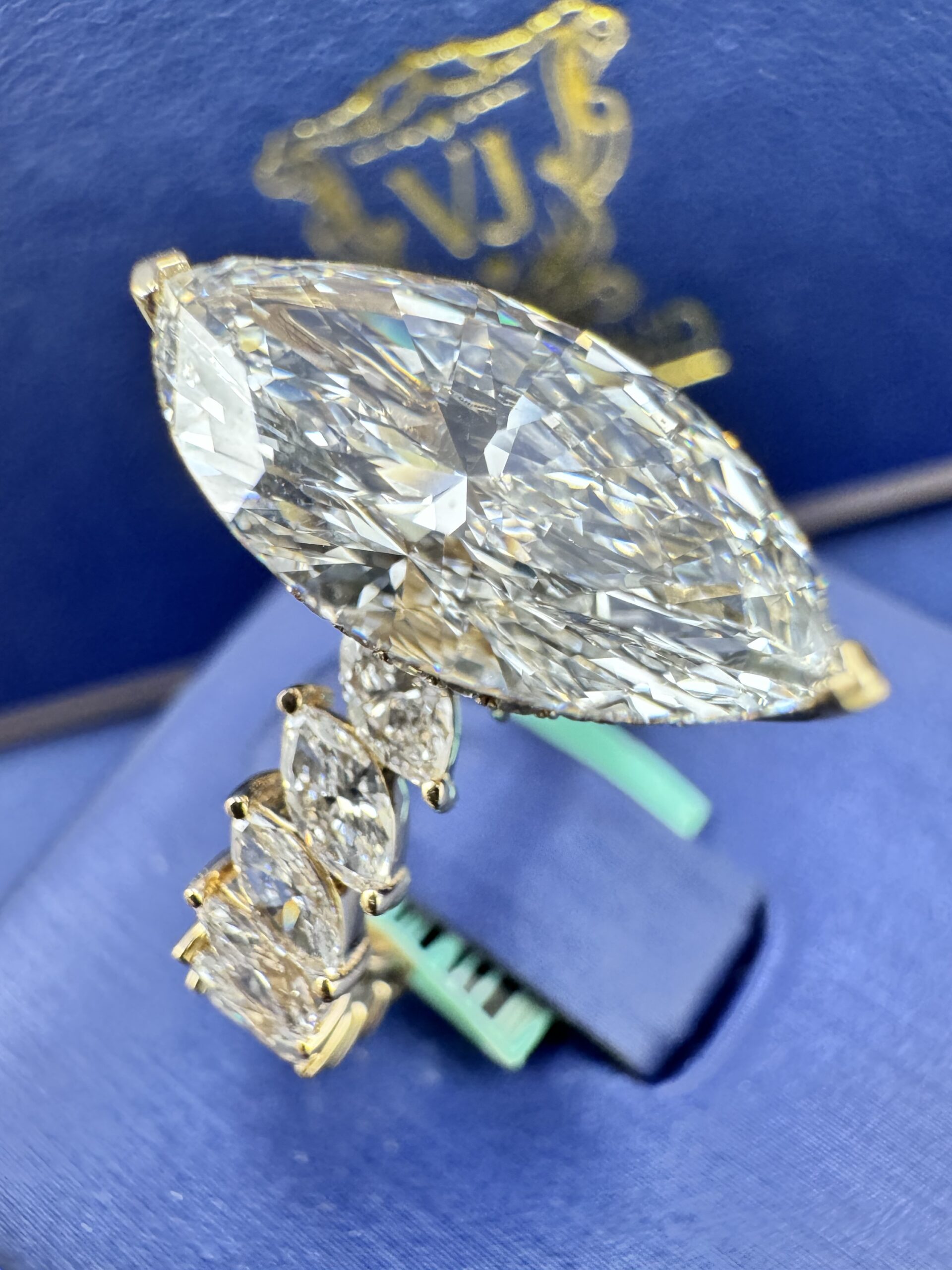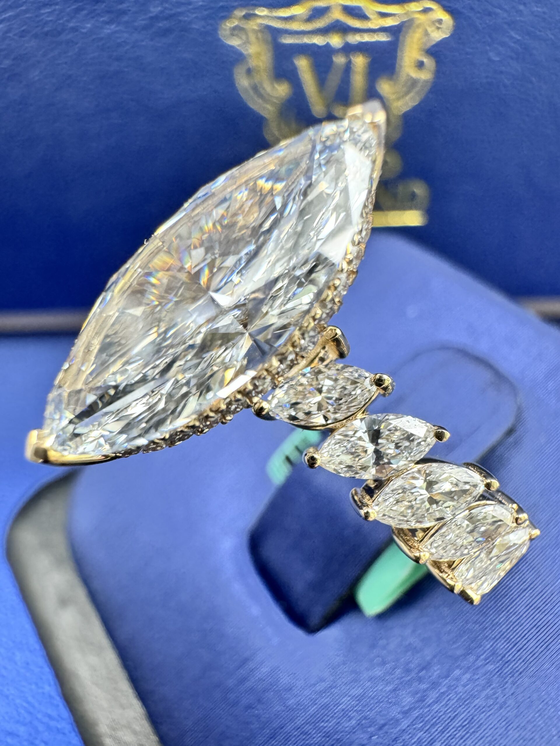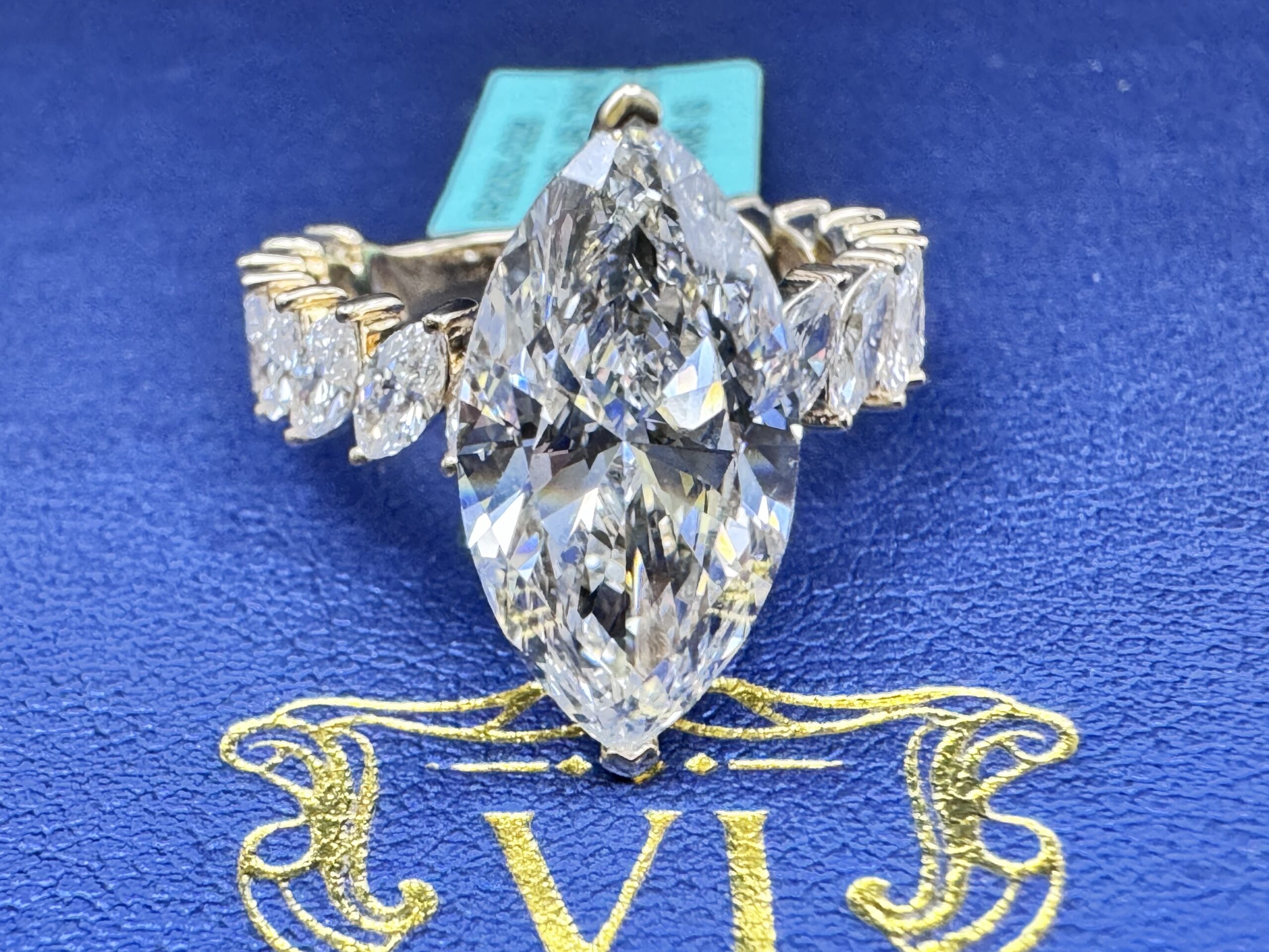 14KT Gold 6.10CT LabGrown Marques Cut Ring Custom Made Center Solitaire 4.06CT VVs Clarity F Color Size 7 Marquee Cut Diamonds All Over Band Certified F Color Sizing Available Approx Gold Weight 4.9 Gram