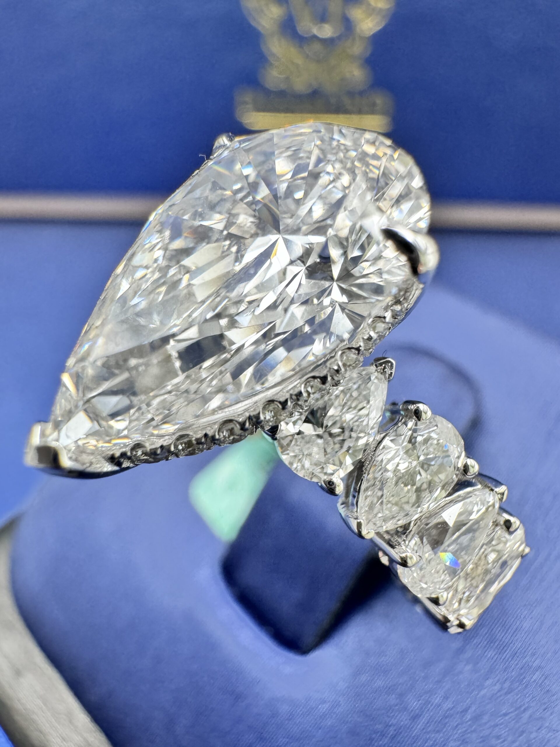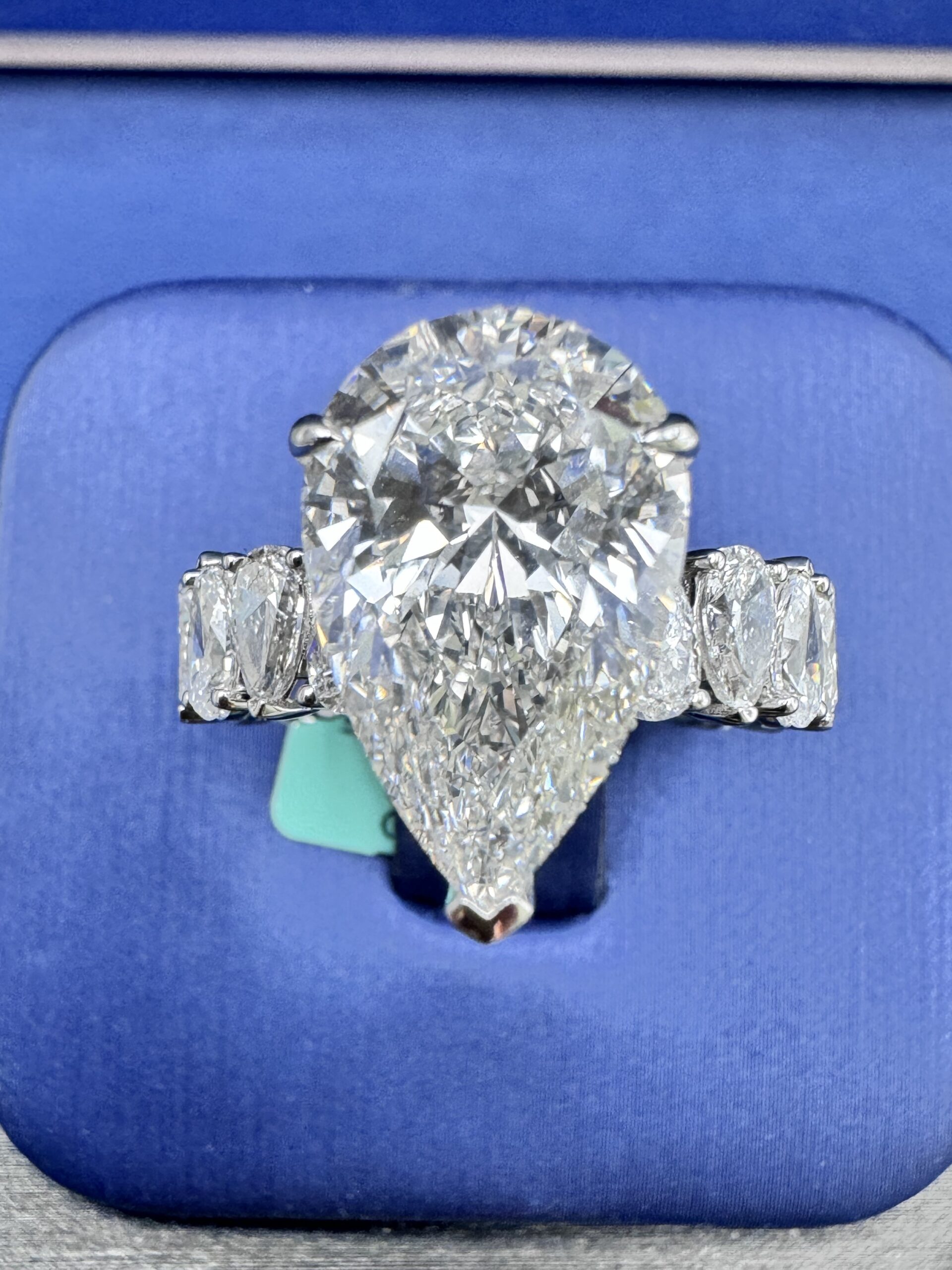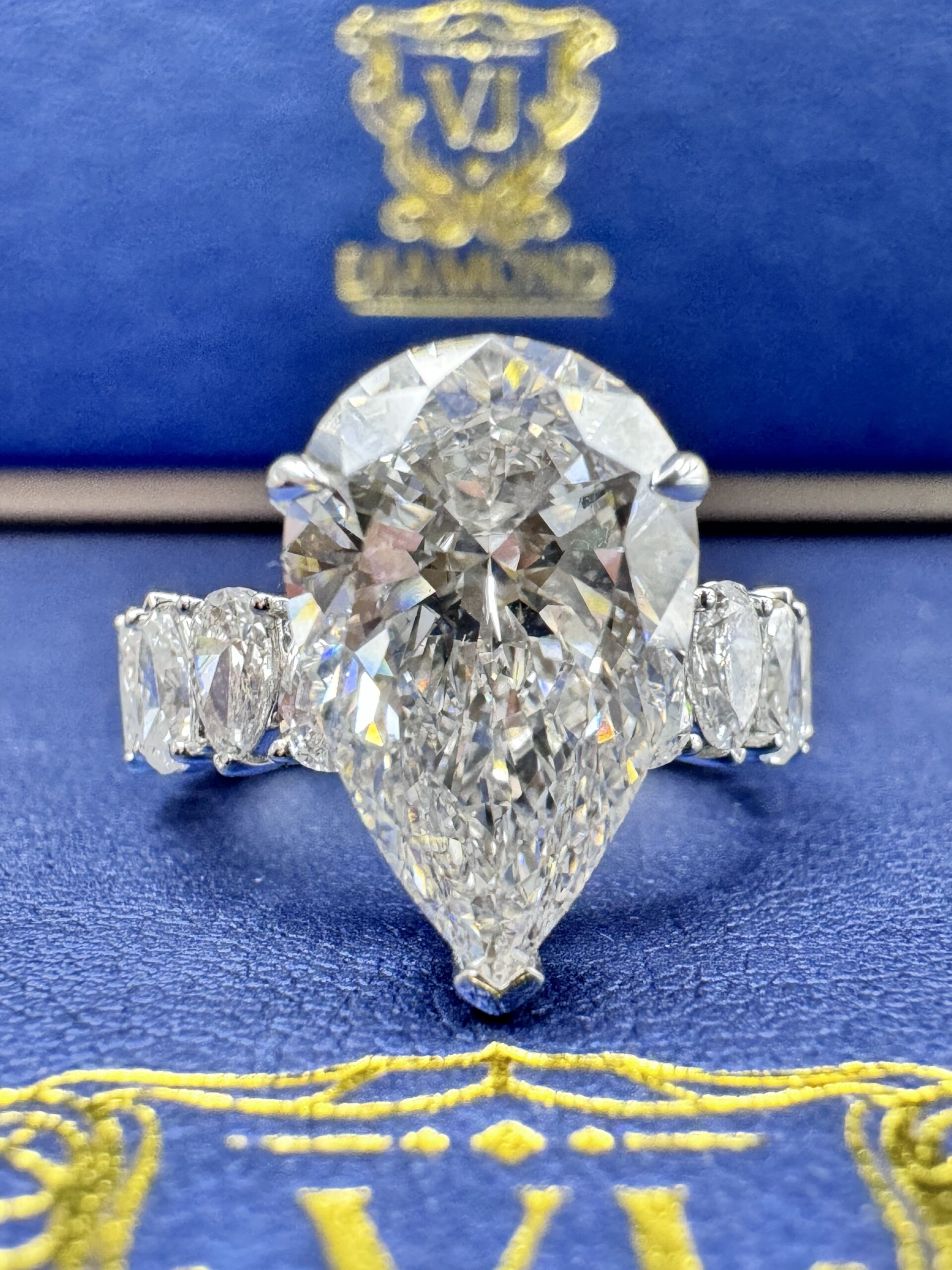 14KT W/Gold 7.85CT LabGrown PearCut Ring Custom Made Center Solitaire 5.09CT VVs Clarity F Color Size 7 Pear Cut Diamonds All Over Band Certified F Color Sizing Available Approx Gold Weight 5.8 Gram