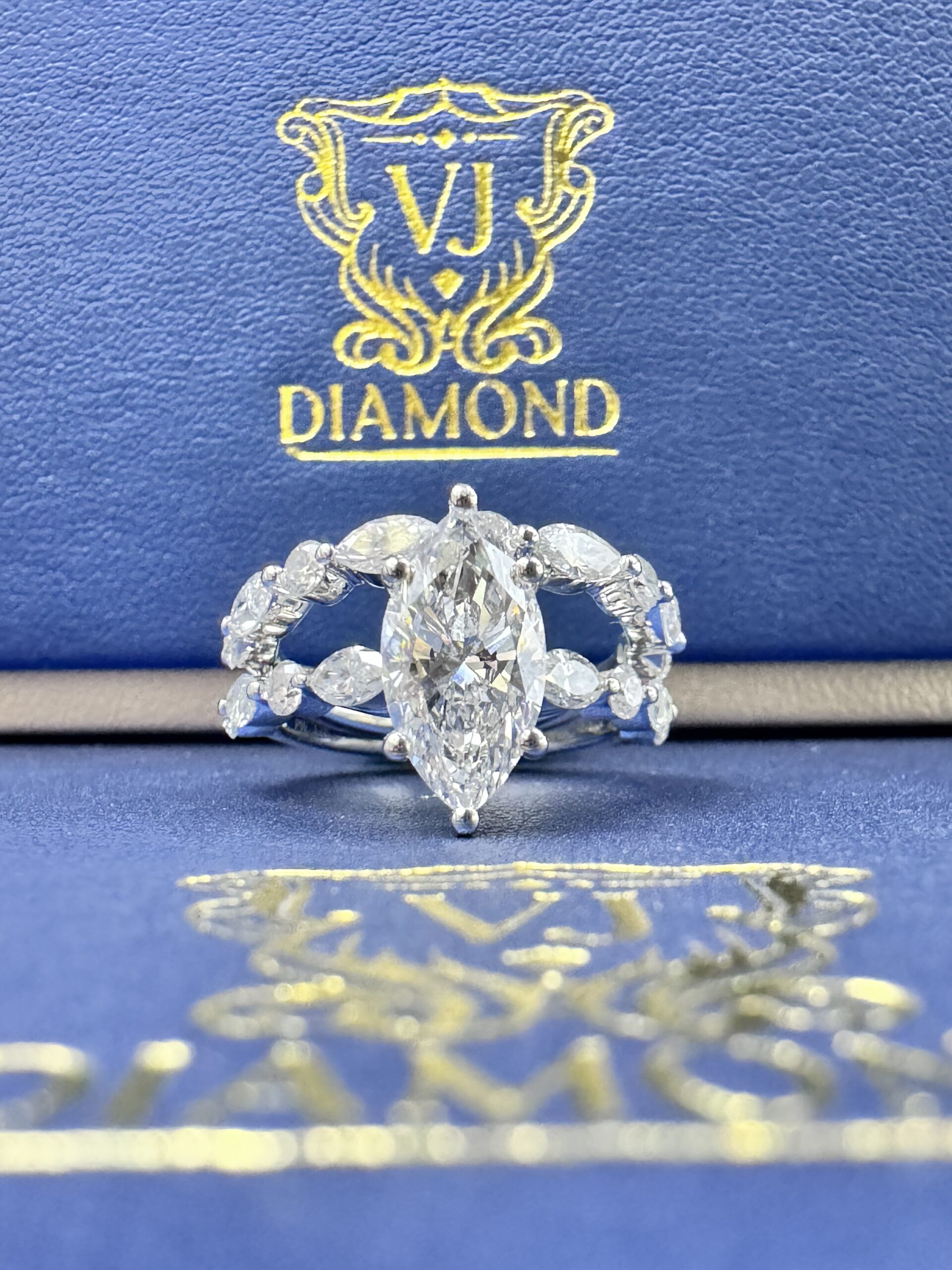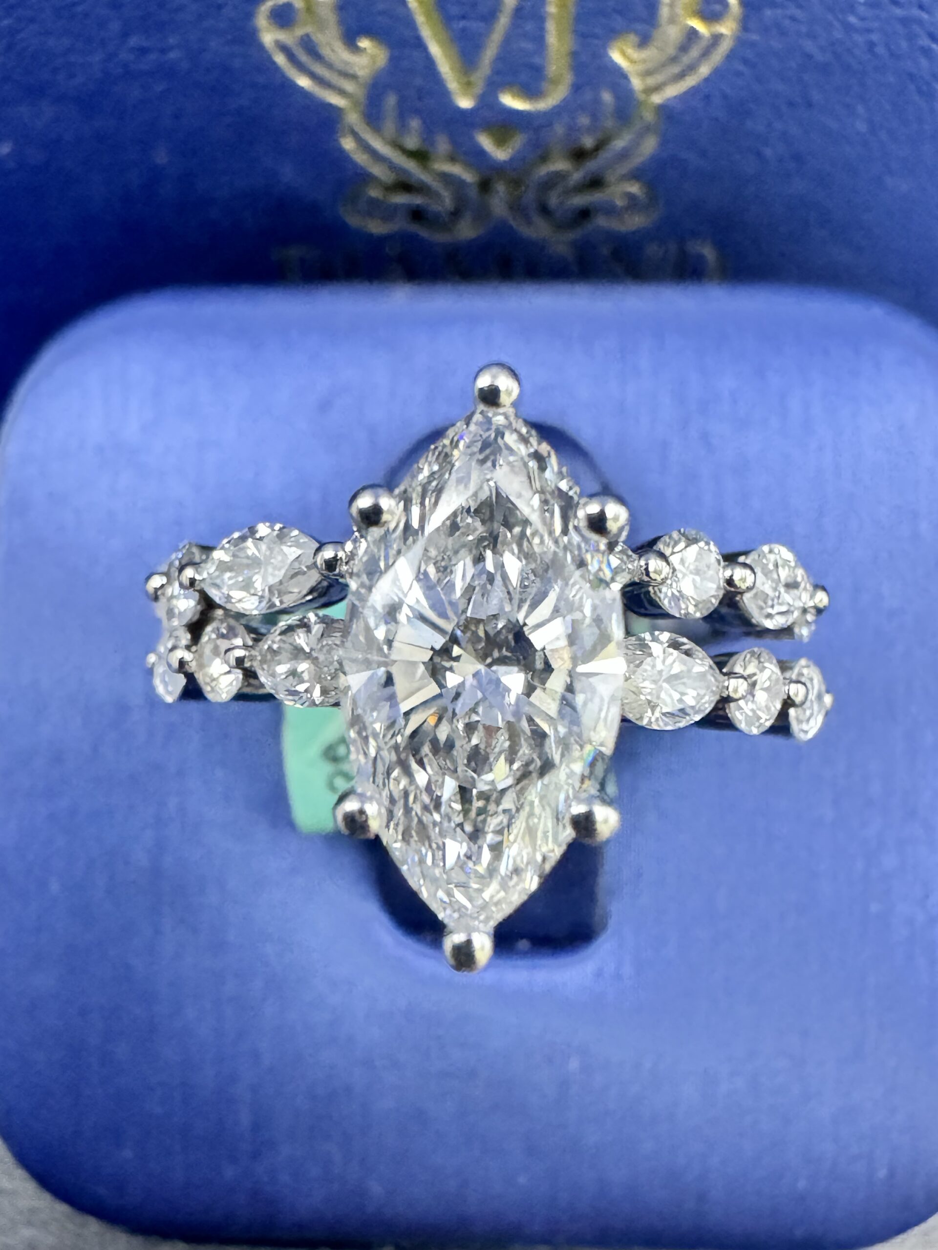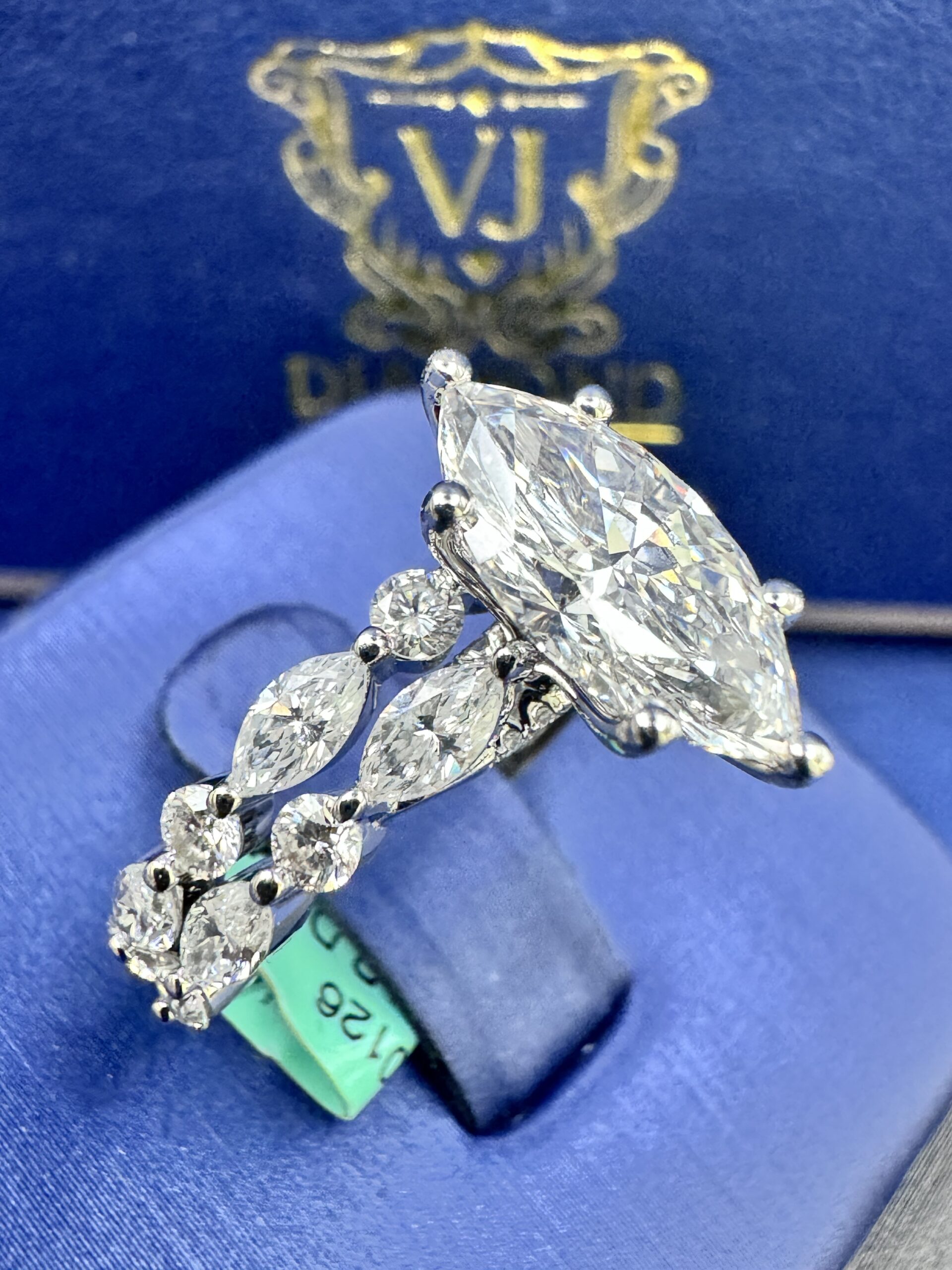 14KT WGold 3.65CT LabGrown Marquee Cut Bridal Ring Custom Made Center Solitaire 2.06CT VVs Clarity F Color Size 7 Marquees N RoundCut Round ProngSet Diamonds Wedding Band Certified F Color Sizing Available Approx Gold Weight 6.6 Gram