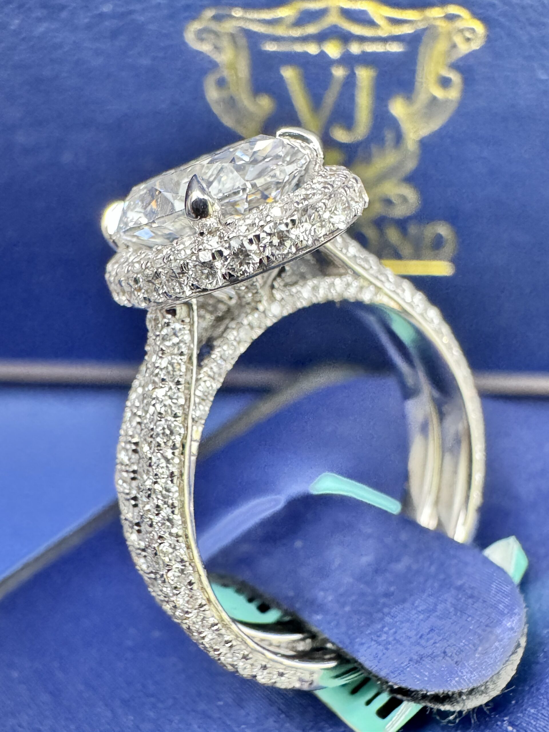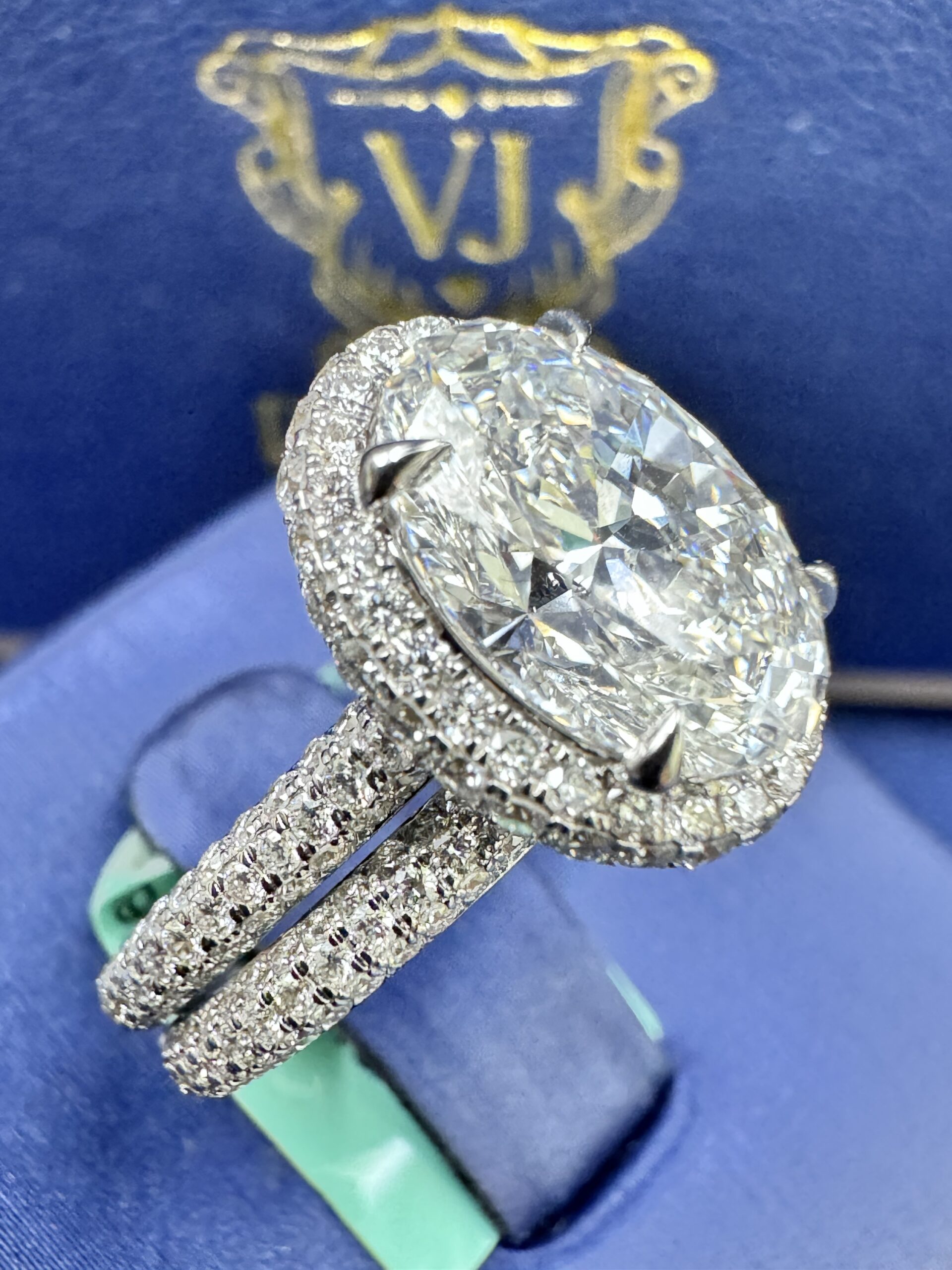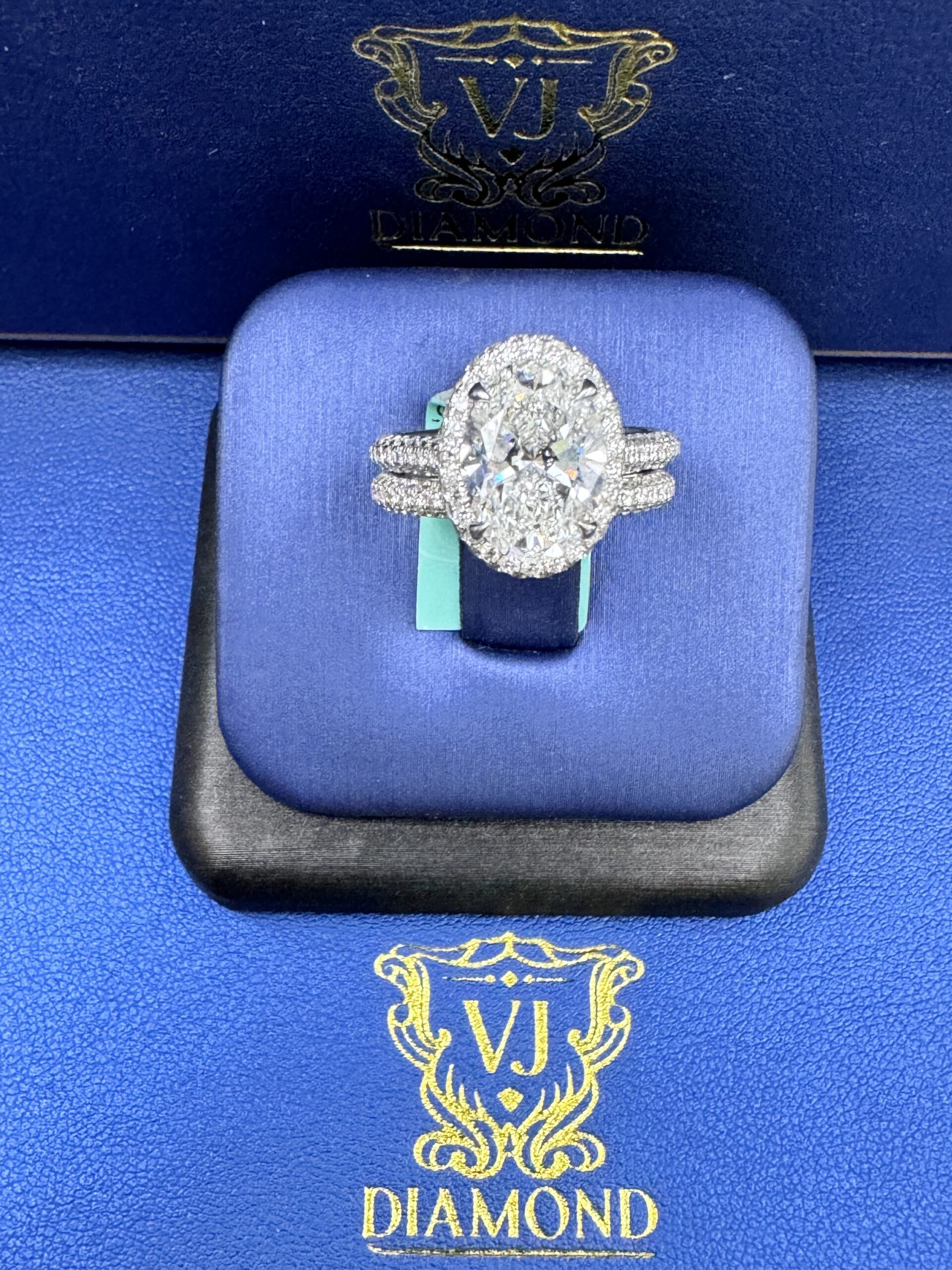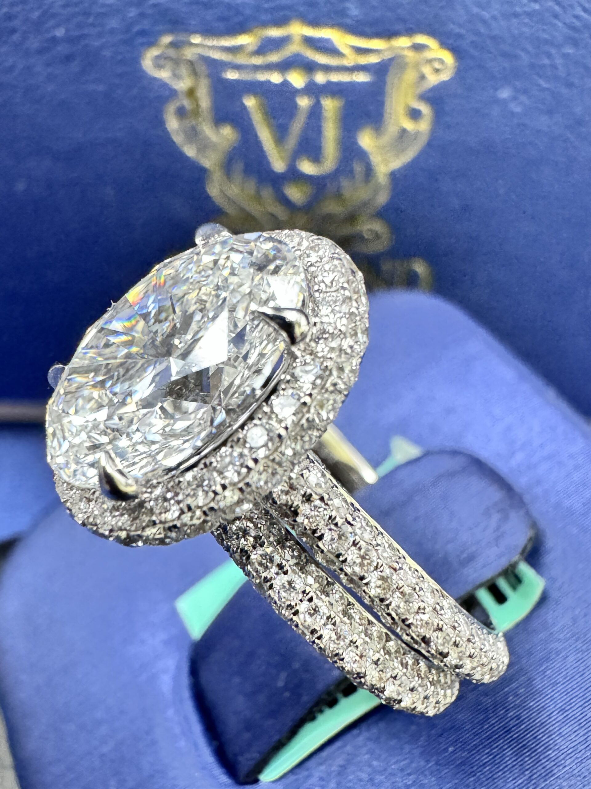 14KT WGold 4.63CT LabGrown OvalCut Bridal Ring Custom Made Center Solitaire 3.08CT VVs Clarity F Color Size 7 RoundCut Pave ProngSet Diamonds All Over Band awns Wedding Band Certified F Color Sizing Available Approx Gold Weight 6.6Gram