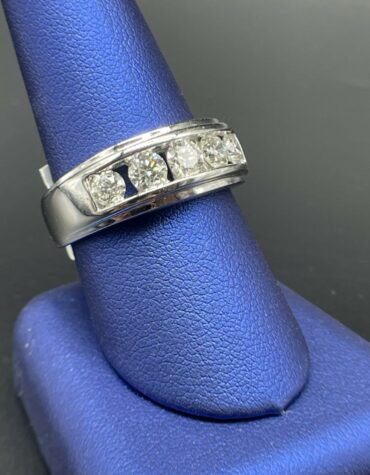 This listing is for a brand new Band of 14k White Gold with solitaire diamond. The diamond setting includes 5 round cut diamonds set in an invisible setting. A larger center diamond accented with smaller round cut diamonds. The diamonds reflect off each other for a solitaire look. A row of diamonds around the center invisible setting. The total weight of the diamonds are 1.50 ctw This shine is guaranteed to last for an eternity, as these are natural, not enhanced diamonds.