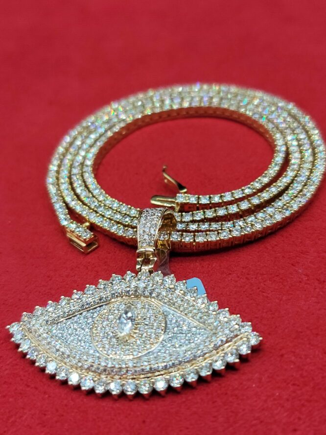14KT Y/Gold 9.95CT Diamond Tennis Necklace With 14KT 4.05CT Diamond EvilEye Pendant Allah VVS Diamonds Approx Gold Weight 8.91 Grams Lengths 1.5 Inches Tall Width 1.75 Inches 2.5MM Thickness On Diamomd Necklace 22 Inches Tennis Necklace Approx Gold Weight 22.25 Grams
