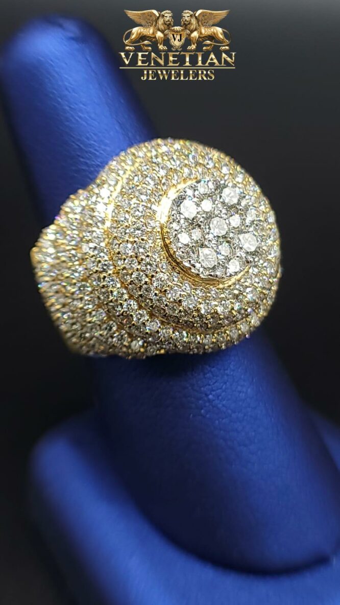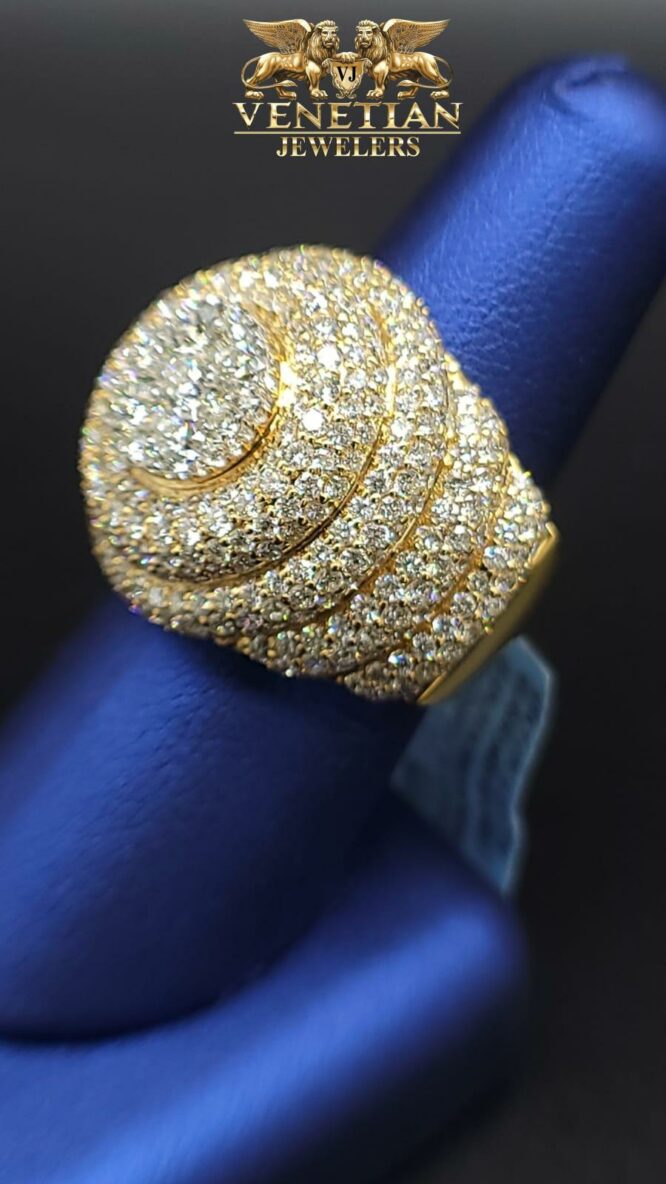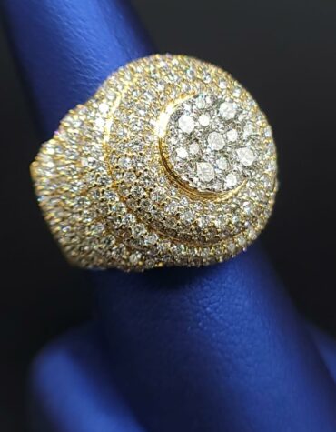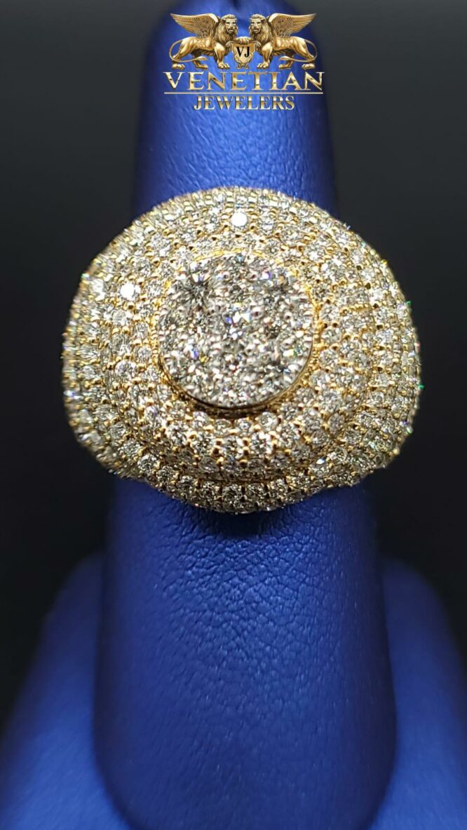 Richly detailed, this magnificent diamond ring makes a great impression. Brilliantly casted in lustrous 14K Yellow Gold, this ring features an incredibly eye catching design with large fully faceted genuine diamonds clustered in the center of the ring appear to be a solitaire while a row of solitaires perfectly surrounds the cluster which defines an elegant look. Completing the look additional small genuine diamonds glisten on the shank and the edges to ensure the ring sparkles from each angle. This high-end piece features an astounding 6.0 carat of sparkling excellent cut genuine diamonds. The ring has a caged back for a comfortable fit. With an intricate design and a highly polished gold finish, this fantastic men’s diamond ring is absolutely irresistible.