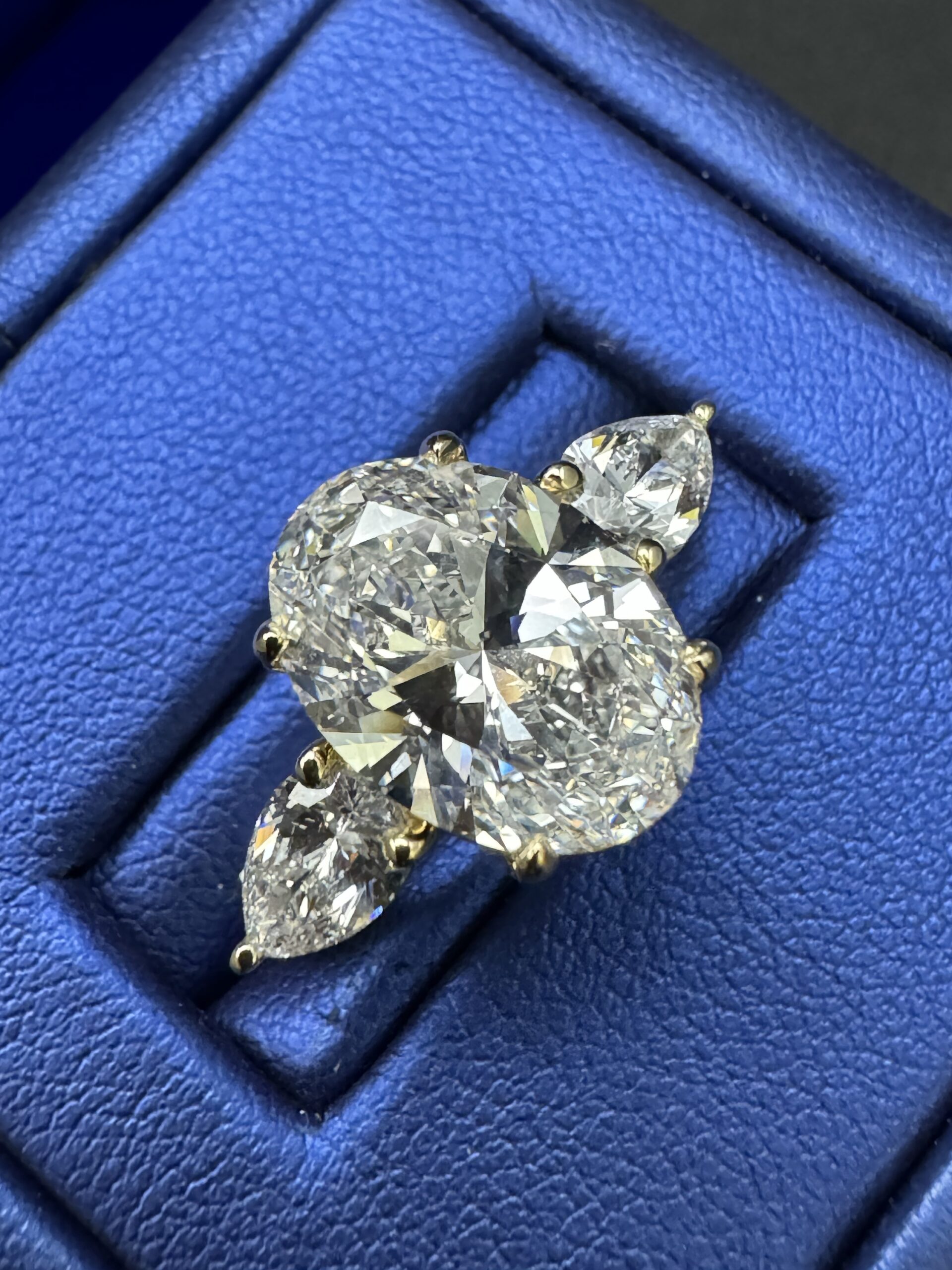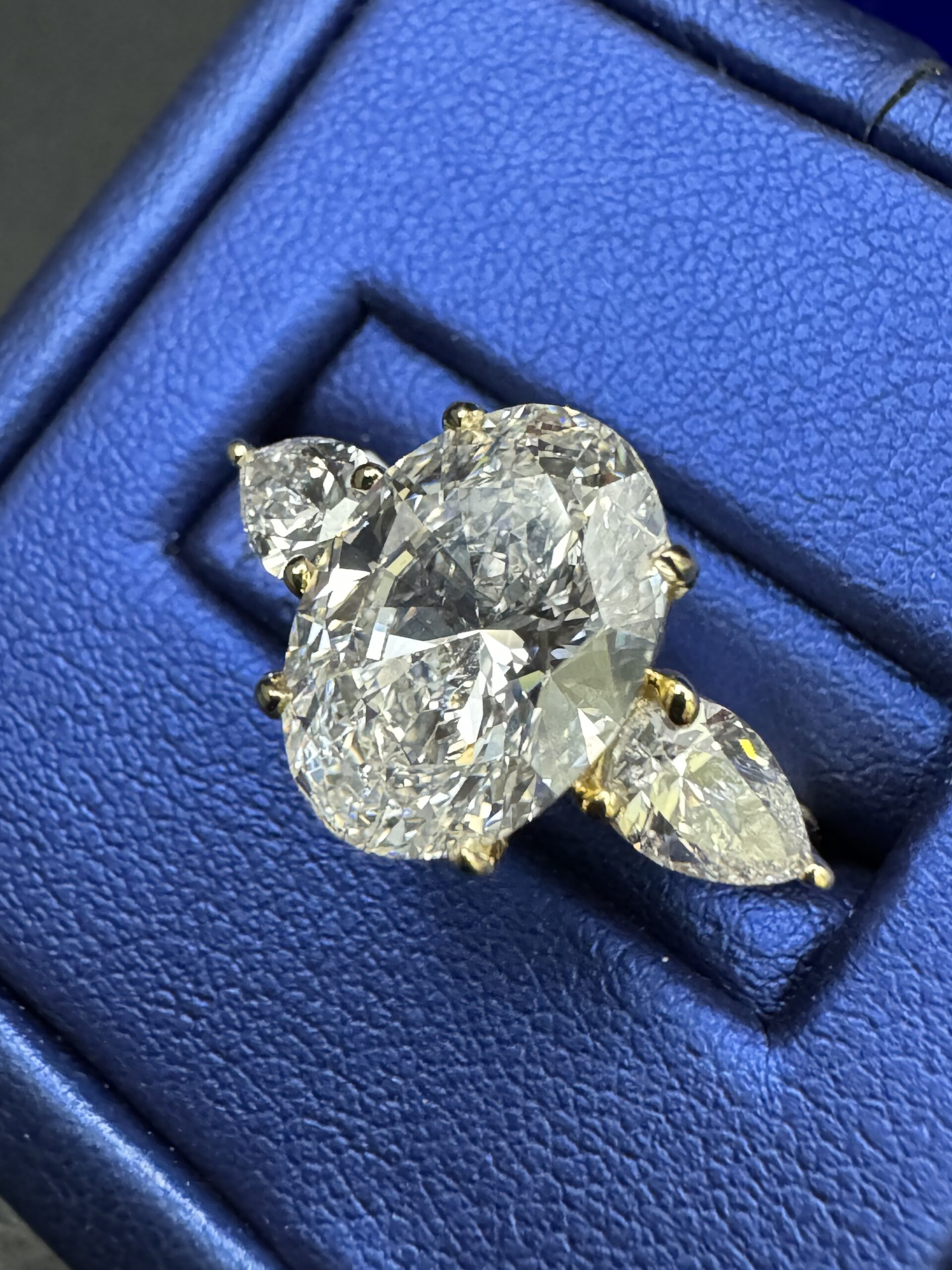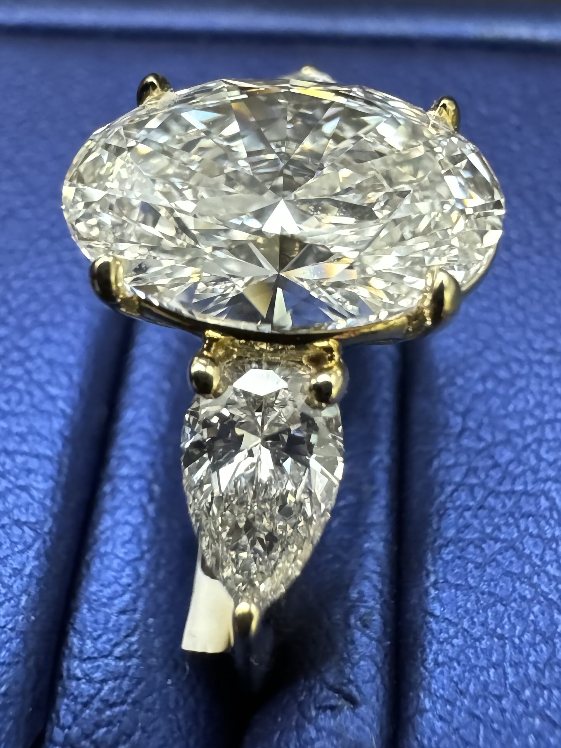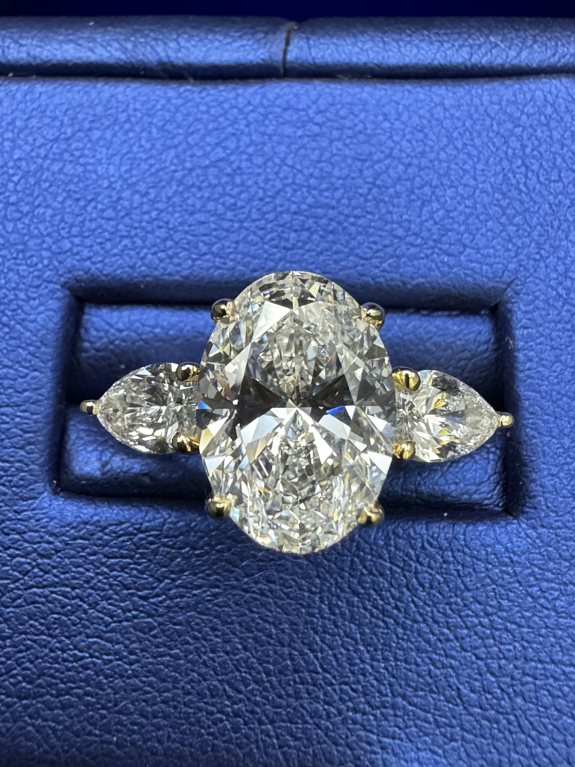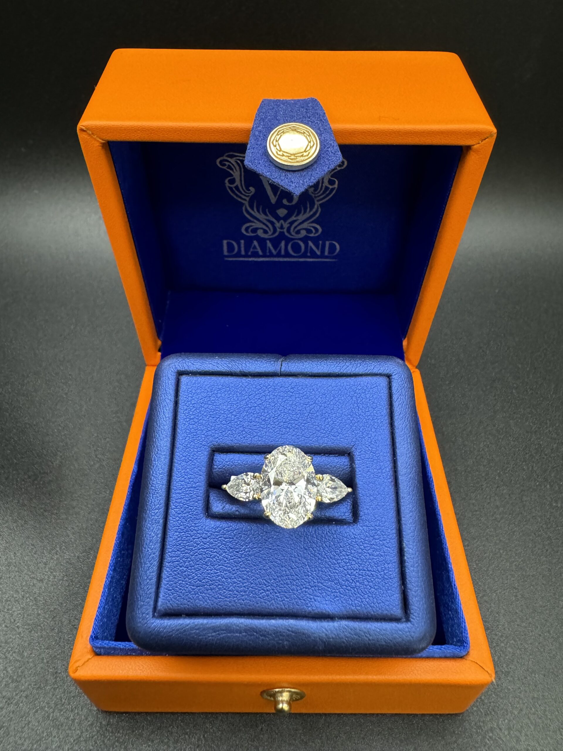 14KTGold 4.97CT OvalCut LGD Ladies Ring 4.00CT Center Oval Stone With PearCut On Both Side Size 7 Approx Gold Weight 4.7 Gram Sizing Available Certified Stone VVS Clarity F-G Color
