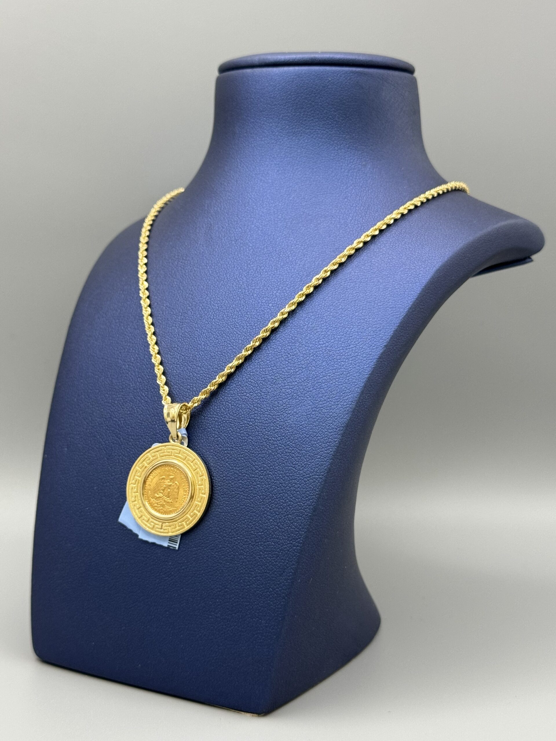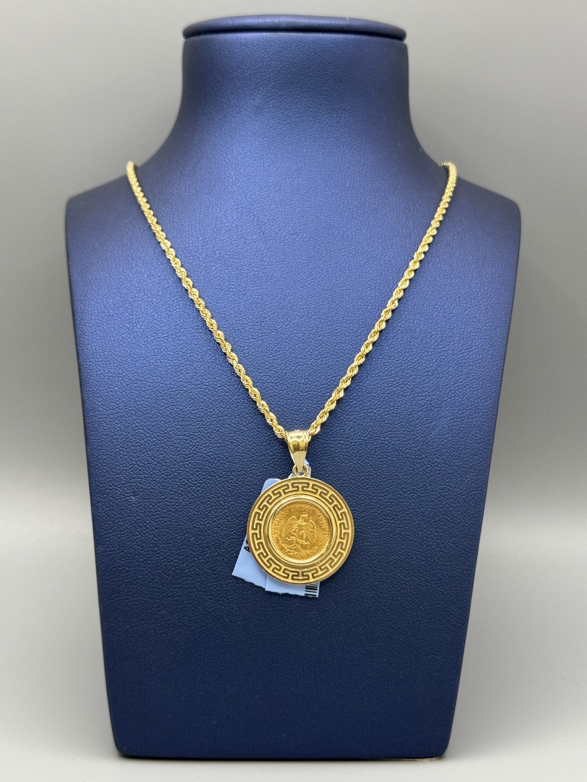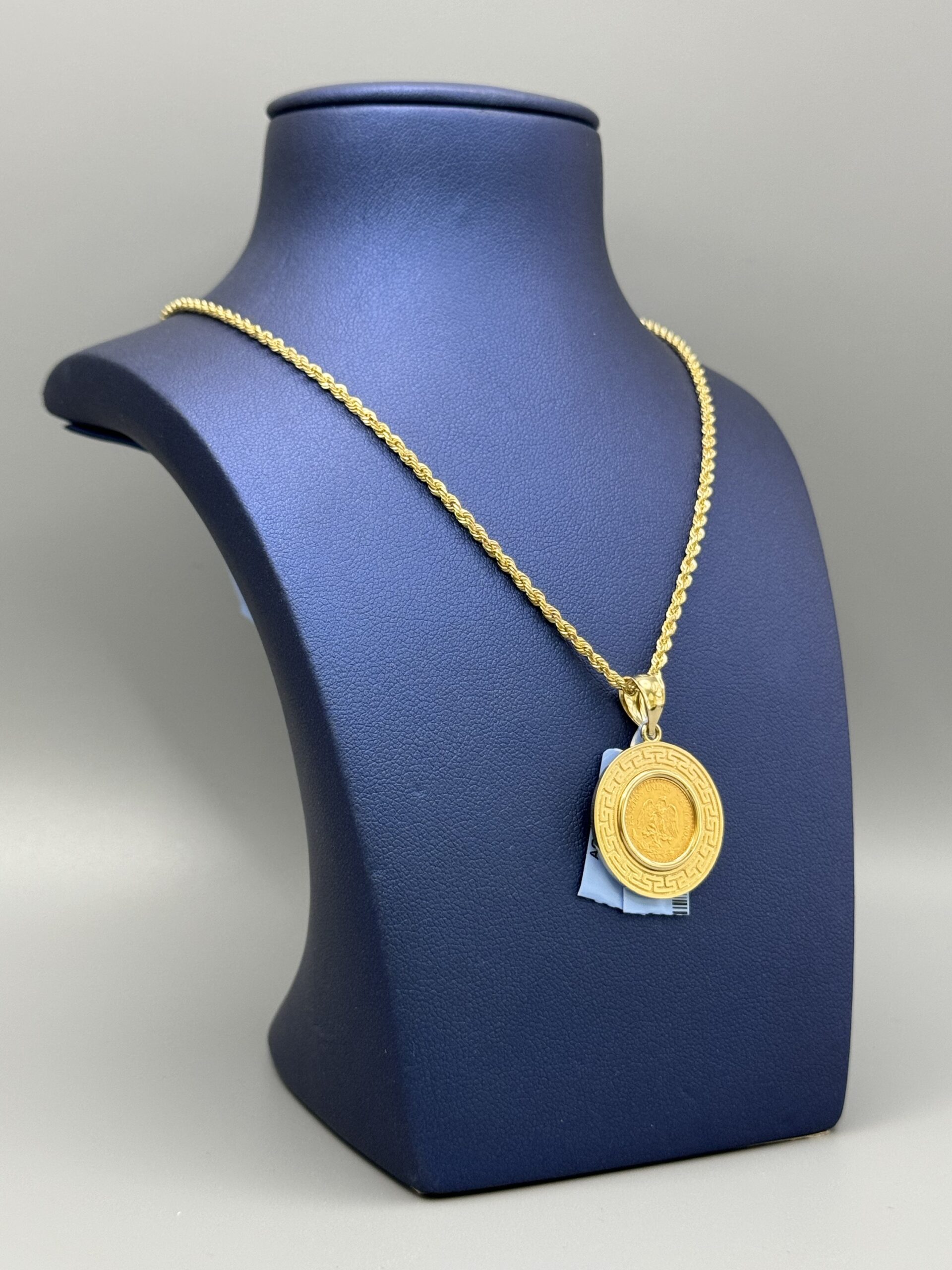 22KT Centenario 2 Pesos Coin ComboSet Sets In 14Kt Gold Bezel With 14KT Gold Rope Necklace 2MM 22″ Approx Golf Weight Of Necklace 8.1 Gram Pendant 1″ All Around By 1.25″ Tall Approx Gold Weight Of The Pendant Includes Bezel 4.7 Gram