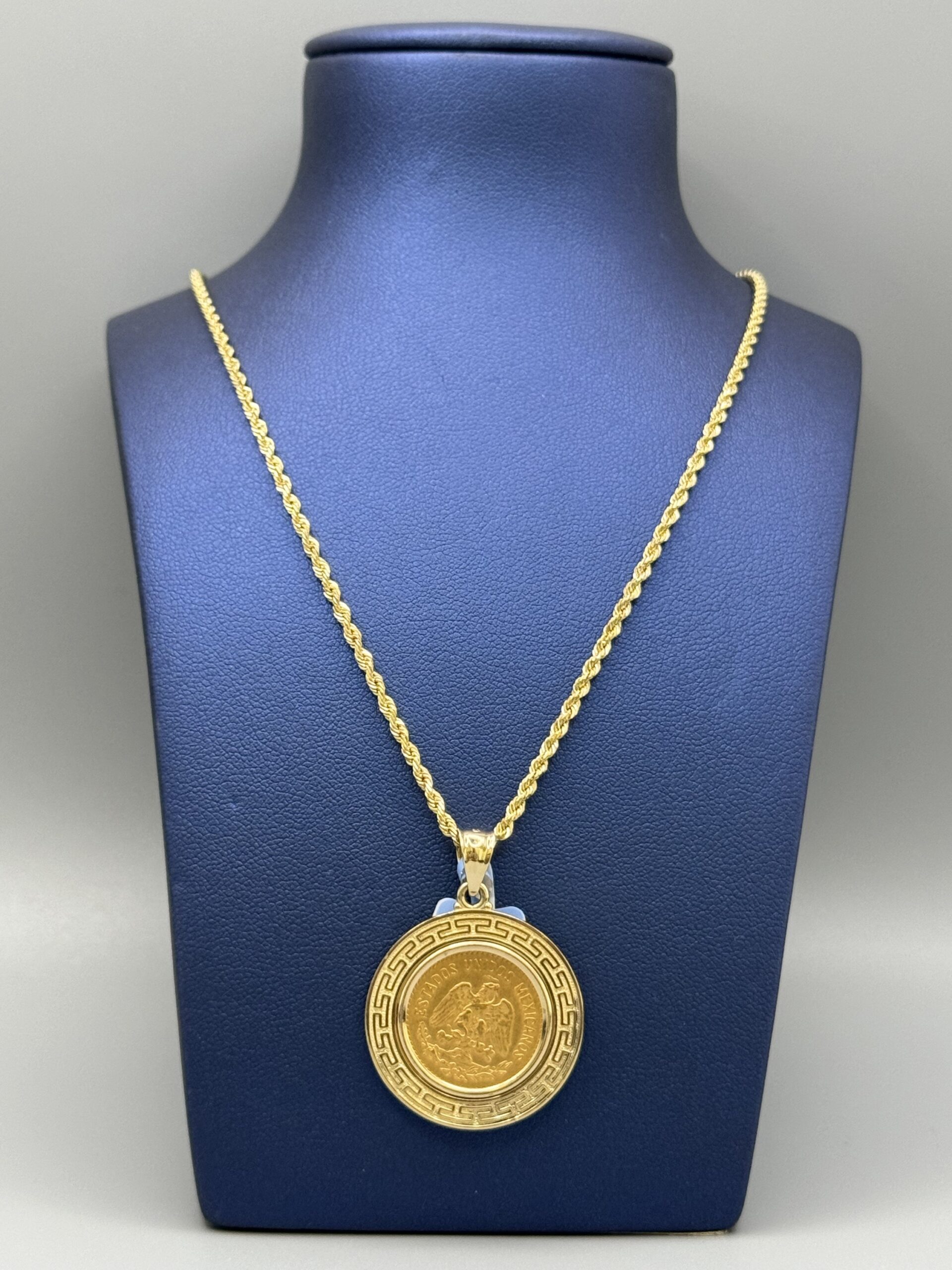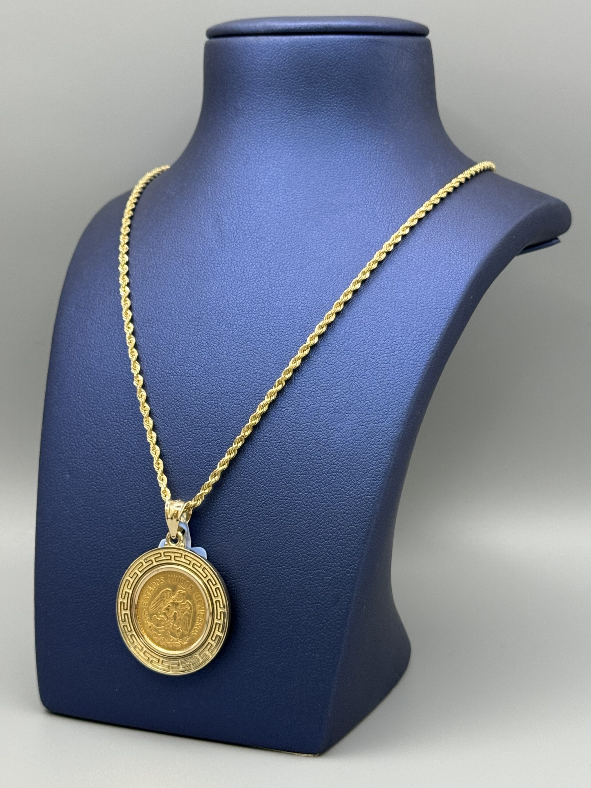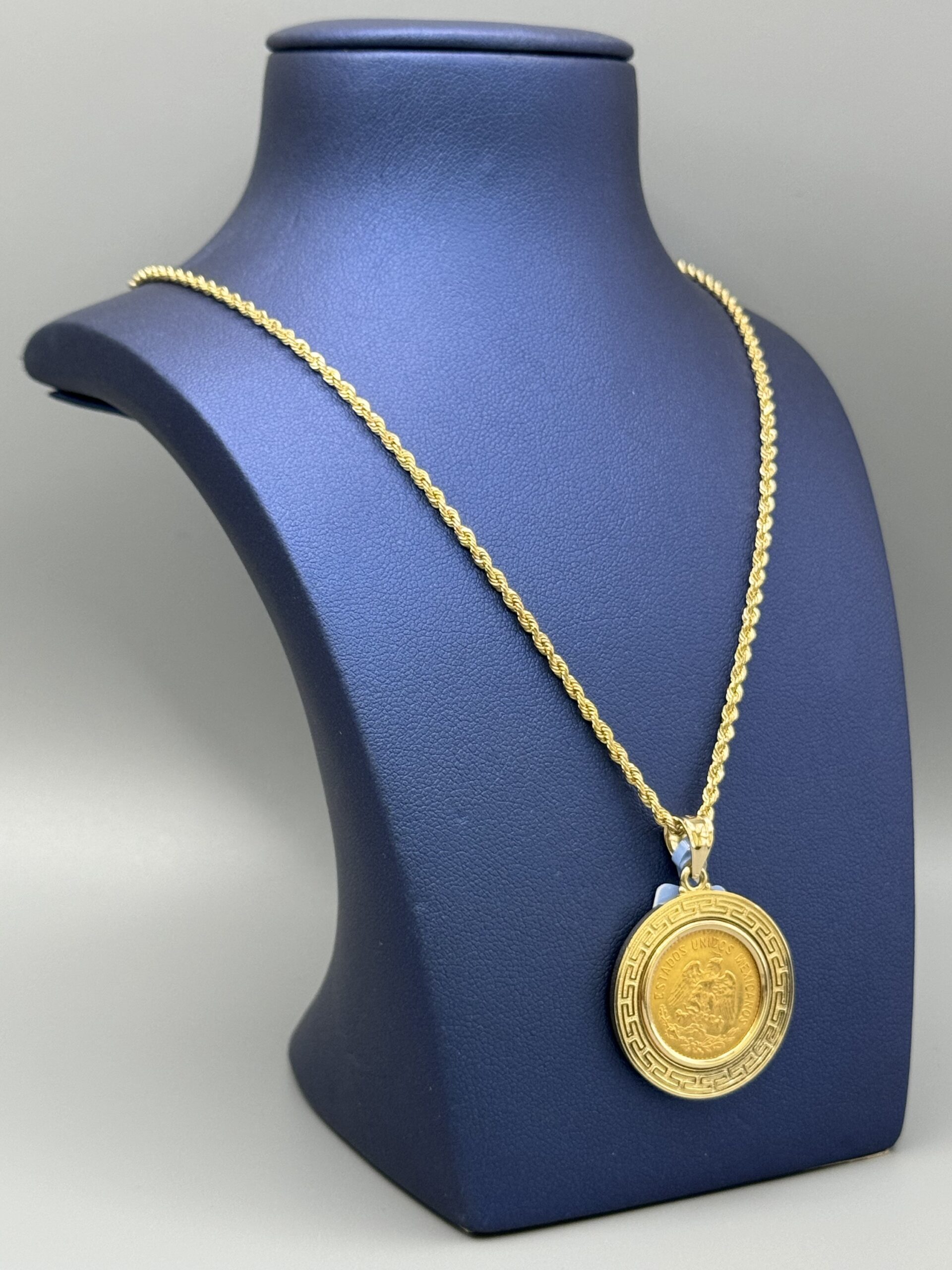 22KT Centenario 5 Pesos Coin ComboSet Sets In 14Kt Gold Bezel With 14KT Gold Rope Necklace 2MM 22″ Approx Golf Weight Of Necklace 8.1 Gram Pendant 1.1″ All Around By 1.5″ Tall Approx Gold Weight Of The Pendant Includes Bezel 8.8 Gram