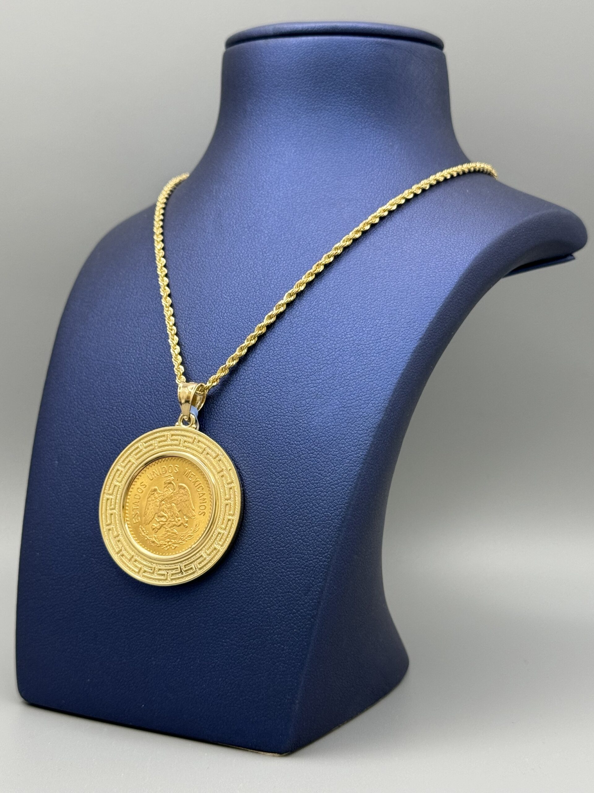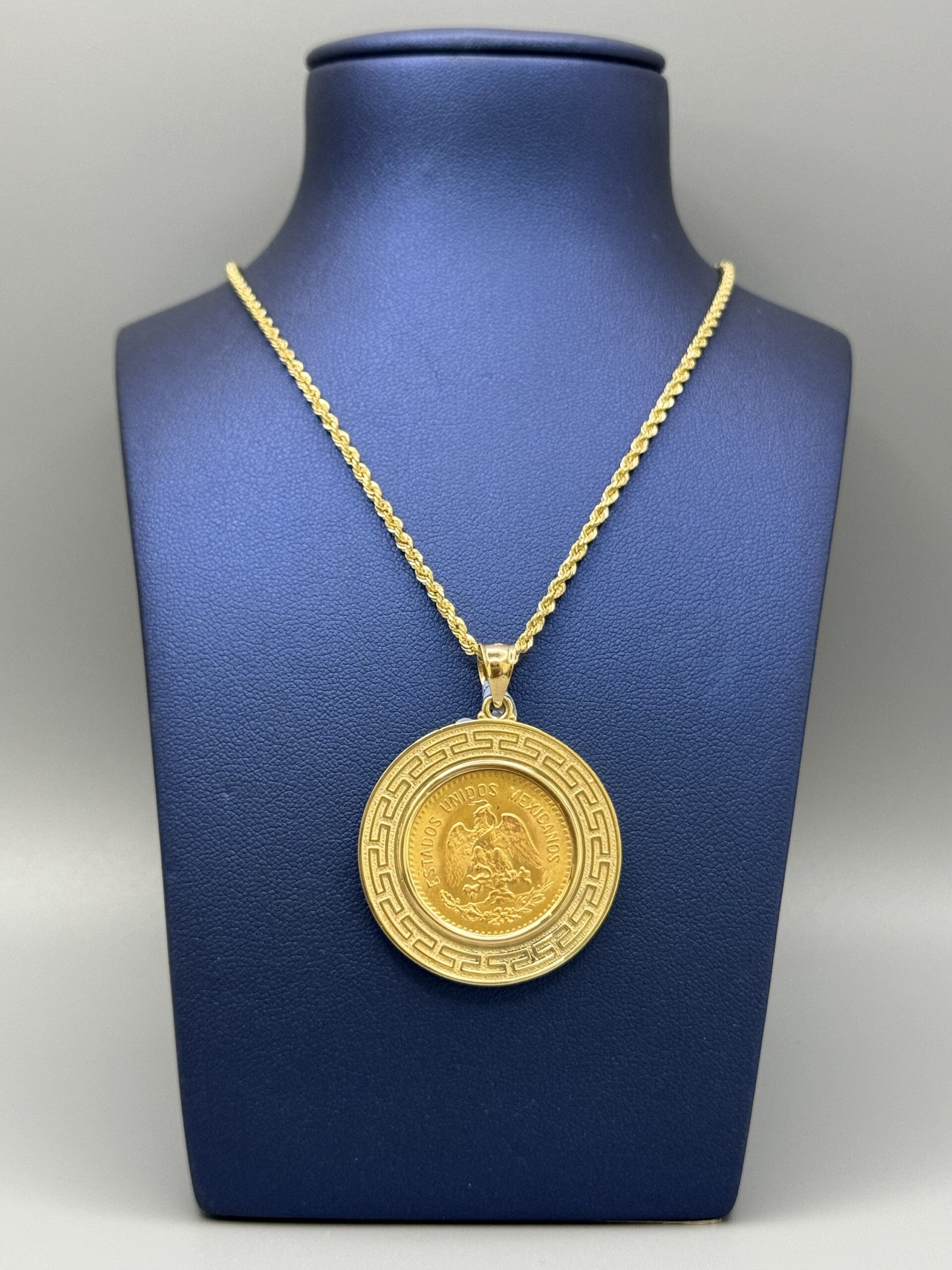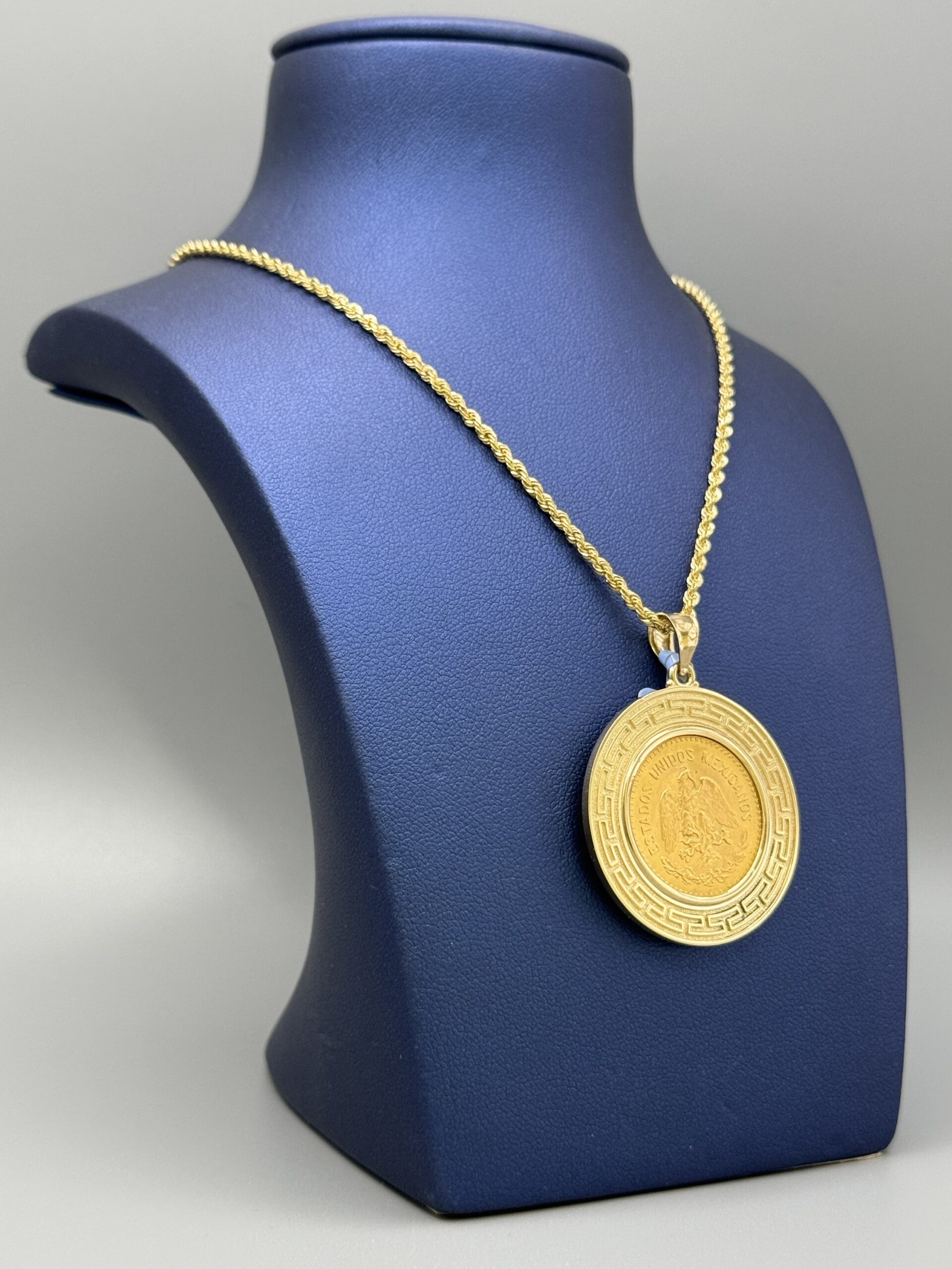 22KT Centenario 10 Pesos Coin ComboSet Sets In 14Kt Gold Bezel With 14KT Gold Rope Necklace 2MM 22″ Approx Golf Weight Of Necklace 8.1 Gram Pendant 1.5″ All Around By 1.75″ Tall Approx Gold Weight Of The Pendant Includes Bezel 15.5 Gram