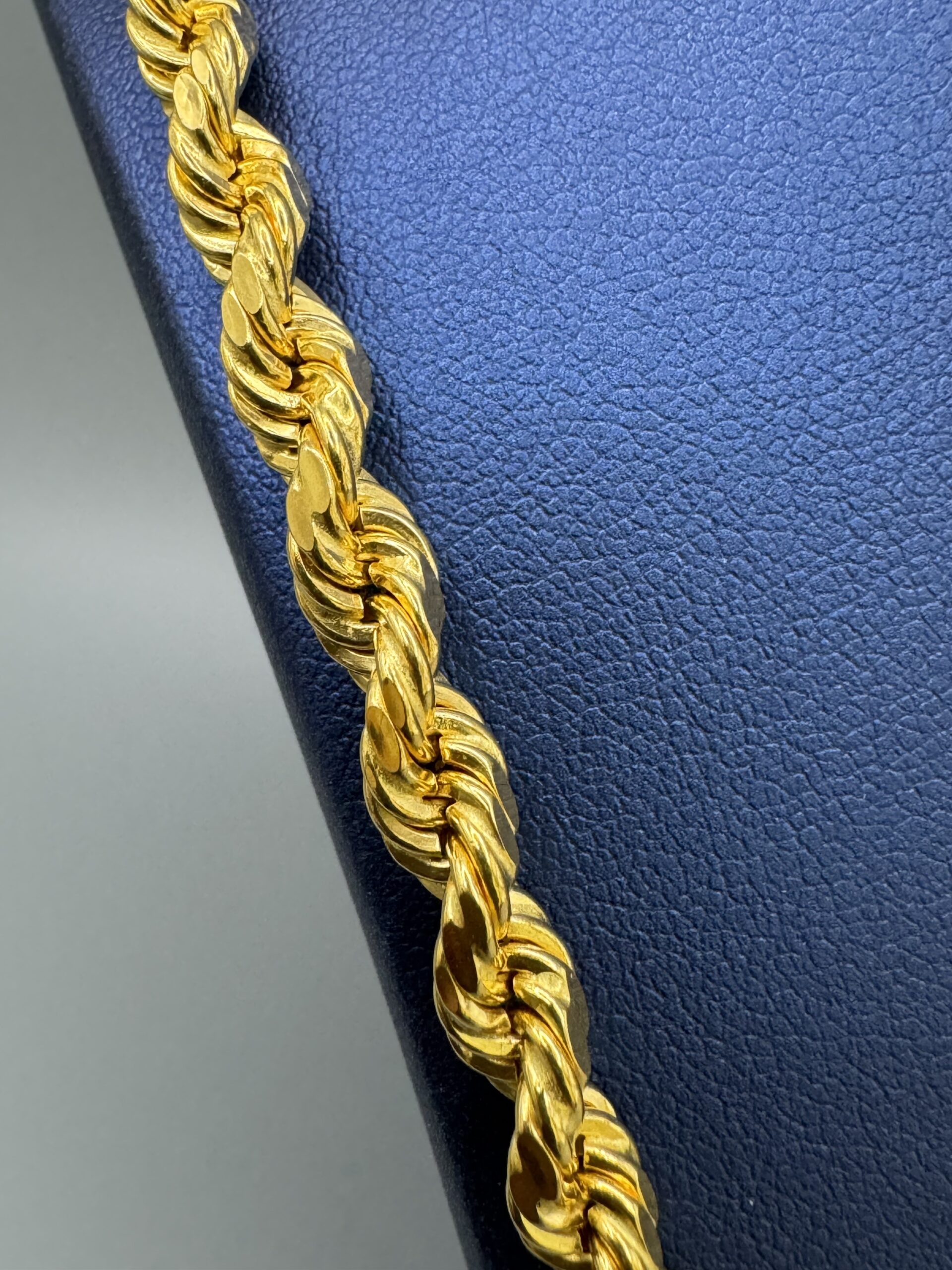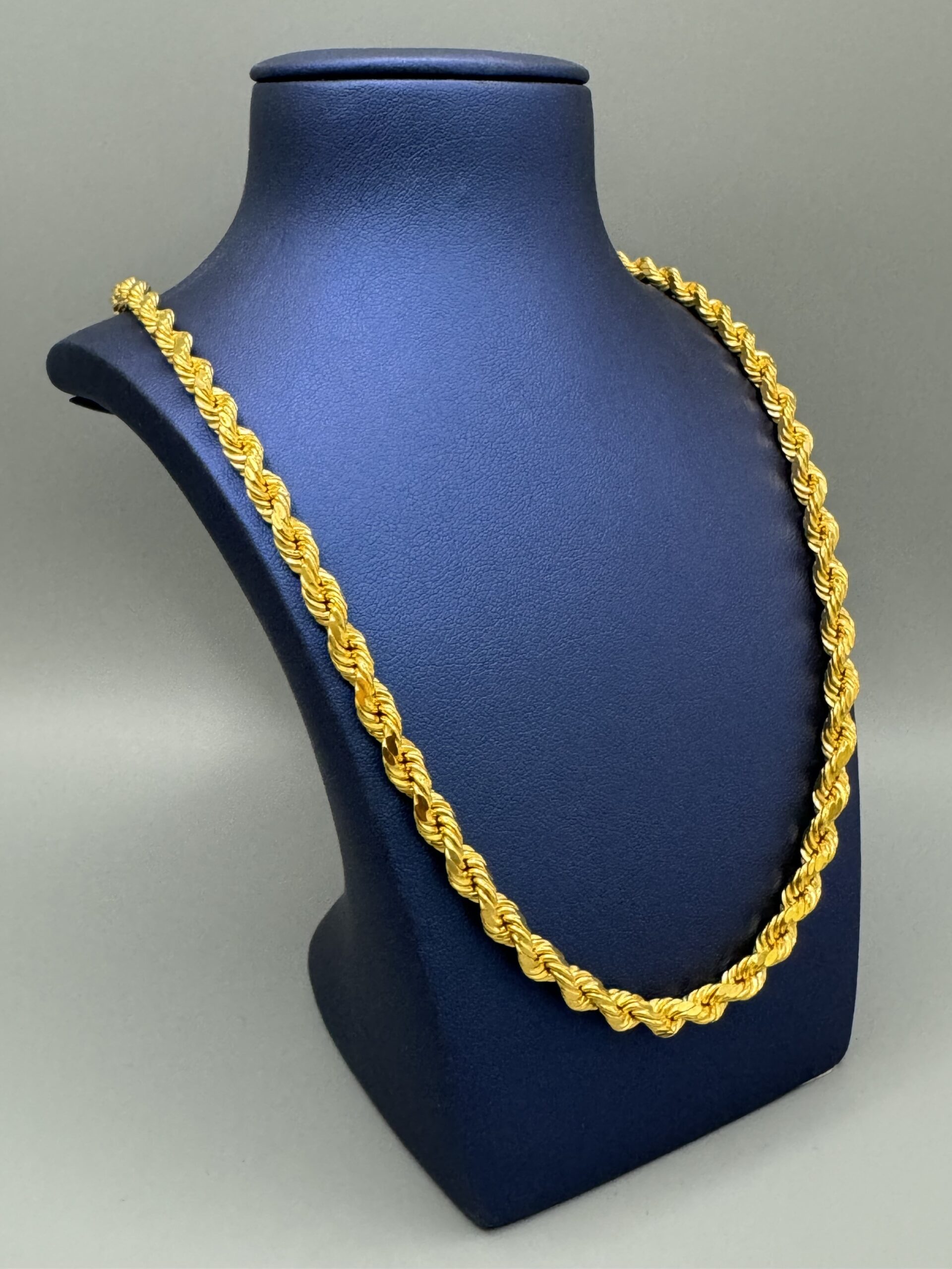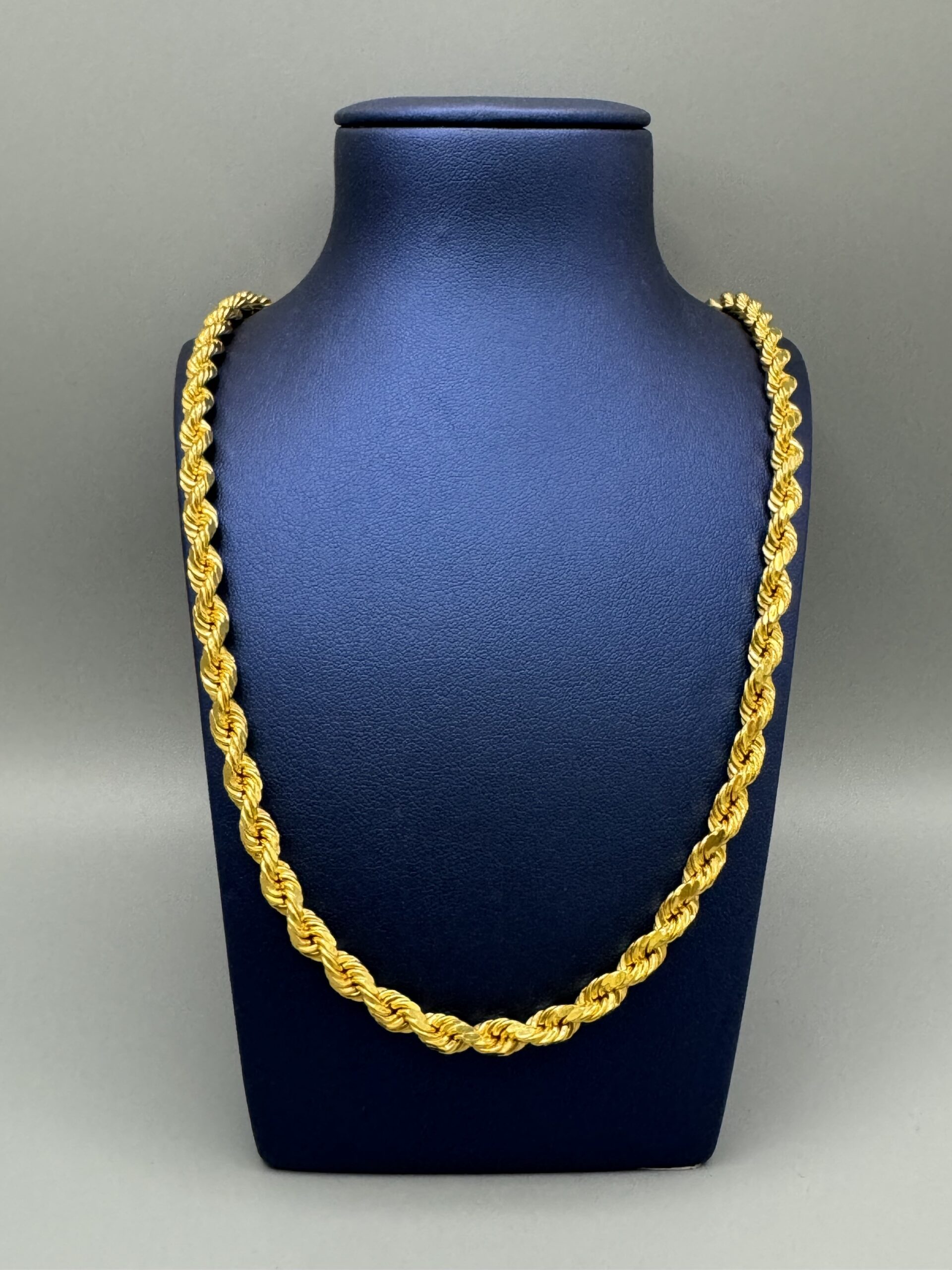 Adorn yourself with elegance through our 22KT Gold Solid Rope Necklace. Measuring 5.5MM and 22” long, it weighs approximately 33.6 grams. A dazzling piece that embodies pure investment beauty.
