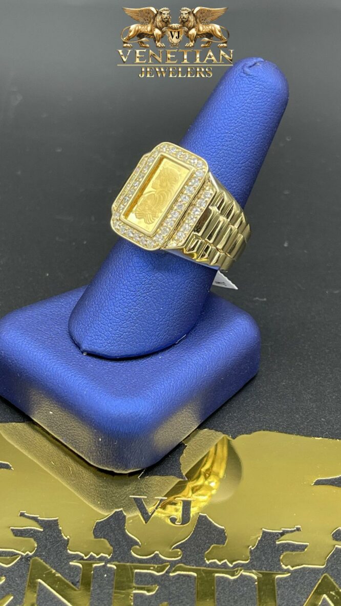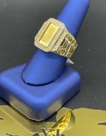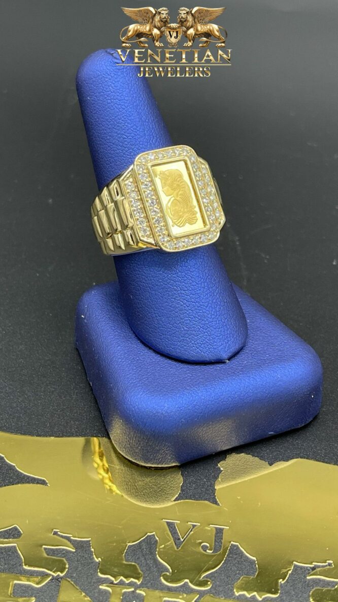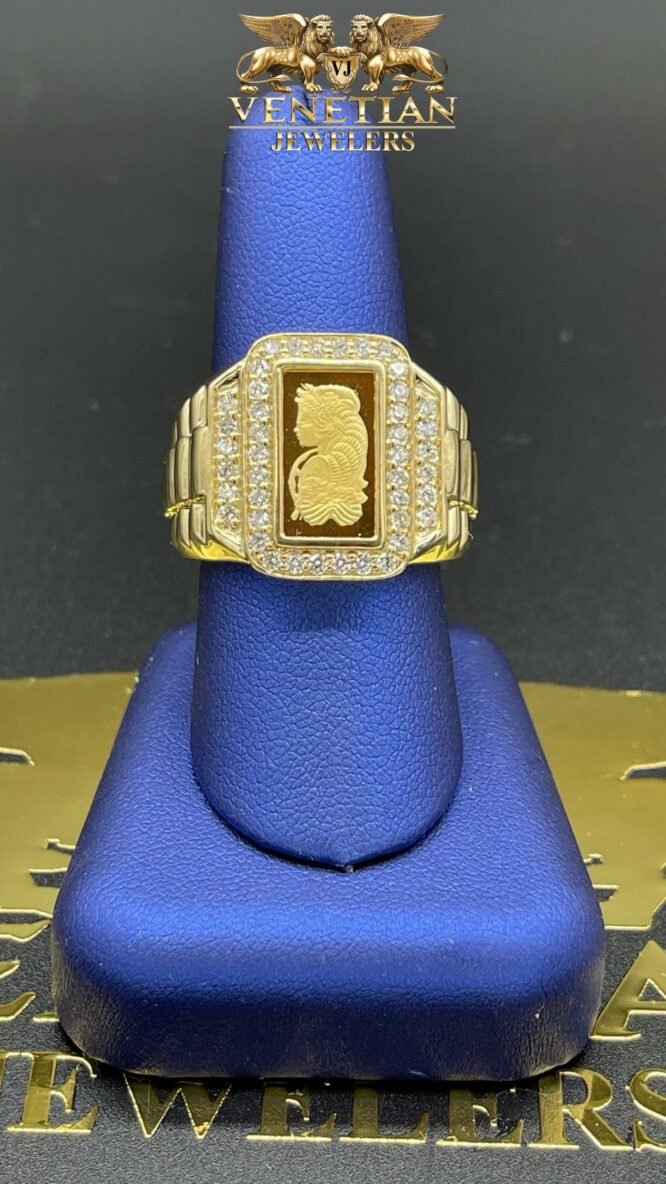 Real Diamond Custom ring casted in 24k and 14k Yellow Gold. This ring includes a solid 24k gold Pamp Suisse 1/5 Gram Gold bar in the center. This ring is made in 14k solid gold with 1ct of diamonds set in a prong setting. Engraved in the back are all original markings with a certificate number which will be unique for each peach. Each stone is a fully cut round brilliant stone, and are set very close to each order for an brilliant shine. Truly, one of a kind ring, its beauty cannot be concluded by the pictures.