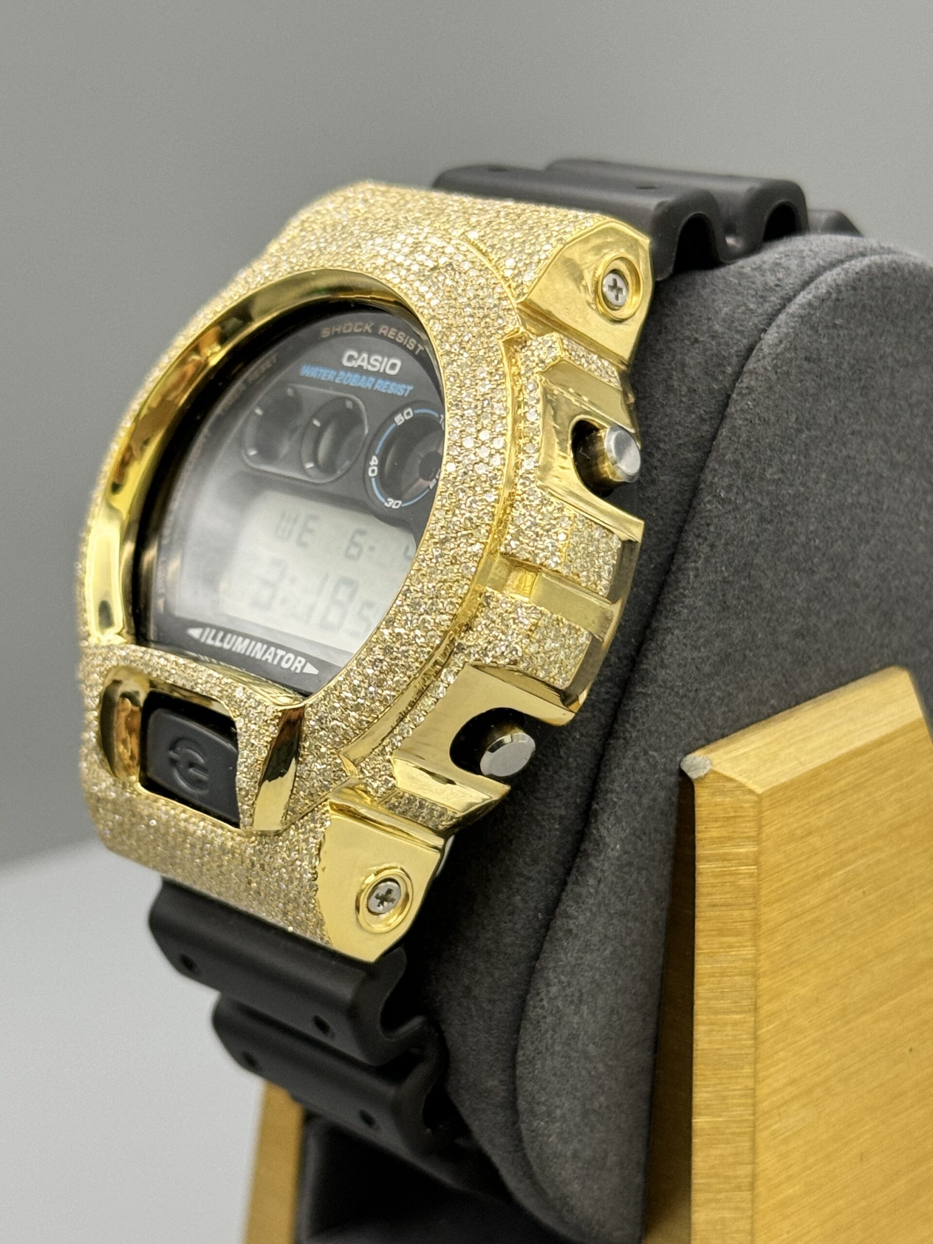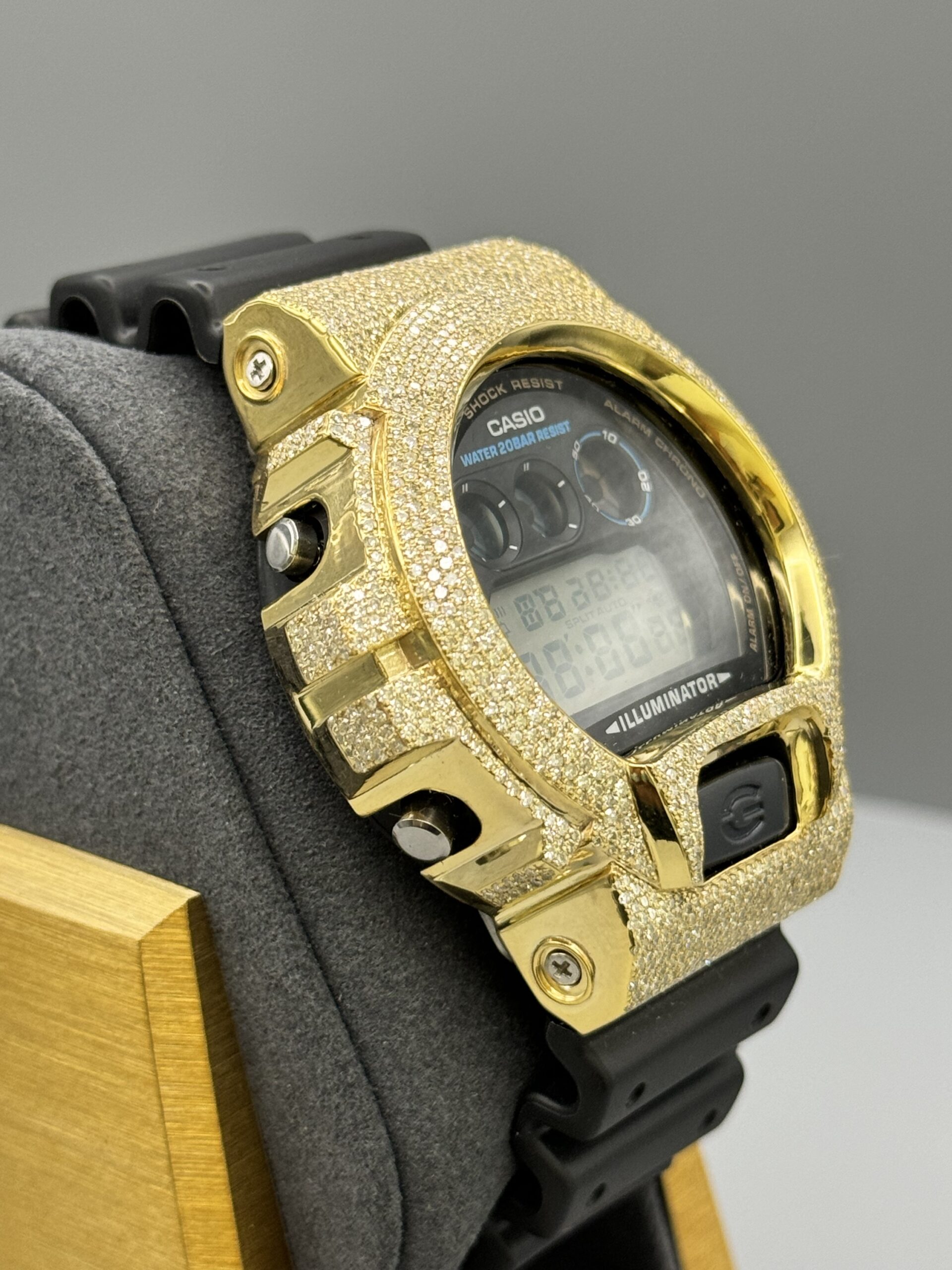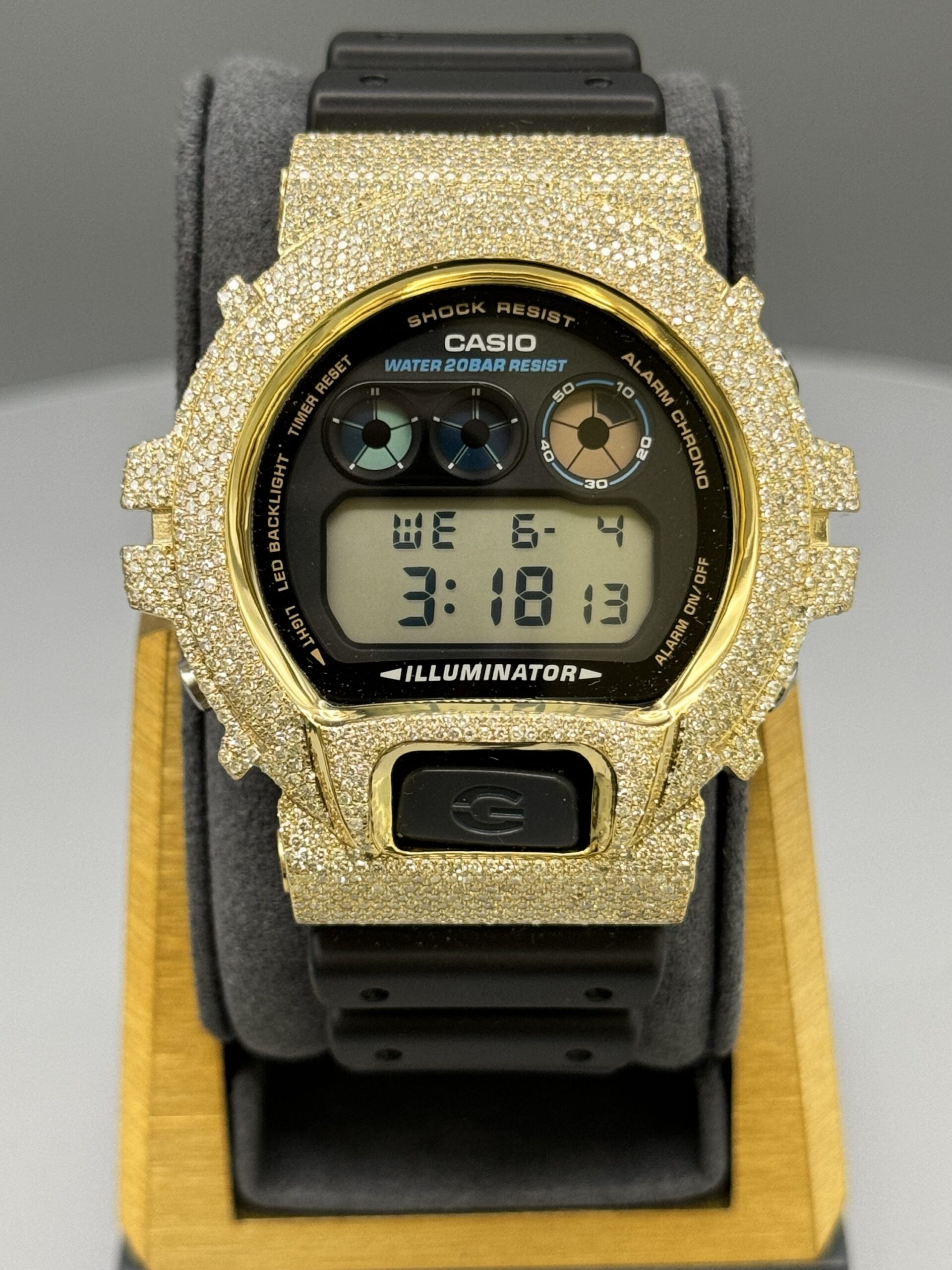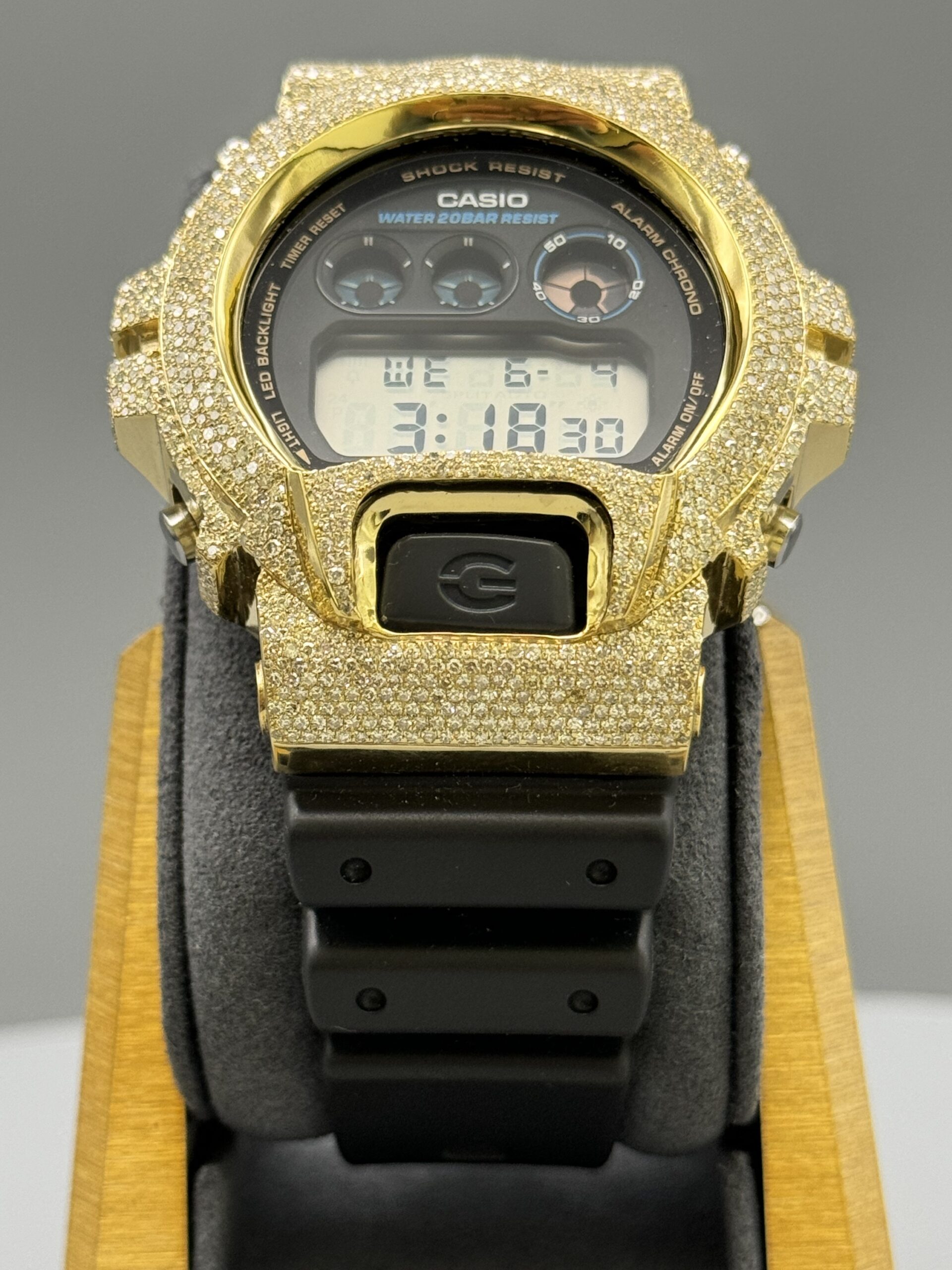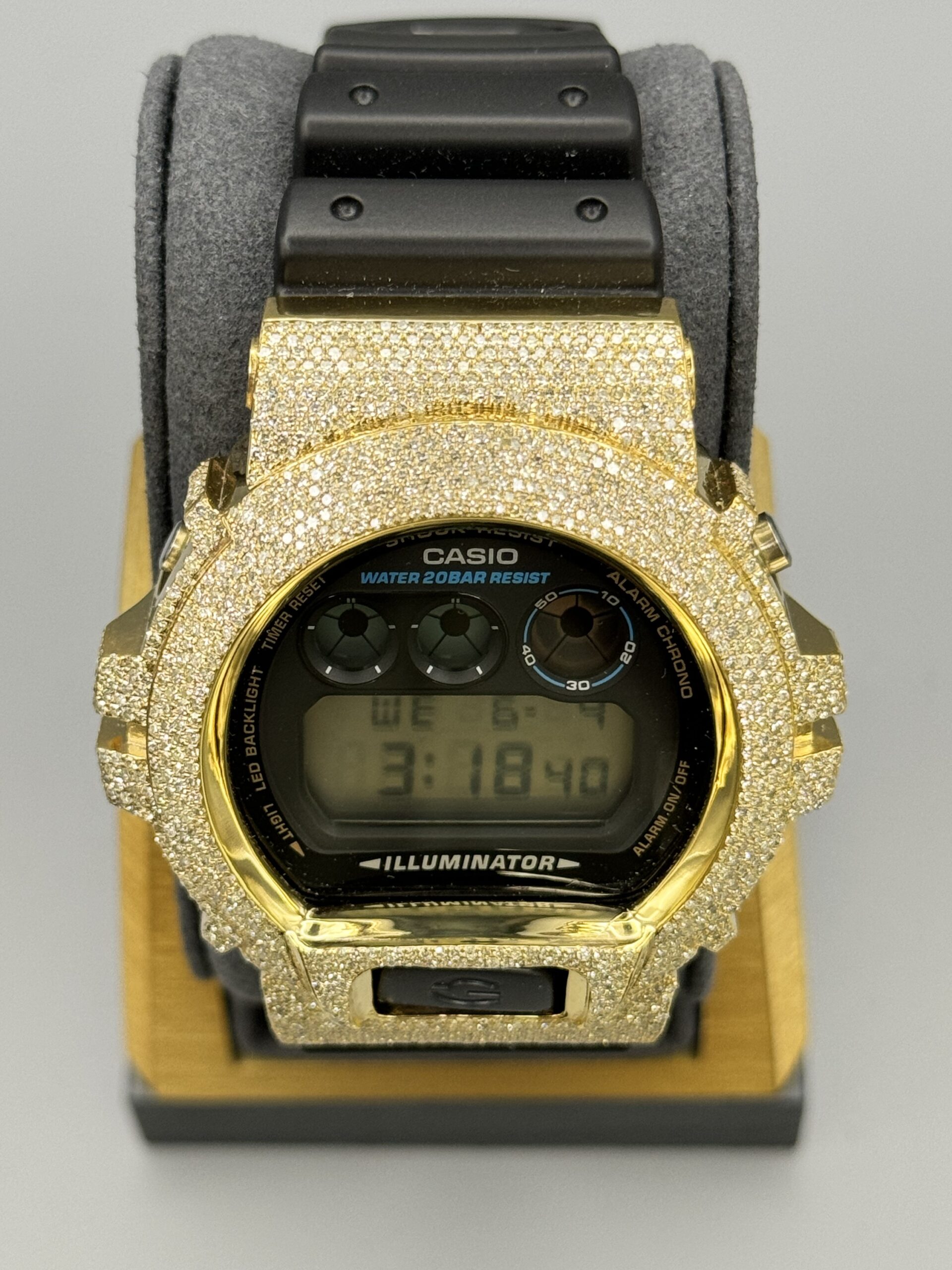 Elevate your style with the G-Shock DW6900U, featuring a striking gold tone and 4.60CT of Vvs clarity natural diamonds set in a unique honeycomb design. A bold accessory for any occasion.