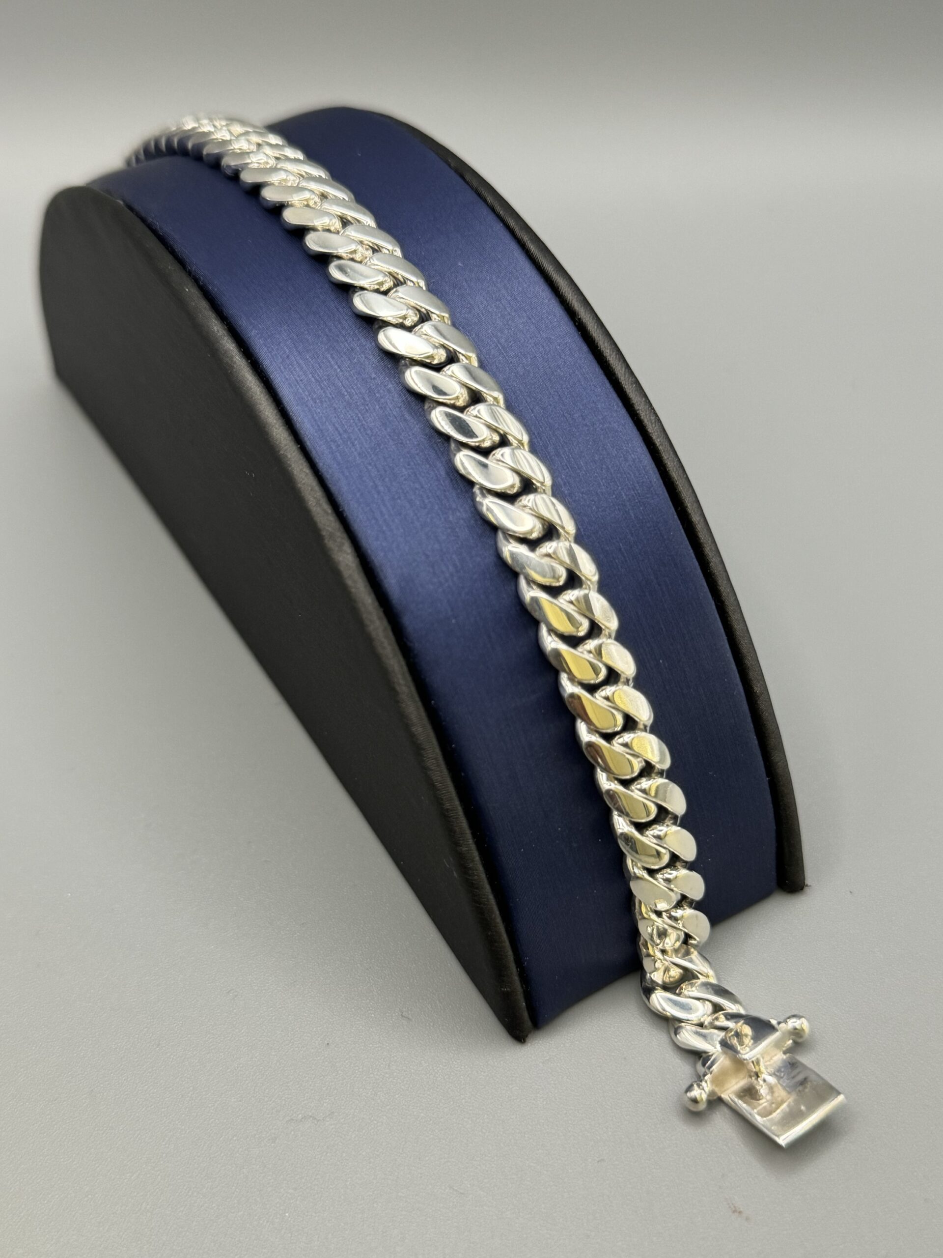 Elevate your style with this custom-made 10MM Pure Silver Miami Cuban Bracelet. At 8” long and weighing approximately 45.8 grams, it’s the perfect blend of elegance and craftsmanship.
